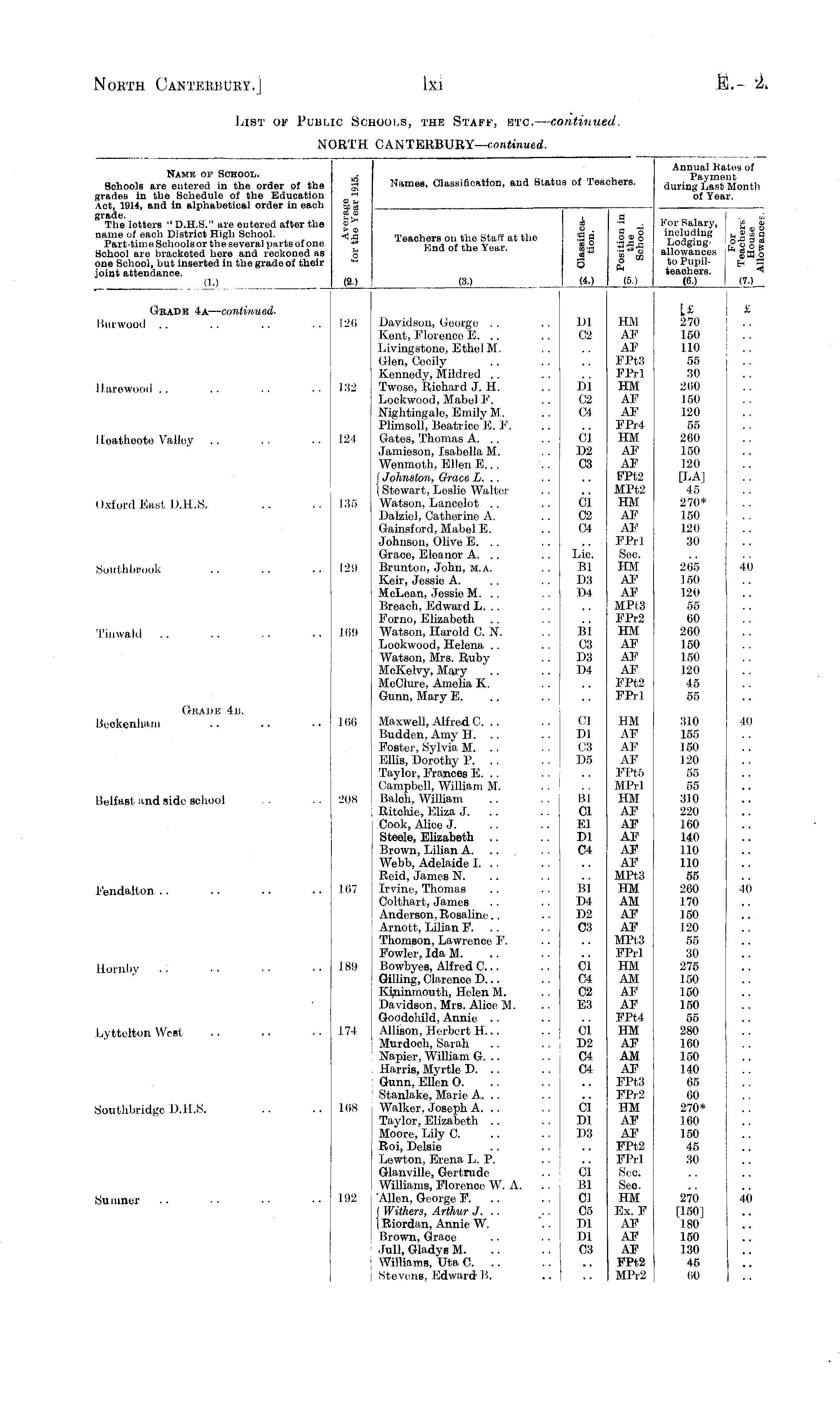 Name of School. Schools are entered in the order of the grades in the Schedule of the Education Act, 1914, and in alphabetical order in each grade. The letters " D.H.S." are entered after the name of each District High School. Parfc-tiuto Sohools or the several parts of one School are bracketed here and reckoned as one School, but inserted in the grade of their joint attendance. Ol rH e U oi a cd e 'S-h r* CO o Names, Classification, and Status of Tear thers. Annual Hates of Payment during Last Month of Year. Teachers on the Staff at tho End of the Year. (30 k ci . 3 a il 5 (4.) a a o 2 S ° ■3-9 .a g to Pa (5.) For Salary, '£ e including - M e g fl Lodging- :o|g=d allowances g CO o to Pupil- fn a! teachers. ■*! (6.) (70 (1.) (2.) Grade 4a — continued. Burwood llarewood I loathcote Valley 126 132 Davidson, George .. Kent, Florence E. .. Livingstone, Ethel M. Glen, Cooily Kennedy, Mildred .. Twose, Richard J. H. Lockwood, Mabel F. Nightingale, Emily M. Plimsoll, Beatrice E. F. Gates, Thomas A. .. Jamieson, Isabella M. Wenmoth, Ellen E... / Johnston, Grace L. .. ( Stewart, Leslie Walter Watson, Lancelot .. Dalzie), Catherine A. Gainst'ord, Mabel E. Johnson, Olive E. Graoe, Eleanor A. .. Brunton, John, m.a. Keir, Jessie A. McLean, Jessie M. Breach, Edward L. .. Forno, Elizabeth Watson, Harold C. N. Lockwood, Helena . . Watson, Mrs. Ruby M:cKelvy, Mary ' . . McClure, Amelia K. Gunn, Mary E. Dl C2 1)1 02 04 01 D2 C3 HM AF AF FPt3 FPrl HM -AF AF FPr4 HM AF AF FPt2 MPt2 HM AF AF FPrl Sec. HM AF AF MPt3 FPr2 HM AF AF AF FPt2 PPrl la 270 150 110 55 30 260 150 120 55 260 150 120 [LA] 45 270* 150 120 30 £ 124 Oxford East D.H.S. 135 CI 02 C4 Southbrook 129 Lie. Bl D3 1)4 265 150 120 55 60 260 150 150 120 45 55 40 Tinwald 169 Bl 03 1)3 D4 Grade 4b. Beokenham 100 Maxwell, Alfred C. .. Budden, Amy H. .. Foster, Sylvia M. . . Ellis, Dorothy P. . . Taylor, Frances E. .. Campbell, William M. Balch, William Ritchie, Eliza J. Cook, Alice J. Steele, Elizabeth .. Brown, Lilian A. Webb, Adelaide I. . . Reid, J ames N. Irvine, Thomas Colthart, James Anderson, Rosaline., Arnott, Lilian F. Thomson, Lawrence F. Fowler, Ida M. Bowbyes, Alfred C... Gilling, Clarence D... Kininmouth, Helen M. Davidson, Mrs. Alice M. Goadchild, Annie .. Allison, Herbert H... Murdoch, Sarah Napier, William G. .. Harris, Myrtle D. .. Gunn, Ellen O. Stanlake, Marie A.. .. Walker, Joseph A. .. Taylor, Elizabeth .. Moore, Lily 0. Roi, Delsie Lewton, Erona L. P. Glanville, Gertrude Williams, Florence W. A. 'Allen, George F. j Withers, Arthur J. .. \ Riordan, Annie W. Brown, Graoe .lull, Gladys M. Williams, Uta C. .. Stevens, Edward B. 01 Dl C3 D5 HM AF AF AF FPt6 MPrl HM AF AF AF AF AF MPt3 HM AM AF AF MP13 FPrl HM. AM AF AF FPt4 HM AF AM AF FPt3 FPr2 HM AF AF FPt,2 FPrl Seo. Seo. HM Ex. F AF AF AF FPt2 MPr2 310 150 100 120 05 55 310 220 160 140 110 110 55 260 170 150 120 55 30 276 150 150 150 55 280 160 100 140 60 (iO 270* 160 100 45 30 40 Belfast and side school 208 151 Cl El Dl C4 Fendalton 167 151 D4 D2 03 40 Hornby .. CI C4 02 E3 189 Lyttelton West 174 Cl D2 C4 C4 Southbridge D.H.S. 108 CI Dl D3 Su inner CI Bl 01 05 Dl Dl 03 270 [100] 180 150 130 45 60 40 192