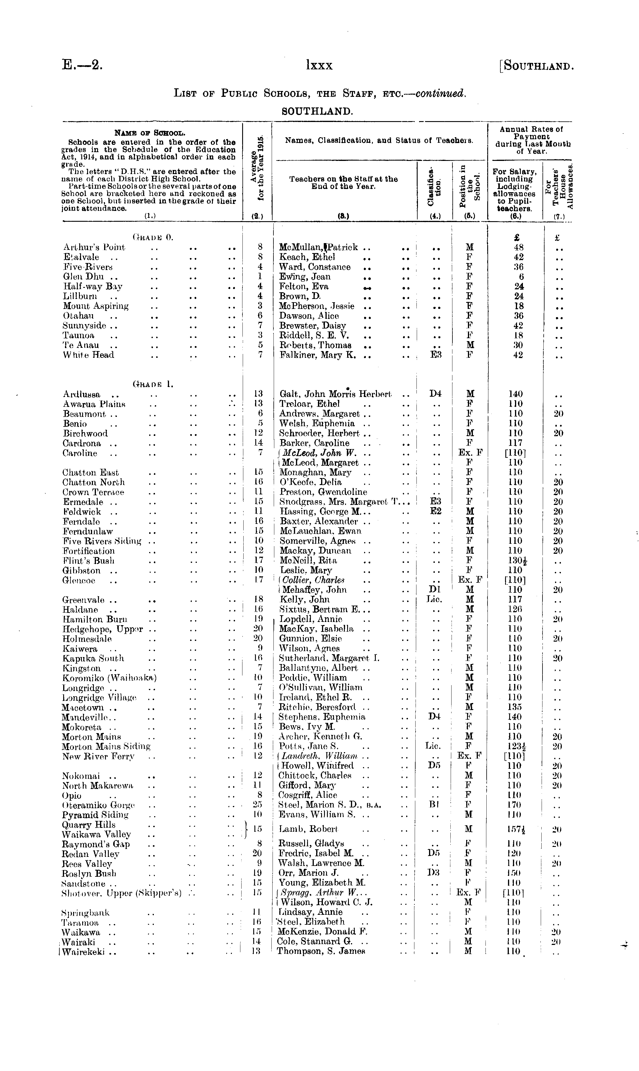 Namh of School. Schools are entered in the order of the ■rrades in the Schedule of the Education Act, 1914, and in alphabetical order in each grade. The letters "D.H.S." are entered after the name of each District High School. Part-time Sohools or the several parts of one School are bracketed here and reckoned as one School, but inserted in the grade ol their joint attendance. 1A Os e ri 8»|j ge e>r S " -8 h O Names, Classification, and Status of Teaohers. Annual Rates of Payment during Last Month of Year. Teaohers on the Staff at the End of the Year. (8) cd e Sa co o CO -n cd" 5 (4.) a Iii I & Pa (».) For Salary, "g including u co $ Lodging- o-g g allowances w gtri tO Pupil- p teachers. (60 (7.) (1.) (20 ( fRAllK 0. Arthur's Point Etalvale Five Rivers GlenDhu .. Half-way Bay Lillburn Mount, Aspiring Otahau Suunyside Taunoa Te Anau W tlite Heail I 8 McMullan,|Patriok .. 8 Keach, Ethel 4 Ward, Constance .. .. 1 Ewing, Joan .. 4 Fetton, Eva », .. 4 Brown, D .. 3 MoPherson, Jessie .. .. .. 6 Dawson, Alice .. .. .. 7 Brewster, Daisy .. .. ..I 3 Riddcll, S. E. V. .. .. | 5 Rebeits, Thomas .. .. ' 7 Palkiner, Mary K. .. 8 8 I 1 4 4 3 6 7 3 5 7 M F F .. [ F F F F F F F M Ell j F £ 48 42 30 0 24 24 18 36 42 18 30 42 £ Grape 1. Ardlussa Awarua Plains Beaumont, Benin Birohwood Cardrona, Caroline Ohatton East Chatton North Crown Terrace Ermoelale Felelwick Ferndale .. Forndunlaw Five Rivers Skiing Fortification Flint's Bush Gi bbston Gleneoe Greenvale .. .. Haldane Hamilton Burn Hetlgehope, Upper Holmosdale Kaiwera Kapuka South Kingston Koromiko (Waihoaka) Longridge Longridge Village .. Mtcetown .. Mandevillo. . Mokoreta Morion Mains Morton Mains Siding Mew River Ferry Nokomai .. North Makarewa Opio Oteramiko Gorge Pyramid Siding Quarry Hills Waikawa Valley Raymond's Gap Redan Valley Rees Valley .. -.. Roslyn Bush Sandstone Shot over. Upper (Skipper's) .'. Springbank Taramoa Waikawa Wairaki Wairekeki 13 Gait, John Morris Herbert, .. 13 Treloar, Ethel .. .. j 6 Andrews, Margaret .. .. , 5 Welsh, Euphemia .. 12 Schroeeler, Herbert .. 14 Barker, Caroline .. 7 l McLeod, John W. .. .. t I McLeod. Margaret .. .. 16 Monaghan, Mary .. .. j 16 O'Keofe. Delia ' .. .. j 11 Preston, Gwendoline .. : 15 Snodgrass, Mrs. Margaret T.., .. ; 11 | Hassing, George M... .. I 16 | Baxter, Alexander .. .. 15 I McLauchlan. Ewan .. ; . * I 10 Somerville, Agnes .. .. I .. ] 12 I Mackay, Duncan .. .. .. ! 17 MoNoill, Rita .. .. .. 10 Leslie. Mary .. 17 ■ I Collier, Charles .. .. I I Mehaffey. John 18 Kelly. John .. : 1.0 Sixtus, Bertram E. ■. 19 Loptlell, Annie 20 MacKay. Isabella 20 Gunnion, Elsie 9 Wilson, Agnes 10 Sutherland, Margaret I. 7 Ballantyne, Albert, .. 10 Peddie, William .. .. i .. 7 O'Sullit'au, William 10 Ireland, Ethel K ■■ ■ ■ 7 Ritchie, Beresford ■ ■ I 14 Stephens, Euphemia .. | 15 Bews. Ivv M. .. .19 Archer, Kenneth G. .. 16 | Potts, Jane S. .. 12 j Landreth, William .. I Howell, Winifred 12 Ohittook, Charles 11 Gilford. Mary 8 Oosgriff, Alice 25 Steel, Marion S. D., b.a. 10 Evans. William S. .. [ 15 Lamb, Robert 8 ; Russell, Gladys 20 Fredric, Isabel M. . . 9 Walsh, Lawrence M. .. : 1.9 Orr, Marion J. .. I 15 Young. Elizabeth M. .. I 15 J Spragg, Arthur W. ■ ■ I Wilson, Howard 0. J. 11 Lindsay, Annie 16 'Steel, Elizabeth 15 ! McKenzie, Donald P. 14 I Colo, Stannard G. .. 13 Thompson, S. James .. i D4 M F F F M F Ex. F F F F F E3 F E2 M M M F M F F .. ! Ex. F Dl M Lie. M M • • i 1 v .. ! F .. i F F F M M M F M D4 : F F M Lie. | F .. I Ex. F D5 F M F F 151 F M M F D6 F M 1)3 F F .. Ex. F M F F M M .. I M 140 110 110 110 no 117 [HOI no no uo no uo no no no no i io 130,1 110 [110] 110 1.17 126 no 1.1.0 110 1.10 no no no no no 135 140 110 110 123-i [110] uo 110 no no 170 no 20 20 20 20 20 20 20 20 20 20 20 20 I 20 i 20 20 20 ■ 20 20 20 167-J 20 lio 120 110 150 no I no | no no no no no no ! 20 2(1 20 20