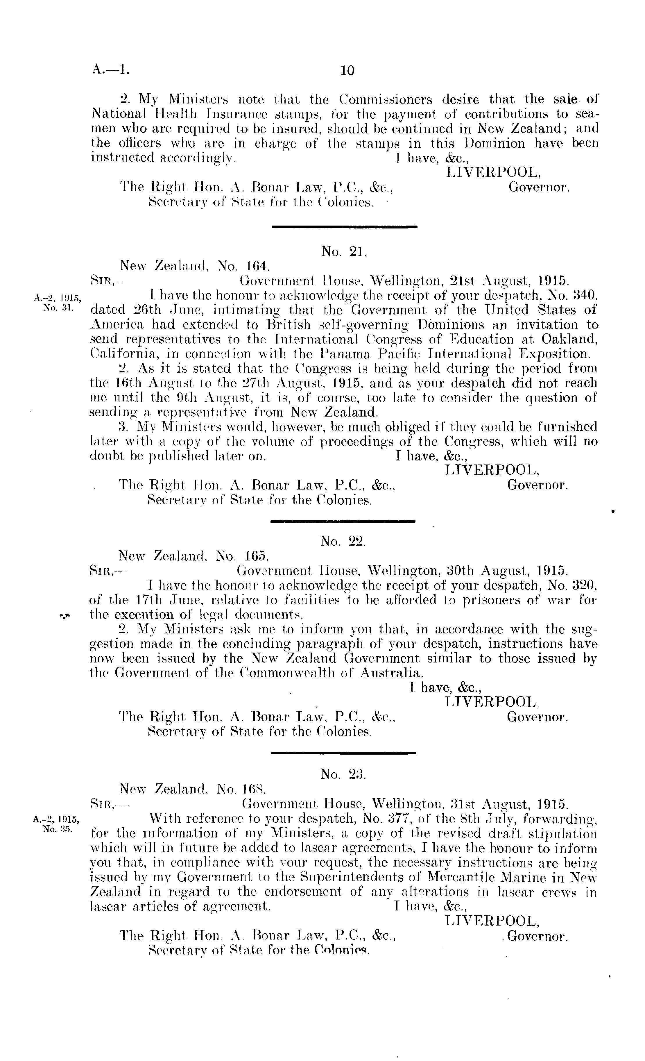 No. 23. New Zealand, No. 168. Sir, — Government House, Wellington, 31st August, 1915. With reference to your despatch, No. 377, of the Bth July, forwarding, for the information of my Ministers, a copy of the revised draft stipulation which will in future be added to lascar agreements, I have the honour to inform you that, in compliance with your request, the necessary instructions are being issued by my Government to the Superintendents of Mercantile Marine in New Zealand in regard to the endorsement of any alterations in lascar crews in lascar articles of agreement. I have, &c, LIVERPOOL, The Right Hon. A. Bonar Law, P.C., &c, Governor. Secretary of State for the Colonies.