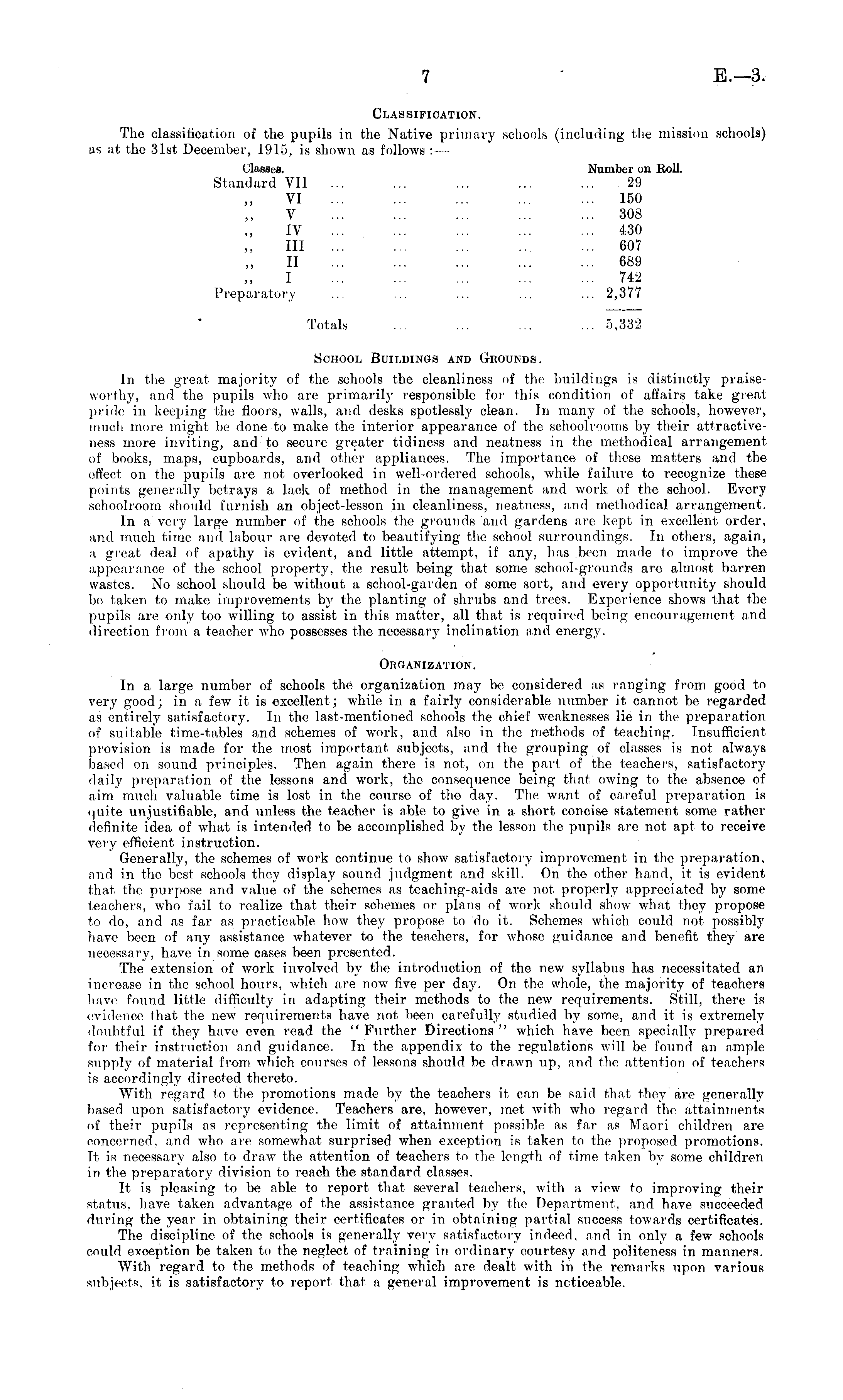 Classification. The classification of the pupils in the Native primary schools (including the mission schools) as at the 31st December, 1915, is shown as follows :— Classes. Number on Roll. Standard VII ... ... ... ... ... 29 VI ... ... ... ... ... 150 V ... ... ... ... ... 308 IV ... ... ... ... ... 430 111 ... ... ... ... ... 607 II ... ... ... ... ... 689 I 742 Preparatory ... ... ... ... ... 2,377 Totals ... ... ... ... 5,332 School Buildings and Grounds. In the great majority of the schools the cleanliness of the buildings is distinctly praiseworthy, and the pupils who are primarily responsible for this condition of affairs take greal pride in keeping the floors, walls, and desks spotlessly clean. In many of the schools, however, much more might be done to make the interior appearance of the schoolrooms by their attractiveness more inviting, and to secure greater tidiness and neatness in the methodical arrangement of books, maps, cupboards, and other appliances. The importance of these matters and the effect on the pupils are not overlooked in well-ordered schools, while failure to recognize these points generally betrays a lack of method in the management and work of the school. Every schoolroom should furnish an object-lesson in cleanliness, neatness, and methodical arrangement. In a very large number of the schools the grounds and gardens are kept in excellent order, and much time and labour are devoted to beautifying the school surroundings. In others, again, a great deal of apathy is evident, and little attempt, if any, has been made to improve the appearance of the school property, the result being that some school-grounds are almost barren wastes. No school should be without a school-garden of some sort, and every opportunity should be taken to make improvements by the planting of shrubs and trees. Experience shows that the pupils are only too willing to assist in this matter, all that is required being encouragement and direction from a teacher who possesses the necessary inclination and energy. Organization. In a large number of schools the organization may be considered as ranging from good to very good; in a few it is excellent; while in a fairly considerable number it cannot be regarded as entirely satisfactory. In the last-mentioned schools the chief weaknesses lie in the preparation of suitable time-tables and schemes of work, and also in the methods of teaching. Insufficient provision is made for the most important subjects, and the grouping of classes is not always based on sound principles. Then again there is not, on the part of the teachers, satisfactory daily preparation of the lessons and work, the consequence being that owing to the absence of aim much valuable time is lost in the course of the da}'. The want of careful preparation is quite unjustifiable, and unless the teacher is able to give in a short concise statement some rather definite idea of what is intended to be accomplished by the lesson the pupils are not apt to receive very efficient instruction. Generally, the schemes of work continue to show satisfactory improvement in the preparation, and in the best schools they display sound judgment and skill. On the other hand, it, is evident that the purpose and value of the schemes as teaching-aids are not properly appreciated by some teachers, who fail to realize that their schemes or plans of work should show what they propose to do, and as far as practicable how they propose to do it. Schemes which could not possibly have been of any assistance whatever to the teachers, for whose guidance and benefit they are necessary, have in some cases been presented. The extension of work involved by the introduction of the new syllabus has necessitated an increase in the school hours, which are now five per day. On the whole, the majority of teachers have found little difficulty in adapting their methods to the new requirements. Still, there is evidence that the new requii'ements have not been carefully studied by some, and it is extremely doubtful if they have even read the " Further Directions " which have been specially prepared for their instruction and guidance. In the appendix to the regulations will be found an ample supply of material from which courses of lessons should be drawn up, and the attention of teachers is accordingly directed thereto. With regard to the promotions made by the teachers it can be said that they are generally based upon, satisfactory evidence. Teachers are, however, met with who regard the attainments of their pupils as representing the limit of attainment possible as far as Maori children are concerned, and who are somewhat surprised when exception is taken to the proposed promotions. It is necessary also to draw the attention of teachers to the length of time taken by some children in the preparatory division to reach the standard classes. It is pleasing to be able to report that several teachers, with a view to improving their status, have taken advantage of the assistance granted by the Department, and have succeeded during the year in obtaining their certificates or in obtaining partial success towards certificates. The discipline of the schools is generally very satisfactory indeed, and in only a few schools could exception be taken to the neglect of training in ordinary courtesy and politeness in manners. With regard to the methods of teaching which are dealt with in the remarks upon various subjects, it is satisfactory to report that a general improvement is noticeable.