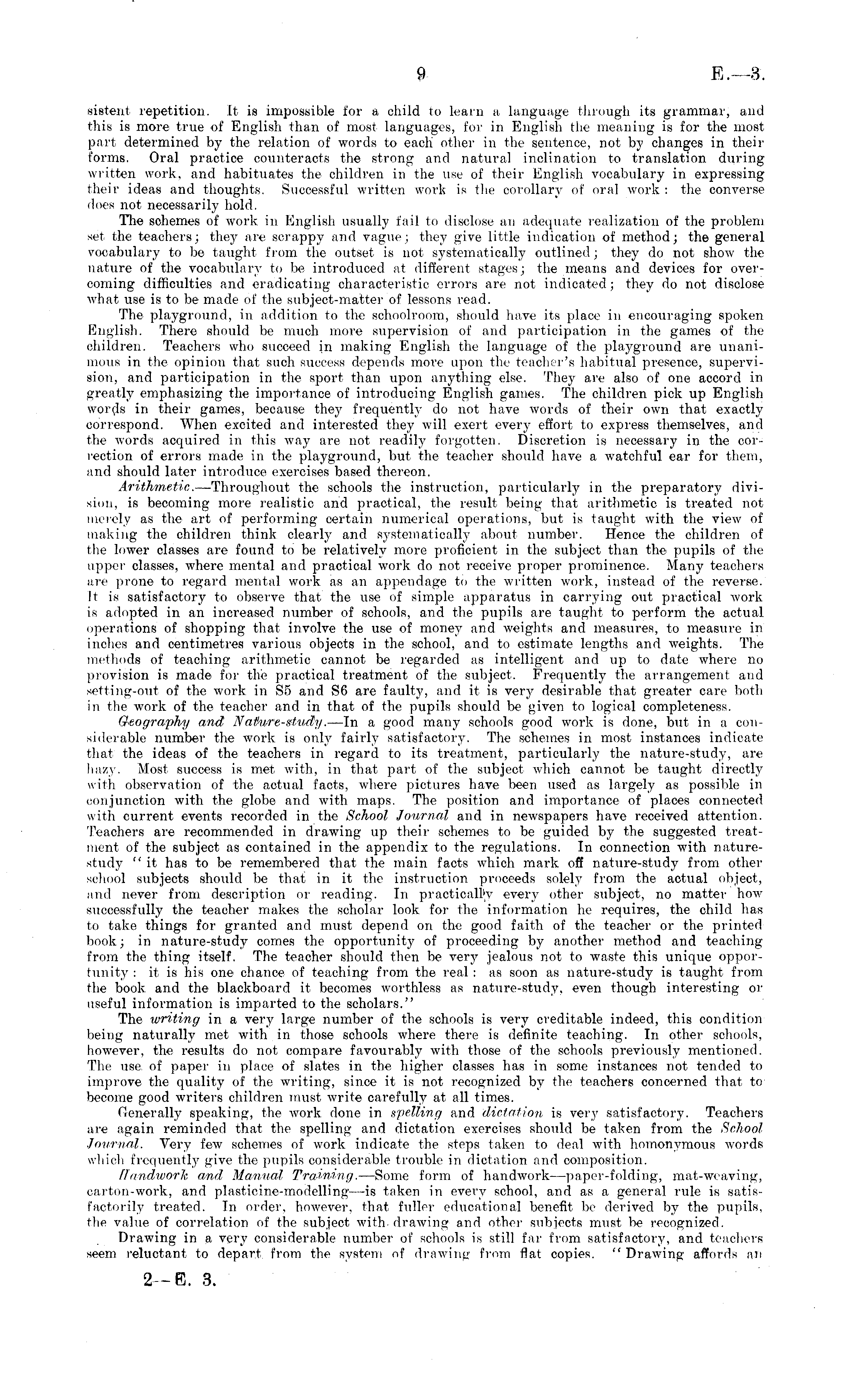 sistent repetition. It is impossible for a child to learn a language through its grammar, and this is more true of English than of most languages, for in English the meaning is for the most part determined by the relation of words to each other in the sentence, not by changes in their forms. Oral practice counteracts the strong and natural inclination to translation during written work, and habituates the children in the use of their English vocabulary in expressing their ideas and thoughts. Successful written work is the corollary of oral work : the converse does not necessarily hold. The schemes of work in English usually fail to disclose an adequate realization of the problem set the teachers; they are scrappy and vague; they give little indication of method; the general vocabulary to be taught from the outset is not systematically outlined; they do not show the nature of the vocabulary to be introduced at different stages; the means and devices for overcoming difficulties and eradicating characteristic errors are not indicated; they do not disclose what use is to be made of the subject-matter of lessons read. The playground, in addition to the schoolroom, should have its place in encouraging spoken English. There should be much more supervision of and participation in the games of the children. Teachers who succeed in making English the language of the playground are unanimous in the opinion that such success depends more upon the teacher's habitual presence, supervision, and participation in the sport than upon anything else. They are also of one accord in greatly emphasizing the importance of introducing English games. The children pick up English words in their games, because they frequently do not have words of their own that exactly correspond. When excited and interested they will exert every effort to express themselves, and the words acquired in this way are not readily forgotten. Discretion is necessary in the correction of errors made in the playground, but the teacher should have a watchful ear for them, and should later introduce exercises based thereon. Arithmetic. —Throughout the schools the instruction, particularly in the preparatory division, is becoming more realistic and practical, the result being that arithmetic is treated not merely as the art of performing certain numerical operations, but is taught with the view of making the children think clearly and systematically about number. Hence the children of the lower classes are found to be relatively more proficient in the subject than the pupils of the upper classes, where mental and practical work do not receive proper prominence. Many teachers are prone to regard mental work as an appendage to the written work, instead of the reverse. It is satisfactory to observe that the use of simple apparatus in carrying out practical work is adopted in an increased number of schools, and the pupils are taught to perform the actual operations of shopping that involve the use of money and weights and measures, to measure in inches and centimetres various objects in the school, and to estimate lengths and weights. The methods of teaching arithmetic cannot be regarded as intelligent and up to date where no provision is made for the practical treatment of the subject. Frequently the arrangement and setting-out of the work in S5 and S6 are faulty, and it is very desirable that greater care both in the work of the teacher and in that of the pupils should be given to logical completeness. Geography and N atwre-study. —ln a good many schools good work is done, but in a considerable number the work, is only fairly satisfactory. The schemes in most instances indicate that the ideas of the teachers in regard to its treatment, particularly the nature-study, are hazy. Most success is met with, in that part of the subject which cannot be taught directly with observation of the actual facts, where pictures have been used as largely as possible in conjunction with the globe and with maps. The position and importance of places connected with current events recorded in the School Journal, and in newspapers have received attention. Teachers are recommended in drawing up their schemes to be guided by the suggested treatment of the subject as contained in the appendix to the regulations. In connection with naturestudy " it has to be remembered that the main facts which mark off nature-study from other school subjects should be that in it the instruction proceeds solely from the actual object, and never from description or reading. In practically every other subject, no matter how successfully the teacher makes the scholar look for the information he requires, the child has to take things for granted and must depend on the good faith of the teacher or the printed book; in nature-study comes the opportunity of proceeding by another method and teaching from the thing itself. The teacher should then be very jealous not to waste this unique opportunity : it is his one chance of teaching from the real : as soon as nature-study is taught from the book, and the blackboard it becomes worthless as nature-study, even though interesting or useful information is imparted to the scholars." The writing in a very large number of the schools is very creditable indeed, this condition being naturally met with in those schools where there is definite teaching. In other schools, however, the results do not compare favourably with those of the schools previously mentioned. The use, of paper in place of slates in the higher classes has in some instances not tended to improve the quality of the writing, since it is not recognized by the teachers concerned that to become good writers children must write carefully at all times. Generally speaking, the work done in spelling and dictation is very satisfactory. Teachers are again reminded that the spelling and dictation exercises should be taken from the School Journal. Very few schemes of work indicate the steps taken