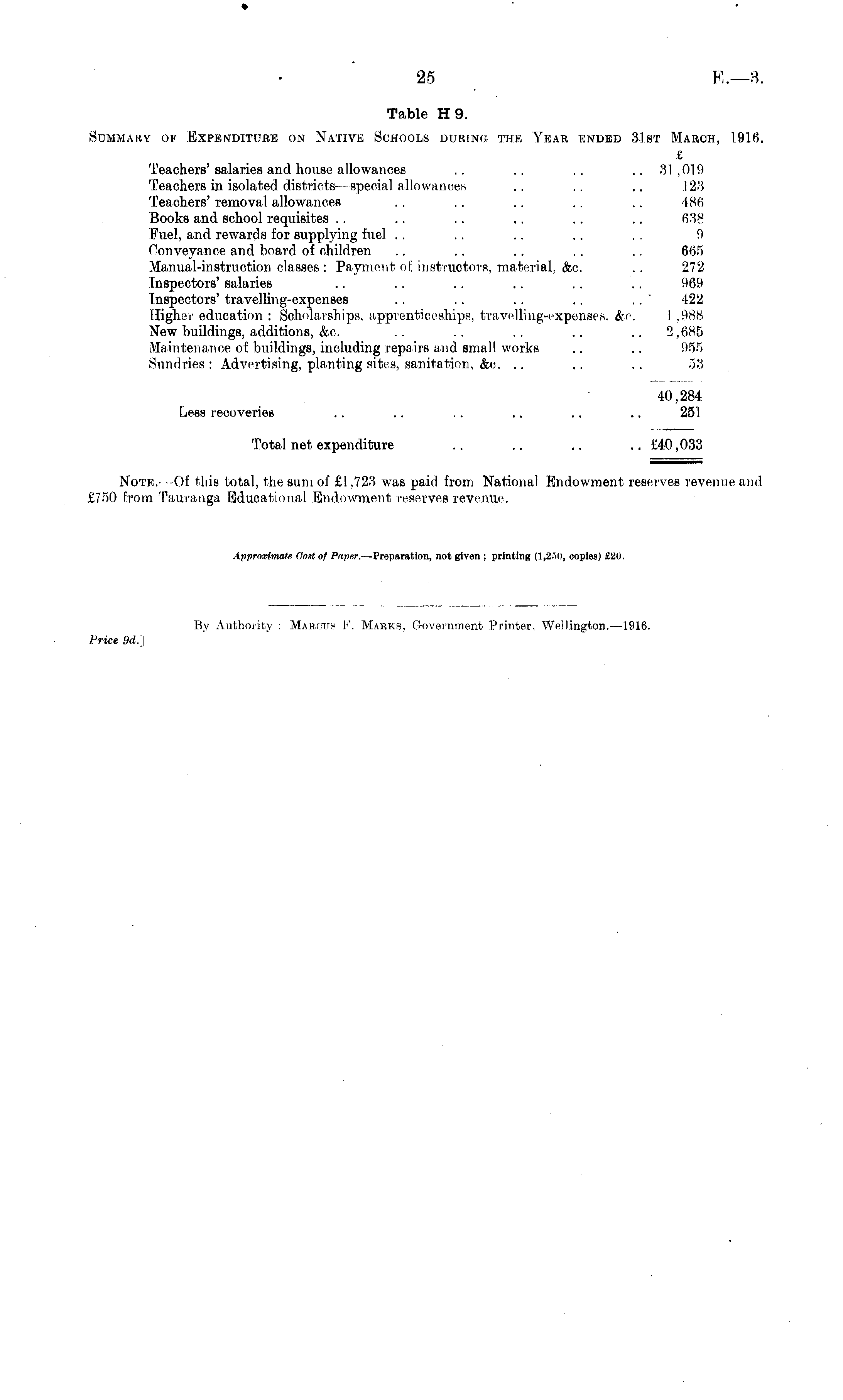 Table H 9. Summary of Expenditure on Native Schools during the Year ended 31st March, 1916. £ Teachers'salaries and house allowances .. .. .. .. 31,019 Teachers in isolated districts- special allowances .. .. .. 123 Teachers'removal allowances .. .. .. .. .. 486 Books and school requisites .. .. .. .. .. .. 638 Fuel, and rewards for supplying fuel .. .. .. .. .. 9 Conveyance and board of children .. .. .. .. .. 665 Manual-instruction classes : Payment of instructors, material, &o. .. 272 Inspectors' salaries .. .. .. .. .. .. 969 Inspectors' travelling-expenses .. .. .. .. .. " 422 Higher education : Scholarships, apprenticeships, travelling-expenses. &e. I ,988 New buildings, additions, &c. .. .. .. .. .. 2,685 Maintenance of buildings, including repairs and small works .. .. 955 Sundries: Advertising, planting sites, sanitation, &c. .. .. .. 53 40,284 Less recoveries .. .. .. .. .. .. 251 Total net expenditure .. .. .. .. £40,033 Note.- -Of this total, the sum of £1,723 was paid from National Endowment reserves revenue and £750 from Tauranga Educational Endowment reserves revenue.