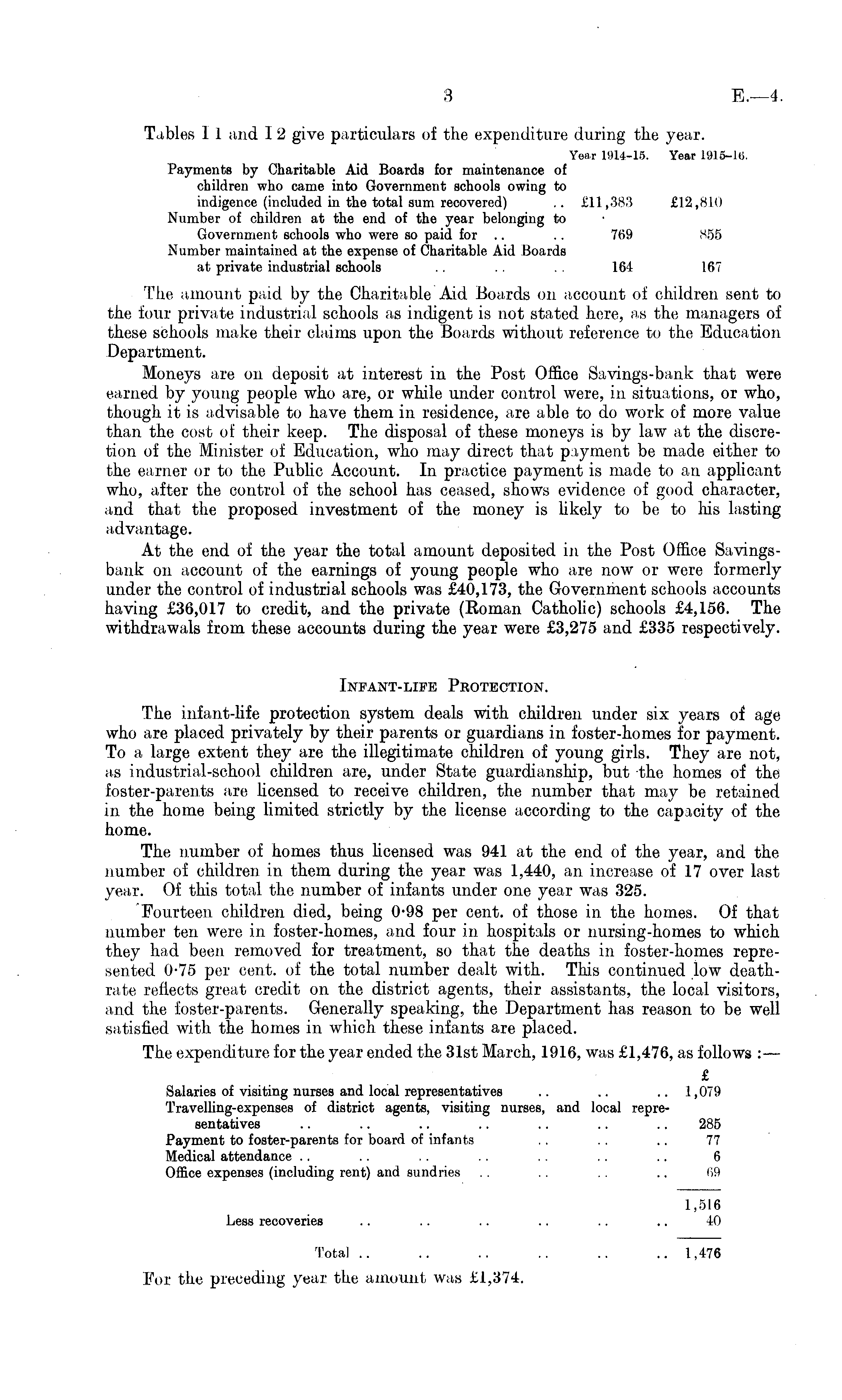 Tables I 1 and I 2 give particulars of the expenditure during the year. Year 1914-15. Year 1915-16. Payments by Charitable Aid Boards for maintenance of children who came into Government schools owing to indigence (included in the total sum recovered) .. £11,383 £12,810 Number of children at the end of the year belonging to Government schools who were so paid for .. .. 769 855 Number maintained at the expense of Charitable Aid Boards at private industrial schools .. 164 167 The amount paid by the Charitable Aid Boards on account of children sent to the four private industrial schools as indigent is not stated here, as the managers of these schools make their claims upon the Boards without reference to the Education Department. Moneys are on deposit at interest in the Post Office Savings-bank that were earned by young people who are, or while under control were, in situations, or who, though it is advisable to have them in residence, are able to do work of more value than the cost of their keep. The disposal of these moneys is by law at the discretion of the Minister of Education, who may direct that payment be made either to the earner or to the Public Account. In practice payment is made to an applicant who, after the control of the school has ceased, shows evidence of good character, and that the proposed investment of the money is likely to be to his lasting advantage. At the end of the year the total amount deposited in the Post Office Savingsbank on account of the earnings of young people who are now or were formerly under the control of industrial schools was £40,173, the Government schools accounts having £36,017 to credit, and the private (Roman Catholic) schools £4,156. The withdrawals from these accounts during the year were £3,275 and £335 respectively. Infant-life Protection. The infant-life protection system deals with children under six years of age who are placed privately by their parents or guardians in foster-homes for payment. To a large extent they are the illegitimate children of young girls. They are not, as industrial-school children are, under State guardianship, but the homes of the foster-parents are licensed to receive children, the number that may be retained in the home being limited strictly by the license according to the capacity of the home. The number of homes thus licensed was 941 at the end of the year, and the number of children in them during the year was 1,440, an increase of 17 over last year. Of this total the number of infants under one year was 325. Fourteen children died, being 0-98 per cent, of those in the homes. Of that number ten were in foster-homes, and four in hospitals or nursing-homes to which they had been removed for treatment, so that the deaths in foster-homes represented 0-75 per cent, of the total number dealt with. This continued low deathrate reflects great credit on the district agents, their assistants, the local visitors, and the foster-parents. Generally speaking, the Department has reason to be Well satisfied with the homes in which these infants are placed. The expenditure for the year ended the 31st March, 1916, was £1,476, as follows :— £ Salaries of visiting nurses and local representatives .. .. .. 1,079 Travelling-expenses of district agents, visiting nurses, and local representatives .. .. .. .. .. .. .. 285 Payment to foster-parents for board of infants .. .. .. 77 Medical attendance .. .. .. .. .. .. 6 Office expenses (including rent) and sundries .. .. . . .. 09 1,516 Less recoveries .. .. .. .. .. .. 40 Total .. .. .. .. .. .. 1,476 For the preceding year the amount was £1,374.