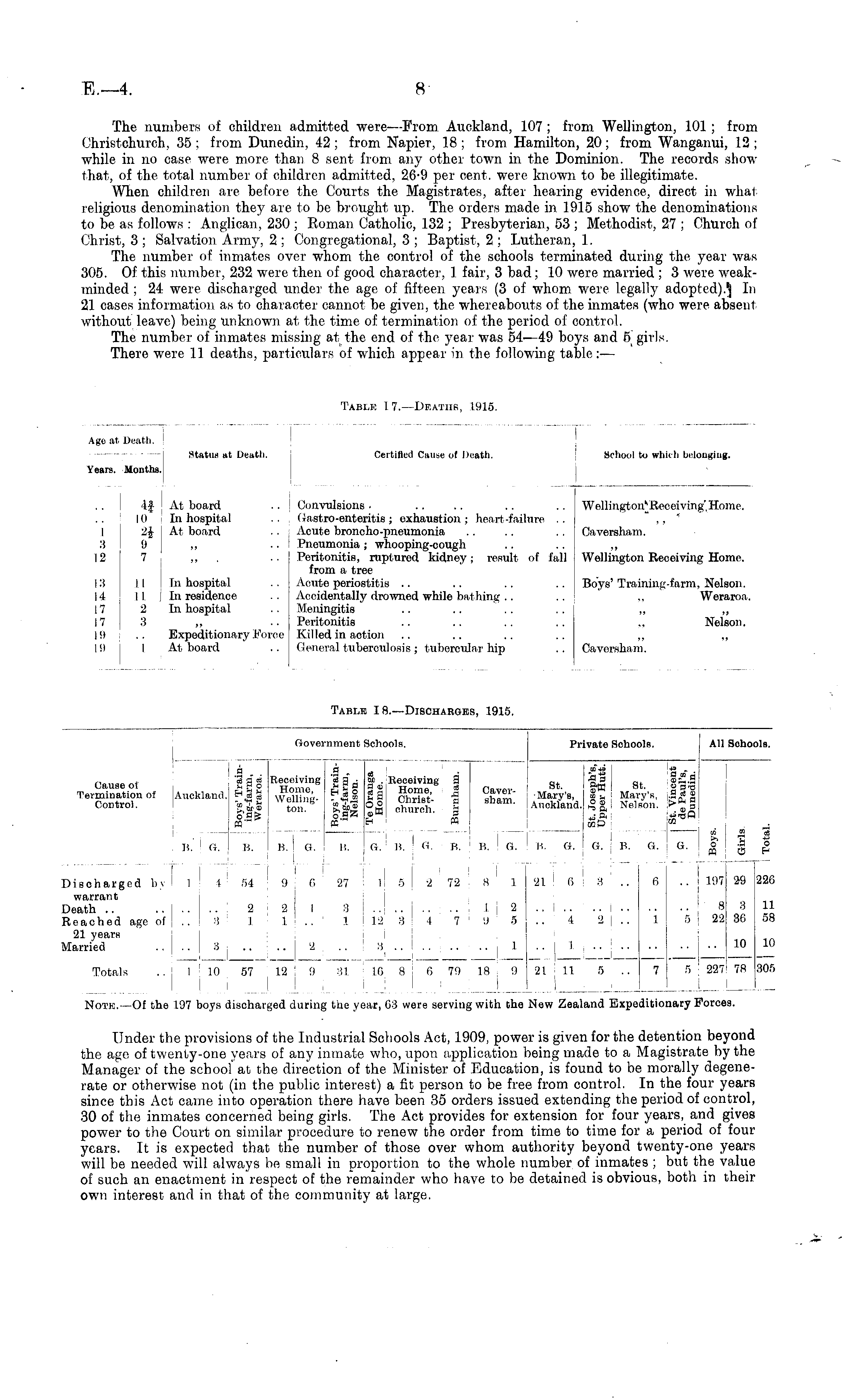 The numbers of children admitted were —From. Auokland, 107 ; from Wellington, 101 ; from Christchurch, 35 ; from Dunedin, 42 ; from Napier, 18 ; from Hamilton, 20; from Wanganui, 12 ; while in no case were more than 8 sent from any other town in the Dominion. The records show that, of the total number of children admitted, 26-9 per cent, were known to be illegitimate. When children are before the Courts the Magistrates, after hearing evidence, direct in v/haf religious denomination they are to be brought up. The orders made in 1915 show the denominations to be as follows : Anglican, 230 ; Roman Catholic, 132 ; Presbyterian, 53 ; Methodist, 27 ; Church of Christ, 3 ; Salvation Army, 2 ; Congregational, 3 ; Baptist, 2 ; Lutheran, 1. The number of inmates over whom the control of the schools terminated during the year was 305. Of this number, 232 were then of good character, 1 fair, 3 bad; 10 were married ; 3 were weakminded ; 24 were discharged under the age of fifteen years (3 of whom were legally In 21 cases information as to character cannot be given, the whereabouts of the inmates (who were absent without leave) being unknown at the time of termination of tho period of control. The number of inmates missing at the end of the year was 54—49 boys and 5' girls. There were 11 deaths, particulars of which appear in the following table:—