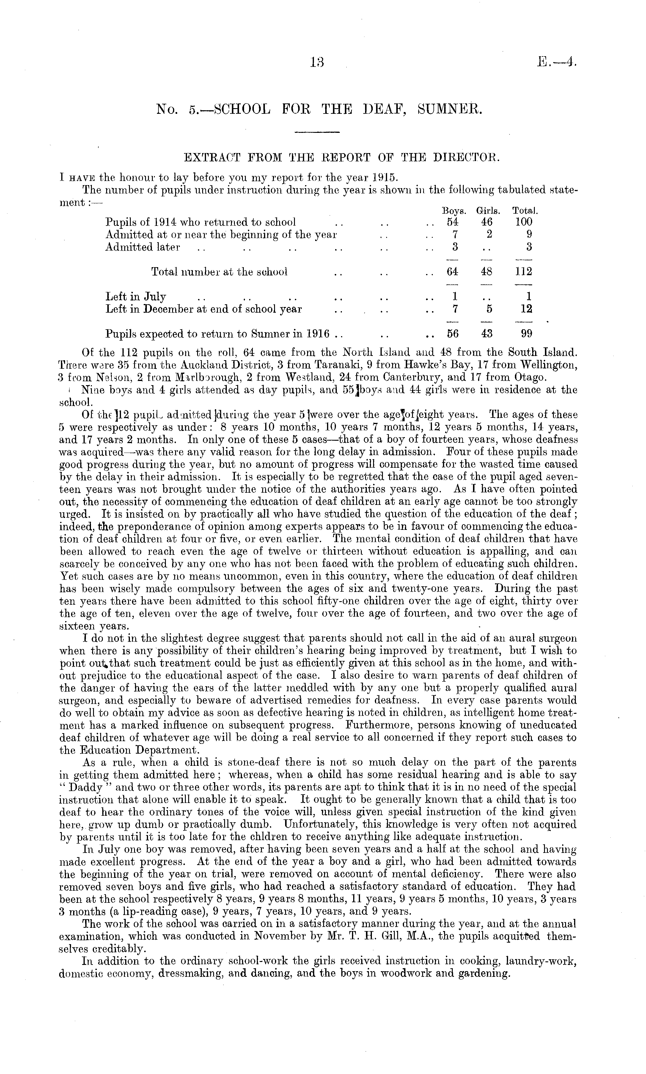 No. S.—SCHOOL FOR THE DEAF, SUMNER. EXTRACT FROM THE REPORT OF THE DIRECTOR. I have the honour to lay before you my report for the year 1915. The number of pupils under instruction during the year is shown in the following tabulated statement :— Boys. Girls. Total. Pupils of 1914 who returned to school .. .. .. 54 46 100 Admitted at or near the beginning of the year .. ..7 2 9 Admitted later . . .. . . .. . . . . 3 .. 3 Total number at the school .. .. .. 64 48 112 Left in July .. .. .. .. .. .. 1 .. 1 Left in December at end of school year .. ... .. 7 5 12 Pupils expected to return to Sumner in 1916 .. .. .. 56 43 99 Of the 112 pupils on the roll, 64 came from the North Island and 48 from the South Island. There wore 35 from the Auckland District, 3 from Taranaki, 9 from Hawke's Bay, 17 from Wellington, 3 from Nelson, 2 from Mvrlborough, 2 from Westland, 24 from Canterbury, and 17 from Otago. i Nine boys and 4 girls attended as day pupils, and 55|boys and 44 girls were in residence at the school. Of the 112 pupiL admitted jduring the year 5 jwere over the agejofjeight years. The ages of these 5 were respectively as under : 8 years 10 months, 10 years 7 months, 12 years 5 months, 14 years, and 17 years 2 months. In only one of these 5 cases—that of a boy of fourteen years, whose deafness was acquired —was there any valid reason for the long delay in. admission. Four of these pupils made good progress during the year, but no amount of progress will compensate for the wasted time caused by the delay in their admission. It is especially to bo regretted that the case of the pupil aged seventeen years was not brought under the notice of the authorities years ago. As I have often pointed out, the necessity of commencing the education of deaf children at an early age cannot be too strongly urged. It is insisted on by practically all who have studied the question of the education of the deaf ; indeed, the preponderance of opinion among experts appears to be in favour of commencing the education of deaf children at four or five, or even earlier. The mental condition of deaf children that have been allowed to reach even the age of twelve or thirteen without education is appalling, and can. scarcely be conceived by any one who has not been faced with the problem of educating such children. Yet such cases are by no means uncommon, even in this country, where the education of deaf children has been wisely made compulsory between the ages of six and twenty-one years. During the past ten years there have been admitted to this school fifty-one children over the age of eight, thirty over the age of ten, eleven over the age of twelve, four over the age of fourteen, and two over the age of sixteen years. I do not in tho slightest degree suggest that parents should not call in the aid of an aural surgeon when there is any possibility of their children's hearing being improved by treatment, but I wish to point out,that such treatment could be just as efficiently given at this school as in the home, and without prejudice to the educational aspect of the case. I also desire to warn parents of deaf children of the danger of having the ears of the latter meddled with by any one but a properly qualified aural surgeon, and especially to beware of advertised remedies for deafness. In every case parents would do well to obtain my advice as soon as defective hearing is noted in children, as intelligent home treatment has a marked influence on subsequent progress. Furthermore, persons knowing of uneducated deaf children of whatever age will be doing a real service to all concerned if they report such cases to the Education Department. As a rule, when a child is stone-deaf there is not so much delay on the part of the parents in getting them admitted here; whereas, when a child has some residual hearing and is able to say " Daddy " and two or three other words, its parents are apt to think that it is in no need of the special instruction that alone will enable it to speak. It ought to be generally known that a child that is too deaf to hear the ordinary tones of the voice will, unless given special instruction of the kind given here, grow up dumb or practically dumb. Unfortunately, this knowledge is very often not acquired by parents until it is too late for the chldren to receive anything like adequate instruction. In July one boy was removed, after having been seven years and a half at the school and having made excellent progress. At the end of the year a boy and a girl, who had been admitted towards the beginning of the year on trial, were removed on account of mental deficiency. There were also removed seven boys and five girls, who had reached a satisfactory standard of education. They had been at the school respectively 8 years, 9 years 8 months, 11 years, 9 years 5 months, 10 years, 3 years 3 months (a lip-reading case), 9 years, 7 years, 10 years, and 9 years. The work of the school was carried on in a satisfactory manner during the year, and at the annual examination, which was conducted in November by Mr. T. 11. Gill, M.A., the pupils acquitted themselves creditably. In addition to the ordinary school-work the girls received instruction in cooking, laundry-work, domestic economy, dressmaking, and dancing, and the boys in woodwork and gardening.