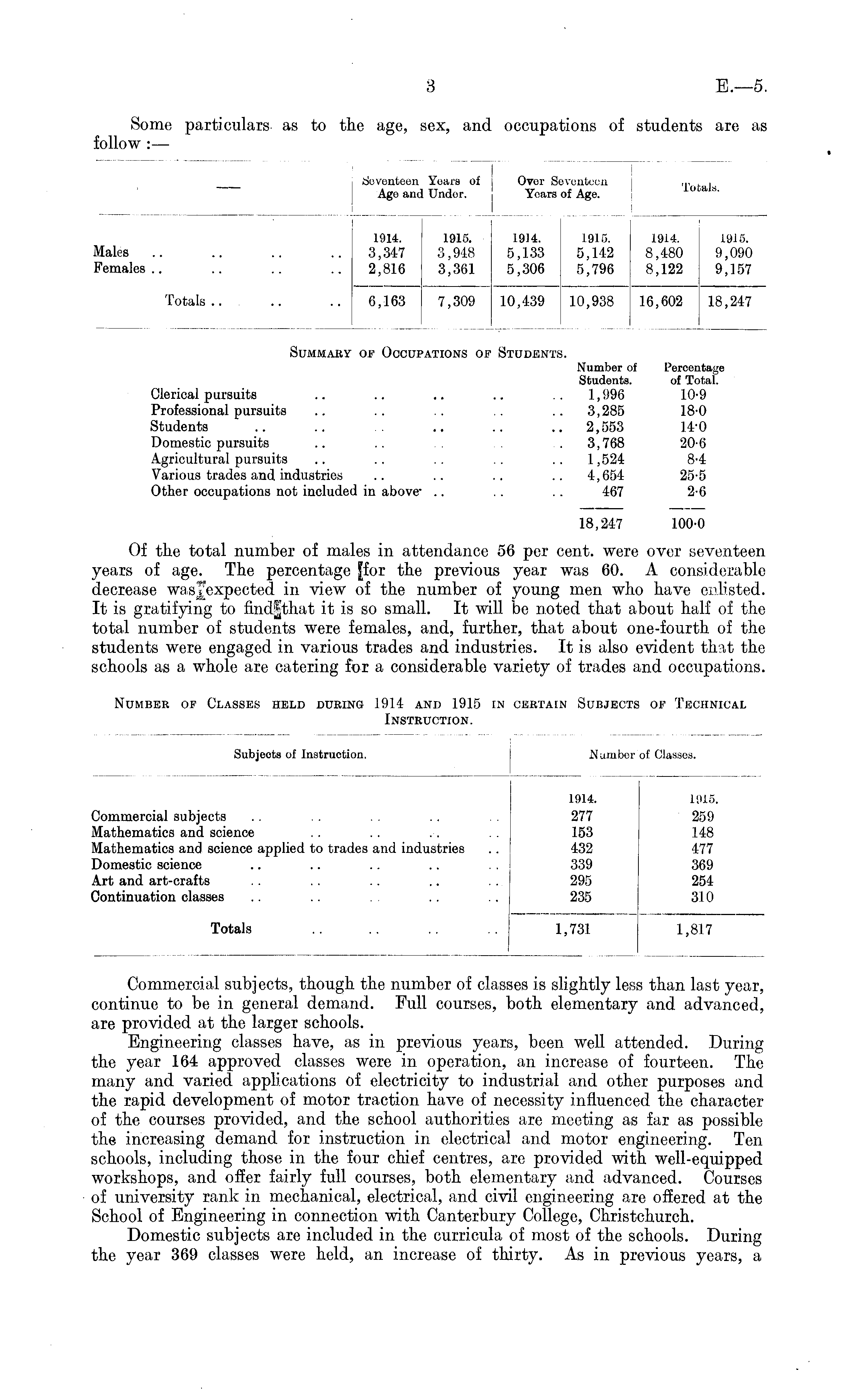 Summary of Occupations op Students. Number of Percentage Students. of Total. Clerical pursuits .. .. .. .. ..1,996 10-9 Professional pursuits .. .. .. .. .. 3,285 18-0 Students .. .. .. .. ..2,553 14-0 Domestic pursuits .. .. .. 3,768 20-6 Agricultural pursuits .. .. . . . . . . 1,524 8-4 Various trades and industries .. .. .. .. 4,654 25-5 Other occupations not included in above - .. .. .. 467 2-6 18,247 100-0 Of the total number of males in attendance 56 per cent, were over seventeen years of age. The percentage [for the previous year was 60. A considerable decrease wa.sjexpected in view of the number of young men who have enlisted. It is gratifying to findfthat it is so small. It will be noted that about half of the total number of students were females, and, further, that about one-fourth of the students were engaged in various trades and industries. It is also evident that the schools as a whole are catering for a considerable variety of trades and occupations.