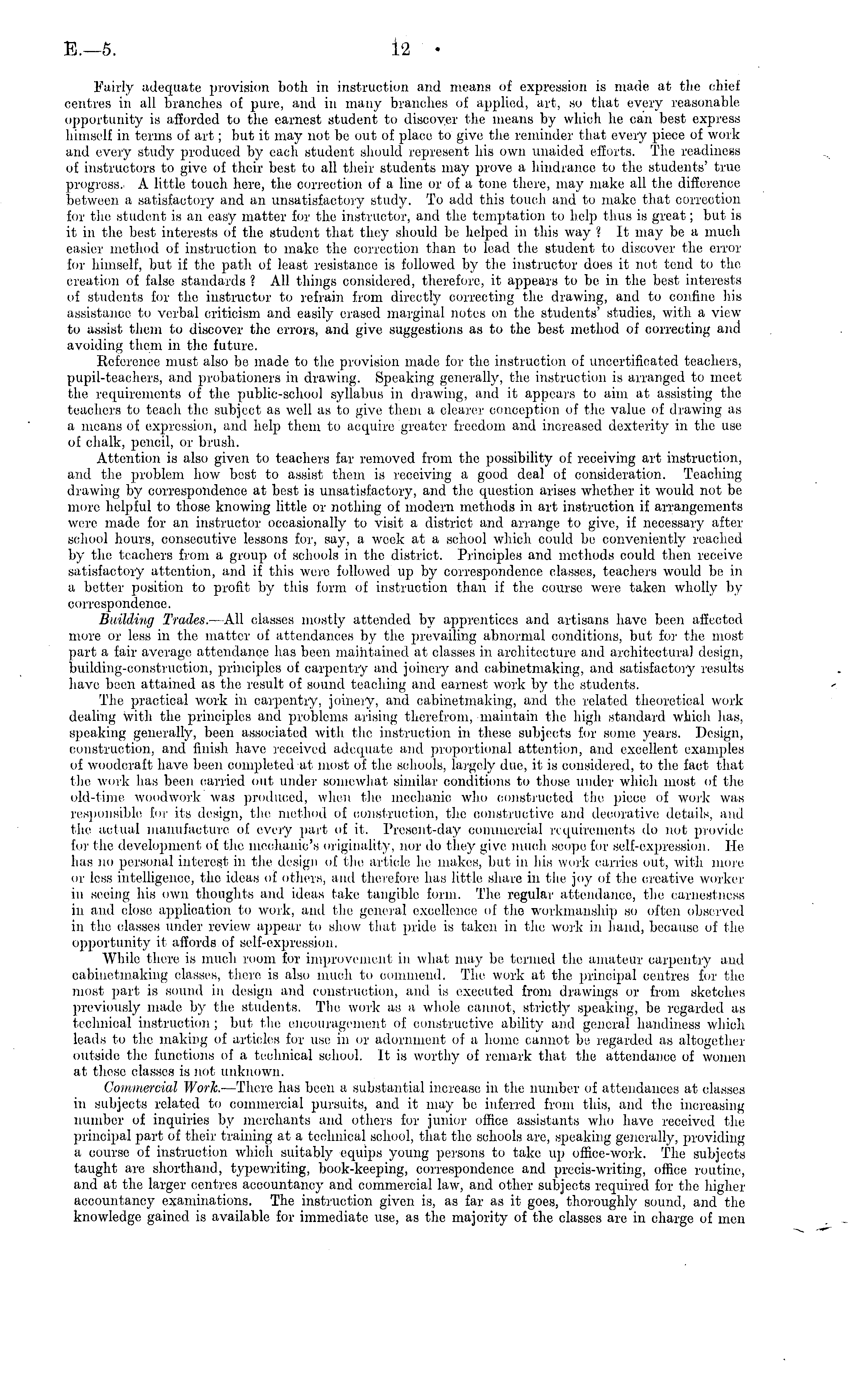 Fairly adequate provision both in instruction and means of expressiem is maele at the chief centres in all branches of pure, and in many branches of applied, art, so that every reasonable opportunity is afforded to the earnest student to discover the means by which he can best express himself in terms of art; but it may not bo out of plae;o to give the reminder that every piece of work and every study produced by each student should represent his own unaided efforts. The readiness of instructors to give of their best to all their students may prove a hindrance to the students' true A little touch here, tho correction of a line or of a teme there, may make all the difference between a satisfaoteny and an unsatisfactory study. To add this toueih and to make that correction for the student is an easy matter for the instructor, and the temptation to help thus is great; but is it in the best interests of the student that the;)' should be helped in this way '{ It may be a much easier method of instruction to make the correction than to lead the student to discover the error for himself, but if the path e>[ least resistance is followed by the instructor does it not tend to the creation of false standards ? All things considered, therefore, it appears te> be in the best interests e>f students for the instructor to refrain from directly correcting the drawing, and to confine his assistance to verbal criticism and easily erased marginal notes on the students' studies, with a view to assist them to discover the errors, and give suggestions as to the best method of correcting and avoiding them in the future. Reference must also bo made to the preivision made for the instruction of uncertificated teachers, pupil-teachers, and probationers in drawing. Speaking generally, the instruction is arranged to meet the requirements of the public-schoeil syllabus in drawing, and it appears to aim at assisting the teachers to teach the subject as well as to give them a clearer conception of the value of drawing as a means of expression, and help them to acquire greater freedom and increased dexterity in the use of chalk, pencil, or brush. Attention is also given te> teachers far removed from the possibility of receiving art instruction, and the problem how best to assist them is receiving a good deal of consideration, Teaching drawing by correspemdence at best is unsatisfactory, and the question arises whether it would neit be meirc helpful te> those knowing little or nothing of modern methods in art instruction if arrangements were made for an instructor ocoashmally to visit a district and arrange to give, if necessary after school hours, consecutive lessems for, say, a week at a school which cemld bo conveniently reached by the teachers from a group of schools in the district. Principles and methods cemld then receive satisfactory attention, and if this were followed up by correspondence classes, teachers would be in a better position to profit by this form eif instruction than if the course were taken wholly by correspondence. Building Trades. —All olasses mostly attended by apprentices and artisans have been affected more or less in the matter e>f attendances by the prevailing abnormal conditions, but for tho most part a fair average attendance has been maintained at classes in architecture and architectural design, building-construction, principles of carpentry and joinery and cabinetmaking, and satisfactory results have been attained as the result eff sound teaching and earnest work by the students. The practical work in carpentry, joinery, and cabinetmaking, and the related theoretical work dealing with the principles and problems arising therefrom, maintain the high standard which has. speaking generally, been asseiciated with the instruction in these subjeots for some years. Design, construction, and finish have received adequate and proportional attention, and excellent examples eif woodcraft have been completed at most of the schools, largely due, it is considered, to the fact that the work has been carried oul under somewhat similar conditions to those under which most of the old-time woodwork was produced, when the mechanic who constructed I he- pieoe of work was responsible for its design, the' method e>[ construction, the constructive and decorative details, and the actual manufacture of every pari of it. Present-day oommeroia] requirements do not provide for the development of the meohame's originality, nor do they give l much soope for self-expression. He has ne> personal interest in the design of the artiole he makes, but in his work carries out, with more e>r loss intelligence, tho ideas of others, and therefore has little share in the joy o£ the creative worker in seeing his own thoughts and ideas take tangible Eorm. The! regular attendance, the earnestness in and dose application to work, and the general excellence of the workmanship so often observed in the edasses under review appear to show that pride is taken in the; work in hand, because eif the opportunity it affords of self-expression, While there is much reiom for improvement in what may be termed the', amateur carpentry and cabinetmaking classes, there is also much to oommend, Tho work at the principal centres for the most part is sound in design and construction, and is executed from drawings eir from sketches previously made by the students. The work as a whole cannot, strictly speaking, be regarded as technical instruction; but the enoouragement of constructive ability and general handiness which leads to the making eif articles for use! in or adornment of a home cannot bo regarded as altogether outside the functions of a technical sohool. It is worthy of remark that the attendance of women at these classes is not unknown. Commercial Work. —There has been a substantial increase in the number e>f attendances at edasses in subjects related te) commercial pursuits, and it may be inferred from this, and the increasing number of 