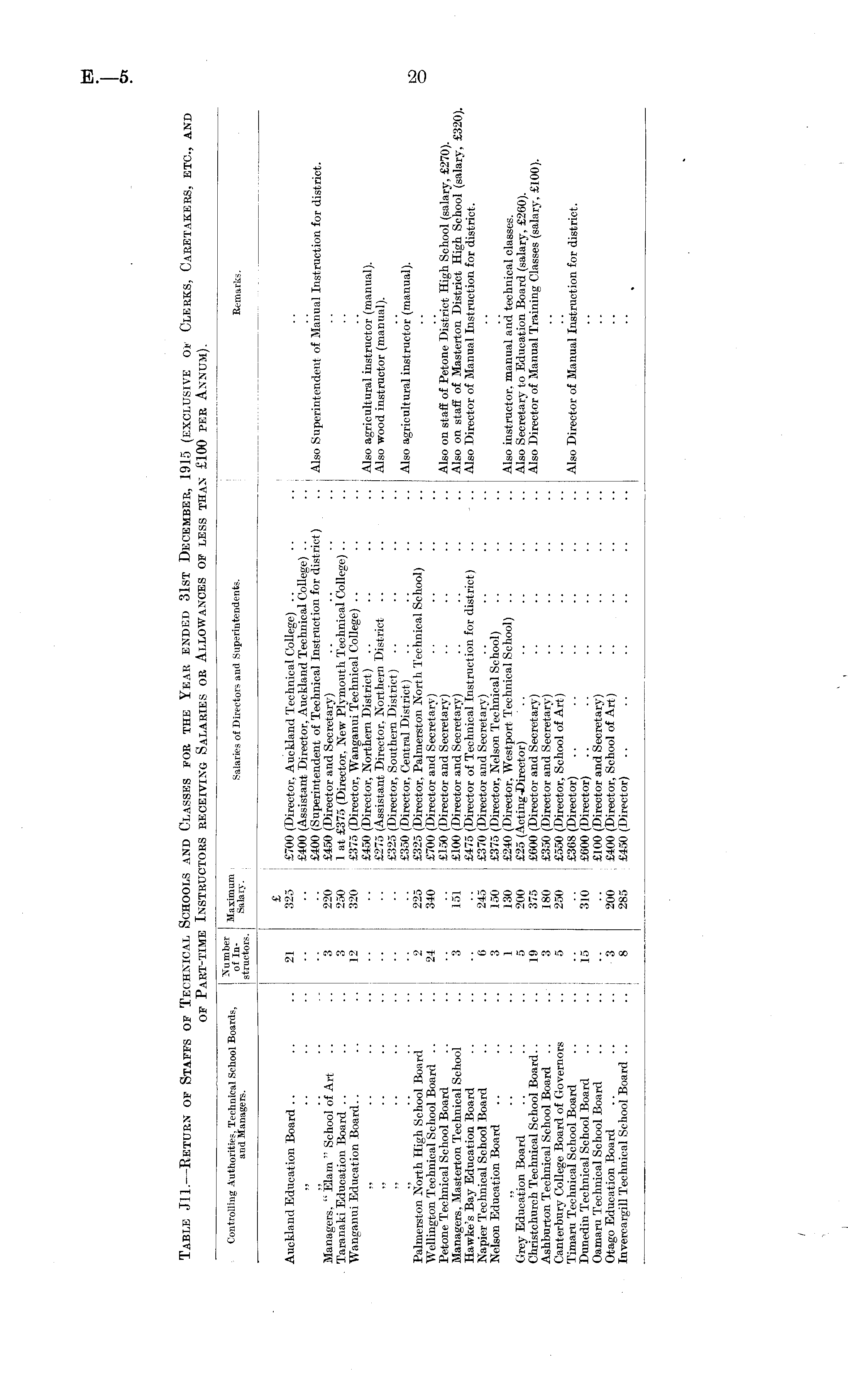 Controlling Authorities, Technical School Boards, and Managers. dumber of Instructors. Maximum Salary. Salaries of Directors and Superintendents. Remarks. Auckland Education Board Managers. " Elam " School of Art Taranaki Education Board Wanganui Education Board.. Palmerston North High School Board Wellington Technical School Board .. Petone Technical School Board Managers. Masterton Technical School Hawke's Bay Education Board Napier Technical School Board Nelson Education Board Grey Education Board Christchurch Technical School Board.. Ashburton Technical School Board .. Canterbury College Board of Governors Timaru Technical School Board Dunedin Technical School Board Oamaru Technical School Board Otago Education Board Invercargill Technical School Board .. .. 21 3 3 12 9 24 3 6 3 1 5 19 3 5 15 3 8 £ 325 220 250 320 225 340 151 245 150 130 200 375 180 250 310 200 285 £700 (Director, Auckland Technical College) £400 (Assistant Director, Auckland Technical College) .. £400 (Superintendent of Technical Instruction for district) £450 (Director and Secretary) 1 at £375 (Director, New Plymouth Technical College) .. £375 (Director, Wanganui Technical College) £450 (Director, Northern District) £275 (Assistant Director, Northern District £325 (Director, Southern District) - ■ £350 (Director, Central District) £325 (Director, Palmerston North Technical School) £700 (Director and Secretary) £150 (Director and Secretary) £100 (Director and Secretary) £475 (Director of Technical Instruction for district) £370 (Director and Secretary) £375 (Director, Nelson Technical School) £240 (Director, Westport Technical School) £25 (Acting-Director) £000 (Director and Secretary) £350 (Director and Secretary) £550 (Director, School of Art) £308 (Director) £600 (Director) £100 (Director and Secretary) £400 (Director, School of Art) £450 (Director) Also Superintendent of Manual Instruction for district. Also agricultural instructor (manual). Also wood instructor (manual). Also agricultural instructor (manual). Also on staff of Petone District High School (salary, £270). Also on staff of Masterton District High School (salary, £320), Also Director of Manual Instruction for district. Also instructor, manual and technical classes. Also Secretary to Education Board (salary, £200). Also Director of Manual Training Classes (salary. £100). Also Director of Manual Instruction for district. ♦
