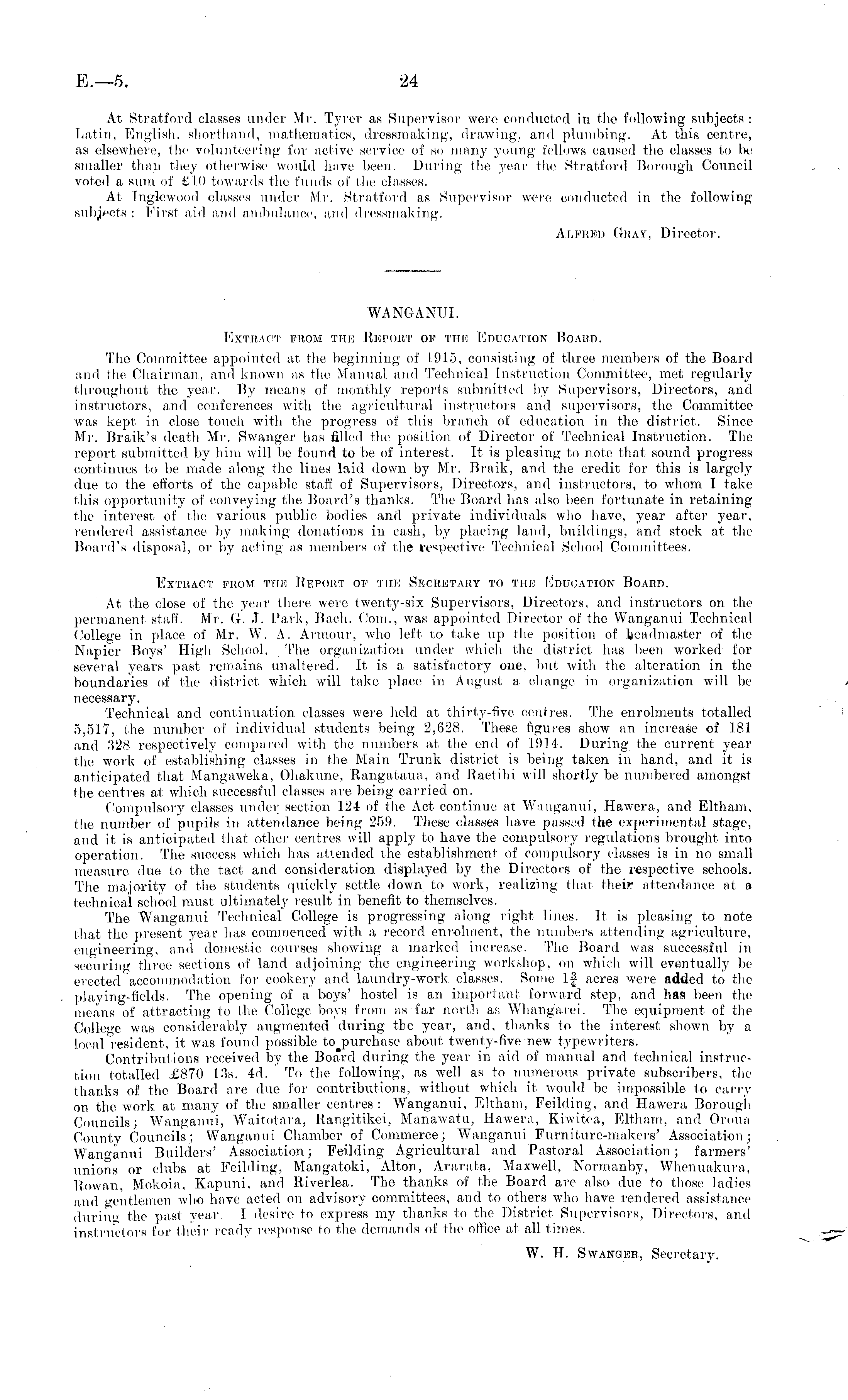 WANGANUI. Extract from the Report of the Education Board. Tho Committee appointed at the beginning of 1915, consisting of three members of the Board and the Chairman, and known as the Manual and Technical Instruction Committee, met regularly throughout the year. By means of monthly reports submitted by Supervisors, Directors, and instructors, and conferences with the agricultural instructors and supervisors, the Committee was kept in close touch with the progress of this branch of education in the district. Since Mr. Braik's death Mi. Swanger has filled the position of Director of Technical Instruction. The report submitted by him will be found to be of interest. It is pleasing to note that sound progress continues to be made along the lines laid down by Mr. Braik, and the credit for this is largely due to the efforts of the capable staff of Supervisors, Directors, and instructors, to whom I (also this opportunity of conveying the Board's thanks. The Board has also been fortunate in retaining the interest of the various public bodies and private individuals who have, year after year, rendered assistance by making donations in cash, by placing land, buildings, and stock at the Board's disposal, or by acting as members of the respective Technical School Committees. Extract from the Report of the Secretary to the Kduoation Board. At the close of the year there were twenty-six Supervisors, Directors, and instructors on the permanent staff. Mr. G. ,1. Park, Bach. Com., was appointed Director of the Wanganui Technical College in place of Mr. W. A. Armour, who left to take up the position of headmaster of the Napier Boys' High School. The organization under which the district has been worked for several years past remains unaltered. It is a satisfactory one, but with the alteration in the boundaries of the district which will take place in August a change in organization will be necessary. Technical and continuation classes were held at thirty-five centres. The enrolments totalled 5,517, the number of individual students being 2,628. These figures show an increase of 181 and 328 respectively compared with the numbers at the end of 1914. During the current year the work of establishing classes in the Main Trunk district is being taken in hand, and it is anticipated that Mangaweka, Ohakune, Rangataua, and Raetihi will shortly be numbered amongst the centres at which successful classes are being carried on. Compulsory classes under section 124 of the Act continue at Wanganui, Hawera, and Eltham, the number of pupils in attendance being 259. These classes have passed the experimental stage, and it is anticipated that other centres will apply to have the compulsory regulations brought into operation. The success which has attended the establishment of compulsory classes is in no small measure due, to the tact and consideration displayed by the Directors of the respective schools. The majority of the students quickly settle down to work, realizing that their- attendance at a technical school must ultimately result in benefit to themselves. The Wanganui Technical College is progressing along right lines. It is pleasing to note that the present year has commenced with a record enrolment, the numbers attending agriculture, engineering, and domestic courses showing a marked increase. The Board was successful in securing three sections of land adjoining the engineering workshop, on which will eventually be erected accommodation for cookery and laundry-work classes. Some If acres were added to the playing-fields. The opening of a boys' hostel is an important forward step, and has been the means of attracting to the College boys from as far north as Whangarei. The equipment of the College was considerably augmented during the year, and, thanks to the interest shown by a local resident, it was found possible to purchase about twenty-five new typewriters. Contributions received by the Board during the year in aid of manual and technical instruction totalled £870 13s. 4d. To the following, as well as to numerous private subscribers, the thanks of the Board are due for contributions, without which it would be impossible to carry on the work at many of the smaller centres: Wanganui, Eltham, Feilding, and Hawera Borough Councils; Wanganui, Waitotara, Rangitikei, Manawatu, Hawera, Kiwitea, Eltham, and Oroua County Councils; Wanganui Chamber of Commerce; Wanganui Furniture-makers' Association; Wanganui Builders' Association; Feilding Agricultural and Pastoral Association; farmers' unions or clubs at Feilding, Mangatoki, Alton, Ararata, Maxwell, Normanby, Whenuakura, Rowan, Mokoia, Kapuni, and Riverlca. The thanks of the Board are also due to those ladies and gentlemen who have acted on advisory committees, and to others who have rendered assistance during the past year, I desire to express my thanks to the District Supervisors, Directors, and instructors for their ready response to the demands of the office at all times. W. H. Swanqer, Secretary.