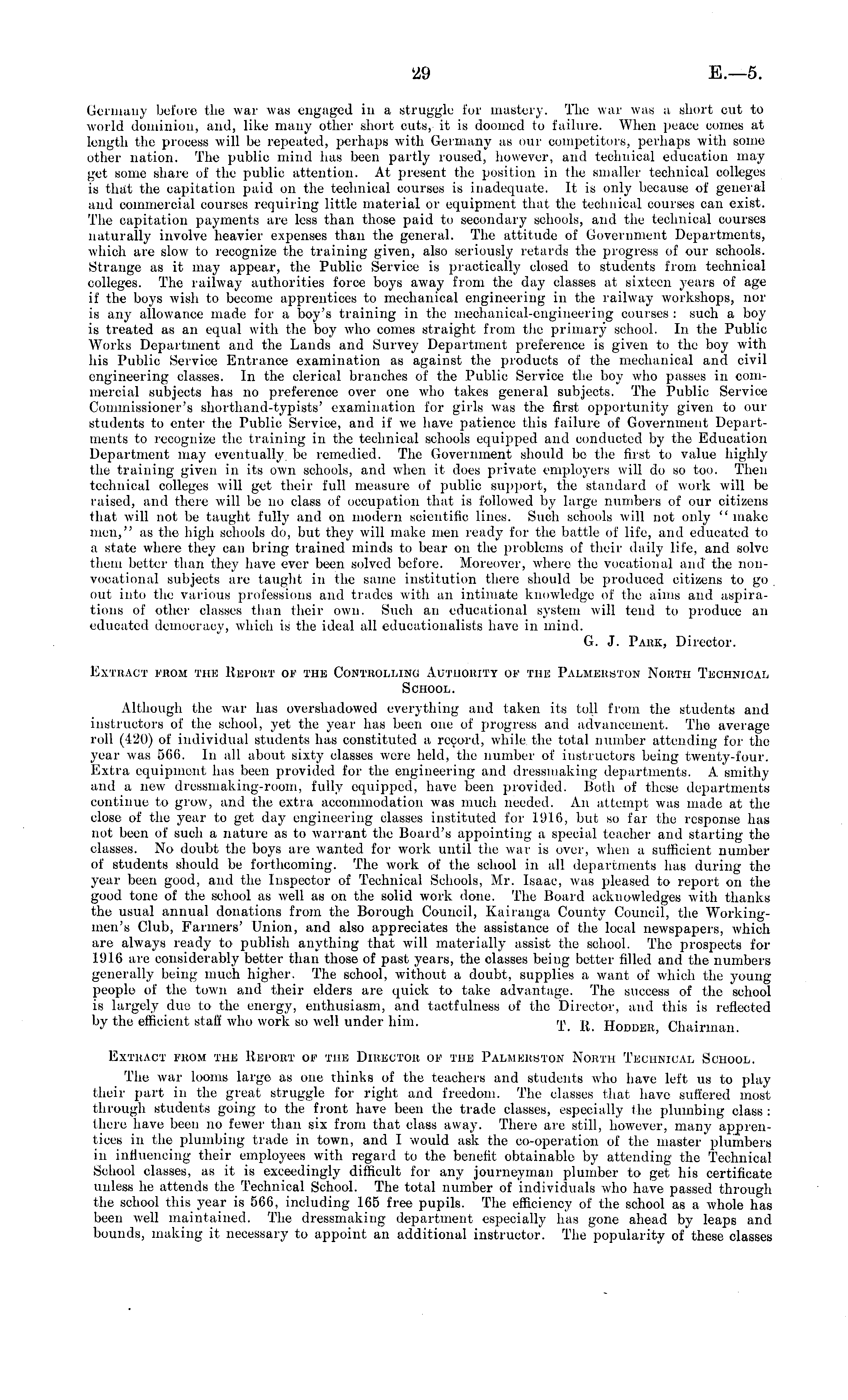 Germany before the war was engaged in a struggle for mastery. The war was a short cut to world dominion, and, like many other short cuts, it is doomed to failure. When peace comes at length the process will be repeated, perhaps with Germany as our competitors, perhaps with some other nation. The public mind has been partly roused, however, and technical education may get some share of the public attention. At present the position in the smaller technical colleges is that the capitation paid on the technical courses is inadequate. It is only because of general and commercial courses requiring little material or equipment that, the technical courses can exist. The capitation payments are less than those paid to secondary schools, and the technical courses naturally involve heavier expenses than the general. The attitude of Government Departments, which are slow to recognize the training given, also seriously retards the progress of our schools. Strange as it may appear, the Public Service is practically closed to students from technical colleges. The railway authorities force boys away from the day classes at sixteen years of age if the boys wish to become apprentices to mechanical engineering in the railway workshops, nor is any allowance made for a boy's training in the mechanical-engineering courses : such a boy is treated as an equal with the boy who comes straight from the primary school. In the Public Works Department and the Lands and Survey Department preference is given to the boy with his Public Service Entrance examination as against the products of the mechanical and civil engineering classes. In the clerical branches of the Public Service the boy who passes in commercial subjects has no preference over one wdio takes general subjects. The Public Service Commissioner's shorthand-typists' examination for girls was the first opportunity given to our students to enter the Public Service, and if we have patience this failure of Government Departments to recognize the training in the technical schools equipped and conducted by the Education Department may eventually be remedied. The Government should bo the first to value highly the training given in its own schools, and when it does private employers will do so too. Then technical colleges will get their full measure of public support, the standard of work will be raised, and there will be no class of occupation that is followed by large numbers of our citizens that will not be taught full}' and on modern scientific lines. Such schools wdll not only " make men," as the high schools do, but they will make men ready for the battle of life, and educated to a state where they can bring trained minds to bear on the problems of their daily life, and solve them better than they have ever been solved before. Moreover, where the vocational and the nonvocational subjects are taught in the same institution there should be produced citizens to go out into the various professions and trades with an intimate knowledge of the aims and aspirations of other classes than their own. Such an educational system will tend to produce an educated democracy, which is the ideal all educationalists have in mind. G. J. Park, Director. Extract from the Report of the Controlling Authority of the Palmerston North Technical School. Although the war has overshadowed everything and taken its toll from the students and instructors of the school, yet the year has been one of progress and advancement. The average roll (420) of individual students has constituted a record, while the total number attending for the year was 566. In all about sixty classes were held, the number of instructors being twenty-four. Extra equipment has been provided for the engineering and dressmaking departments. A. smithy and a new dressmaking-room, fully equipped, have been provided. Both of these department's continue to grow, and the extra accommodation was much needed. An attempt was made at the close of the year to get day engineering classes instituted for 1916, but so far the response has not been of such a nature as to warrant the Board's appointing a special teacher and starting the classes. No doubt the boys are wanted for work until the war is over, wdien a sufficient number of students should be forthcoming. The work of the school in all departments has during the year been good, and the Inspector of Technical Schools, Mr. Isaac, was pleased to report on the good tone of the school as well as on the solid work done. The Board acknowledges with thanks the usual annual donations from the Borough Council, Kairanga County Council, the Workingmen's Club, Farmers' Union, and also appreciates the assistance of the local newspapers, which are always ready to publish anything that will materially assist the school. The prospects for 1916 are considerably better than those of past years, the classes being better filled and the numbers generally being much higher. The school, without a doubt, supplies a want of which the young people of the town and their elders are quick to take advantage. The success of the school is largely duo to the energy, enthusiasm, and taetfulness of the Director, and this is reflected by the efficient staff who work so well under him. ij j| pi ODDEK Chairman Extract from the Report of the Director of the Palmerston North Technical School. The war looms largo as one thinks of the teachers and students who have left us to play their part in the great struggle for right and freedom. The classes that have suffered most through students going to the front have been the trade classes, especially the plumbing class : there have been no fewer than six from that class away. There are still, however, many apprentices in the plumbing trade in town, and I would ask the co-operation of the master plumbers in influencing their employees with regard to the benefit obtainable by attending the Technical School classes, as it is exceedingly difficult for any journeyman plumber to g