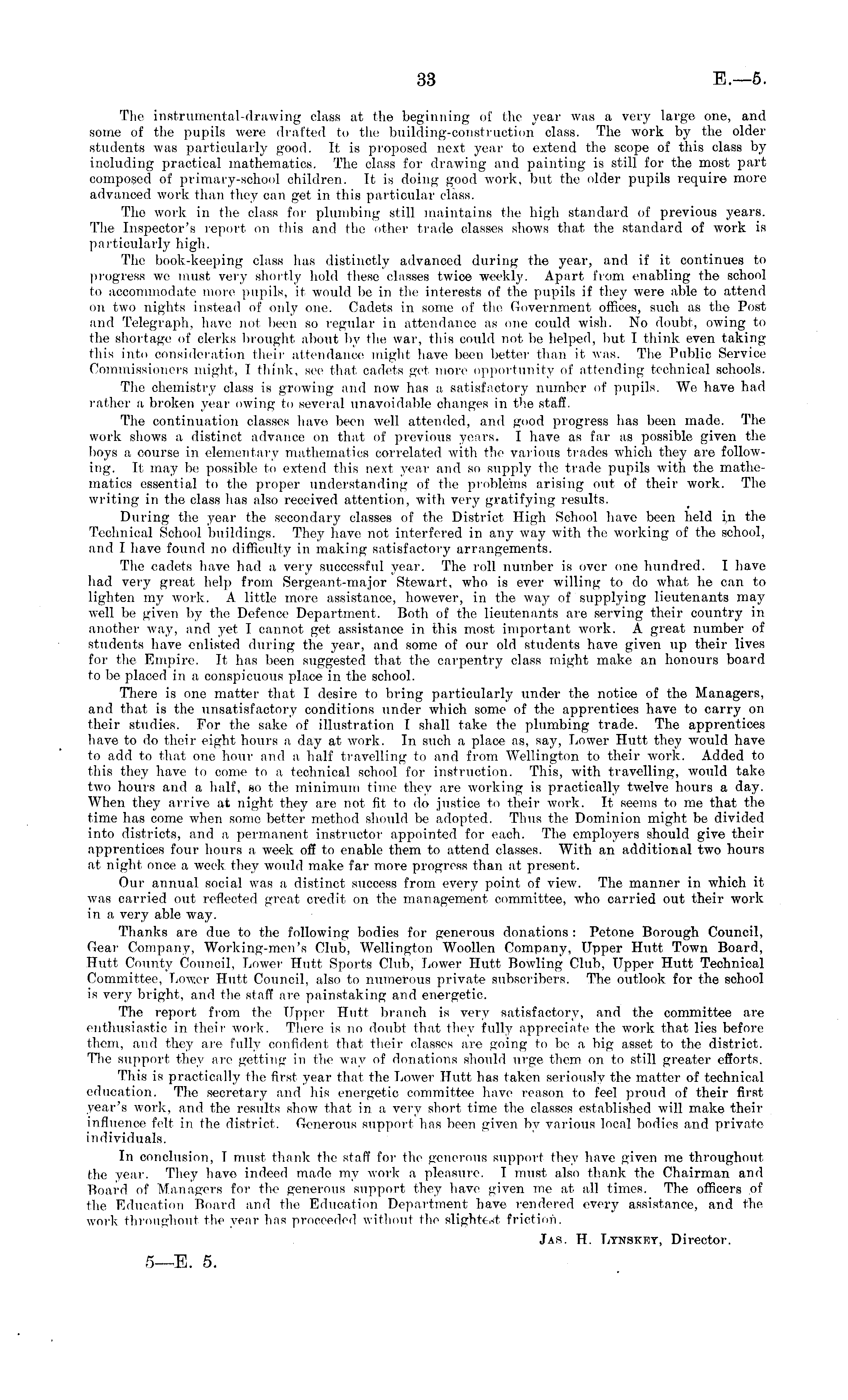 The instrumental-drawing class at the beginning of the year was a very large one, and some of the pupils were drafted to the building-construction class. The work by the older students was particularly good. It is proposed next year to extend the scope of this class by including practical mathematics. The class for drawing and painting is still for the most part composed of primary-school children. It is doing good work, but the older pupils require more advanced work than they can get in this particular class. The work in the class for plumbing still maintains the high standard of previous years. The Inspector's report on this and the other trade classes shows that the standard of work is particularly high. The book-keeping class has distinctly advanced during the year, and if it continues to progress wo must very shortly hold these classes twice weekly. Apart from enabling the school to accommodate more pupils, it would be in the interests of the pupils if they were able to attend on two nights instead of only one. Cadets in some of the Government offices, such as tho Post and Telegraph, have not been so regular in attendance as one could wish. No doubt, owing to the shortage of clerks brought about by the war, this could not be helped, but I think even taking this into consideration their attendance might have been better than it was. The Public Service Commissioners might, I think, see that cadets get more opportunity of attending technical schools. The chemistry class is growing and now has a, satisfactory number of pupils. We have had rather a broken year owing to several unavoidable changes in the staff. The continuation classes have been well attended, and good progress has been made. The work shows a distinct advance on that of previous years, I have as far as possible given the boys a course in elementary mathematics correlated with the various trades which they are following. It may be possible to extend this next year and so supply the trade pupils with the mathematics essential to the proper understanding of the problems arising out of their work. The writing in the class has also received attention, with very gratifying results. During the the secondary classes of the District High School have been held i,n the Technical School buildings. They have not interfered in any way with the working of the school, and I have found no difficulty in making satisfactory arrangements. The cadets have had a very successful year. The roll number is over one hundred. I have had very great help from Sergeant-major Stewart, who is ever willing to do what he can to lighten my work. A little more assistance, however, in the way of supplying lieutenants may well be given by the Defence Department. Both of the lieutenants are serving their country in another way, and yet I cannot get assistance in this most important work. A great number of students have enlisted during the year, and some of our old students have given up their lives for the Empire. It has been suggested that the carpentry class might make an honours board to be placed in a conspicuous place in the school. There is one matter that I desire to bring particularly under the notice of the Managers, and that is the unsatisfactory conditions under which some of the apprentices have to carry on their studies. For the sake of illustration I shall take the plumbing trade. The apprentices have to do their eight hours a day at work. In such a place as, say, Lower Hutt they would have to add to that one hour and a half travelling to and from Wellington to their work. Added to this they have to come to a technical school for instruction. This, with travelling, would take two hours and a half, so the minimum time they are working is practically twelve hours a day. When they arrive at night they are not fit to do justice to their work. It seems to me that the time has come when some better method should be adopted. Thus the Dominion might be divided into districts, and a permanent instructor appointed for each. The employers should give their apprentices four hours a week off to enable them to attend classes. With an additional two hours at night once a week, they would make far more progress than at, present. Our annual social was a distinct success from every point of view. The manner in which it was carried out reflected great credit on the management committee, who carried out their work in a very able way. Thanks are due to the following bodies for generous donations : Pctone Borough Council, Gear Company, Working-men's Club, Wellington Woollen Company, Upper Hutt Town Board, Hutt County Council, Lower Hutt Sports Club, Lower Hutt Bowling Club, Upper Hutt Technical Committee, Lower Hutt Council, also to numerous private subscribers. The outlook for the school is very bright, and the staff are painstaking and energetic. The report from the Upper Hutt branch is very satisfactory, and the committee are enthusiastic in their work, There is no doubt that they fully appreciate the work that lies before them, and they are fully confident that their classes are going to be a big asset to the district. The support they are getting in the way of donations should urge them on to still greater efforts. This is practically the first year that the Lower Hutt has taken seriously the matter of technical education. The secretary and his energetic committee have reason to feel proud of their first year's work, and the results show that in a very short time the classes established will make their influence felt in the district. Generous support has been given by various local bodies and private individuals. In conclusion, I must thank the staff for the generous support they have given me throughout the year. They have indeed made my work a pleasure. I must also thank the Chairman and Board of Managers for the generous support they have given me at all times. The officers of the Education Board and the Education Department have rendered every assistance, and