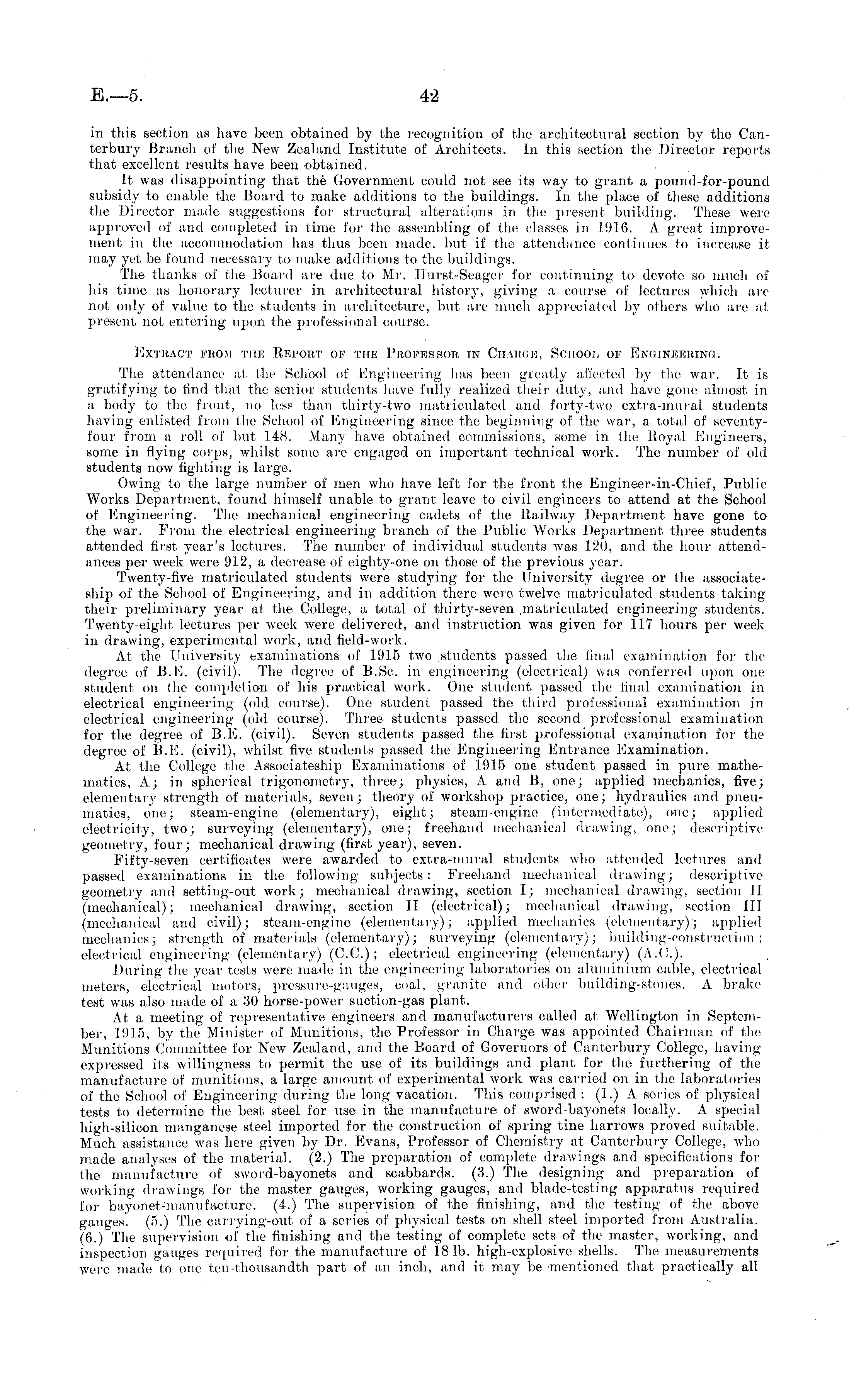 in this section as have been obtained by the recognition of the architectural section by the Canterbury Branch of the New Zealand Institute of Architects. In this section the Director reports that excellent results have been obtained. It was disappointing that the Government could not see its way to grant a pound-for-pound subsidy to enable the Board to make additions to the buildings. In the place of these additions the Director made suggestions for structural alterations in the present building. These were approved of and completed in time for the assembling of the classes in 1916. A great improvement in the accommodation has thus been made, but if the attendance continues to increase it may yet be found necessary to make additions to the buildings. The thanks of the Board are due to Mr. Hurst-Seager for continuing to devote so much of his time as honorary lecturer in architectural history, giving a course of lectures which are not only of value to the students in architecture, but are much appreciated by others who are at present not entering upon the professional course. Extract from the Report of the Professor in Charge, School of Engineering. The attendance at the School of Engineering has been greatly affected by the war, It is gratifying to find that the senior students have fully realized their duty, and have gone almost in a body to the front, no less than thirty-two matriculated and forty-two extra-mural students having enlisted from the School of Engineering since the beginning of the war, a total of seventyfour from a roll of but 148. Many have obtained commissions, some in the Royal Engineers, some in flying corps, whilst some are engaged on important technical work. The number of old students now fighting is large. Owing to the large number of men who have left for the front the Engineer-in-Chief, Public Works Department, found himself unable to grant leave to civil engineers to attend at the School of Engineering. The mechanical engineering cadets of the Railway Department have gone to the war. From the electrical engineering branch of the Public Works Department, three students attended first year's lectures. The number of individual students was 120, and the hour attendances per week were 912, a decrease of eighty-one on those of the previous year. Twenty-five matriculated students were studjdng for the University' degree or the associateship of the School of Engineering, and in addition there were twelve matriculated students taking their preliminary year at the College, a total of thirty-seven .matriculated engineering students. Twenty-eight lectures per week were delivered, and instruction was given for 117 hours per week in drawing, experimental work, and field-work. At the University examinations of 1915 two students passed the final examination for the degree of B.E. (civil). The degree of B.Sc. in engineering (electrical) was conferred upon one student on the completion of his practical work. One student passed the final examination in electrical engineering (old course). One student passed the third professional examination in electrical engineering (old course). Three students passed the second professional examination for the degree of B.E. (civil). Seven students passed the first professional examination for the degree of B.E. (civil), whilst five students passed the Engineering Entrance Examination. At the College the Assoeiateship Examinations of 1915 one student passed in pure mathematics, A; in spherical trigonometry, three; physics, A and B, one; applied mechanics, five; elementary strength of materials, seven; theory of workshop practice, one; hydraulics and pneumatics, one; steam-engine (elementary), eight; steam-engine (intermediate), one; applied electricity, two; surveying (elementary), one; freehand mechanical drawing, one; descriptive geometry, four; mechanical drawing (first year), seven. Fifty-seven certificates were awarded to extra-mural students who attended lectures and passed examinations in the following subjects: Freehand mechanical drawing; descriptive geometry and setting-out work; mechanical drawing, section I; mechanical drawing, section II (mechanical); mechanical drawing, section II (electrical); mechanical drawing, section 111 (mechanical and civil); steam-engine (elementary); applied mechanics (elementary); applied mechanics; strength of materials (elementary); surveying (elementary); building-construction; electrical engineering (elementary) (C.C.); electrical engineering (elementary) (A.C.). During the year tests were made in the engineering laboratories on aluminium cable, electrical meters, electrical motors, pressure-gauges, coal, granite and other building-stones. A brake test was also made of a 30 horse-power suction-gas plant. At a meeting of representative engineers and manufacturers called at Wellington in September, 1915, by the Minister of Munitions, the Professor in Charge was appointed Chairman of the Munitions Committee for New Zealand, and the Board of Governors of Canterbury College, having expressed its willingness to permit the use of its buildings and plant for the furthering of the manufacture of munitions, a large amount of experimental work was carried on in the laboratories of the School of Engineering during the long vacation. This comprised : (1.) A series of physical tests to determine the best steel for use in the manufacture of sword-bayonets locally. A special high-silicon manganese steel imported for the construction of spring tine harrows proved suitable. Much assistance was here given by Dr. Evans, Professor of Chemistry at Canterbury College, who made analyses of the material. (2.) The preparation of complete drawings and specifications for the manufacture of sword-bayonets and scabbards. (3.) The designing and preparation of working drawings for the master gauges, working gauges, and blade-testing apparatus required for bayonet-manufacture. (4.) The supervision of the finishing, and the testing o