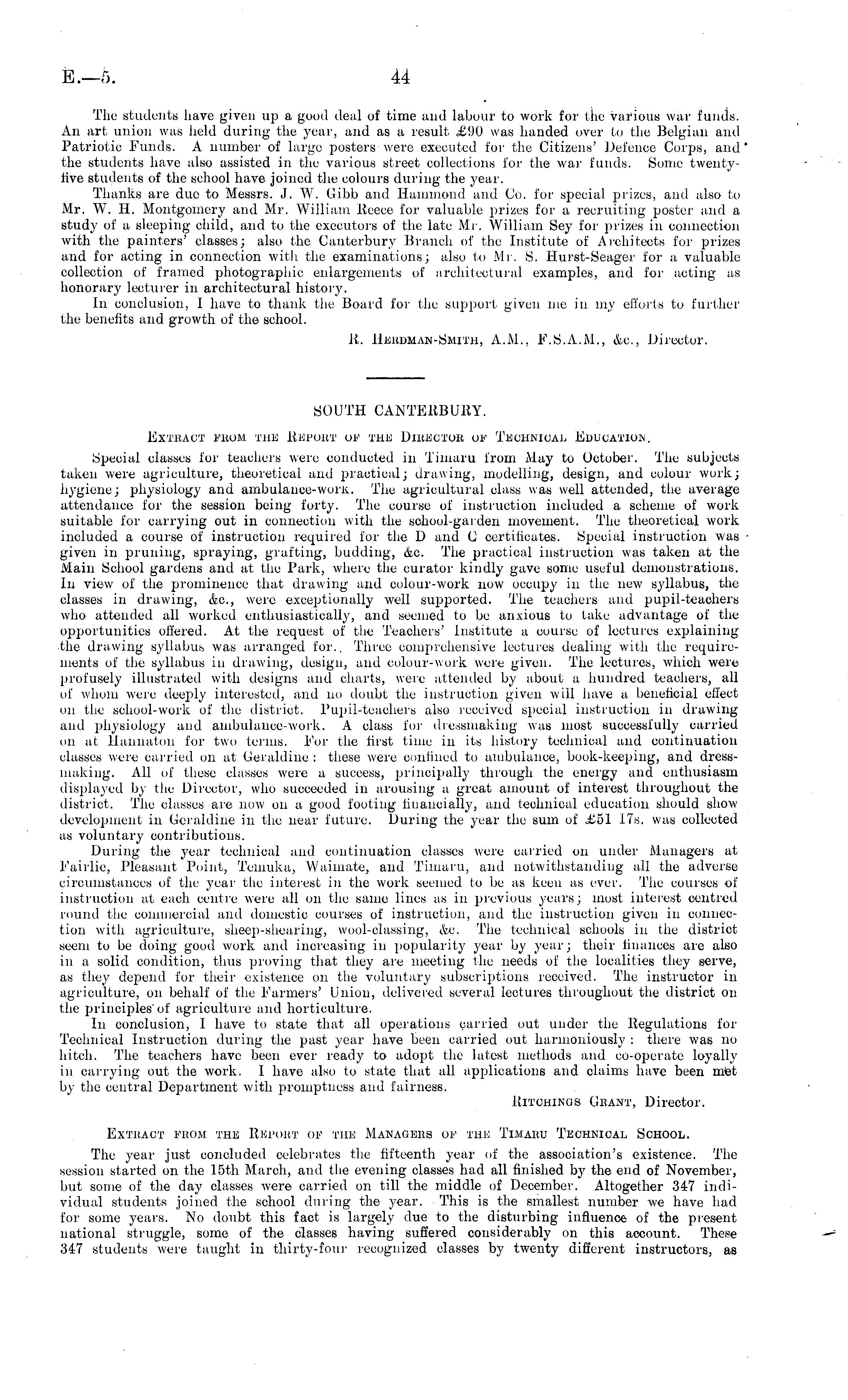 The students have given up a good deal of time and labour to work for the various war funds. An art union was held during the year, and as a result £90 was handed over to the Belgian and Patriotic Funds. A number of largo posters were executed for the Citizens' Defence Corps, and the students have also assisted in the various street collections for the war funds. Some twentyfive students of the school have joined the colours during the year. Thanks are due to Messrs. J. W. Gibb and Hammond and Co. for special prizes, and also to Mr. W. H. Montgomery and Mr. William Recce for valuable prizes for a recruiting poster and a study of a sleeping child, and to the executors of the late Mr. William Sey for prizes in connection with the painters' classes; also the Canterbury Branch of the Institute of Architects for prizes and for acting in connection with the examinations; also to Mr. S. Hurst-Seager for a valuable collection of framed photographic enlargements of architectural examples, and for acting as honorary lecturer in architectural history. In conclusion, I have to thank the Board for the support given me in my efforts to further the benefits and growth of the school. R. Herdman-Smith, A.M., F.S.A.M., &c, Director.