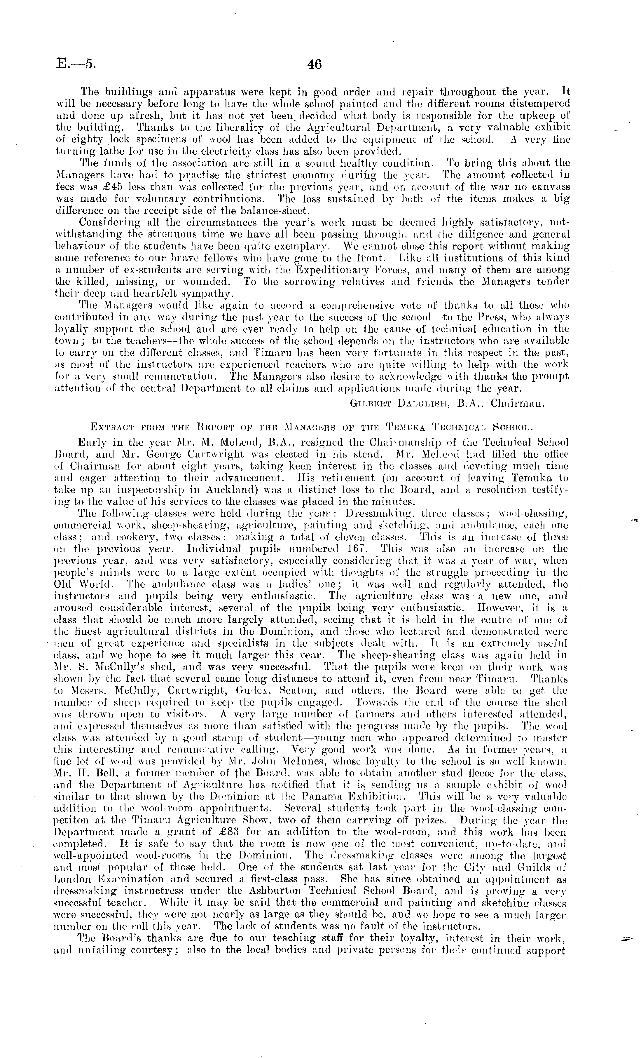 The buildings and apparatus were kept in good order and repair throughout the year. It will be necessary before long to have the whole school painted and the different rooms distempered and done up afresh, but it has not yet been, decided what body is responsible for tho upkeep of the building. Thanks to the liberality of the Agricultural Department) a very valuable exhibit of eighty lock specimens of wool has been added to the equipment of the school. A very fine turning-lathe for use in the electricity class has also been provided. The funds of the association are still in a sound healthy condition. To bring this about the .Managers have had to practise the strictest economy during the year. The amount collected in fees was £45 less than was collected for the previous year, and on account of the war no canvass was made for voluntary contributions. The loss sustained by both of the items makes a big difference on the receipt side of the balance-sheet. Considering all the circumstances the year's work must be deemed highly satisfactory, notwithstanding the strenuous time we have all been passing through, and the diligence and general behaviour of the students have been quite exemplary. We cannot close this report without making some reference to our brave fellows who have gone to the front. Like all institutions of this kind a number of ex-students are serving with the Expeditionary Forces, and many of them are among the killed, missing, or wounded. To the sorrowing relatives and friends the Managers tender their deep and heartfelt sympathy. The Managers would like again to accord a comprehensive vote of thanks to all those who contributed in any way? during the past year to the success of the school—to the Press, who always loyally support the school and are ever ready to help on the cause of technical education in the town; to the teachers —the whole success of the school depends on the instructors who are available to carry on the different classes, and Timaru has been very fortunate in this respect in the past, as most of the instructors are experienced teachers who are quite willing to help with the work for a Very small remuneration. The Managers also desire to acknowledge with thanks the prompt attention of the central Department to all claims and applications made dining the year. Gilbert DaLGLISH, 8.A., Chairman. Extract from the Report of the Managers of the Tioiuka Technical School. Early in the year Mr. M. McLeod, 8.A., resigned the Chairmanship of the Technical School Hoard, and Mr. George Cartwright was elected in his stead. Mr. McLeod had tilled the office of Chairman for about eight years, taking keen interest in the classes and devoting much time and eager attention to their advancement. His retirement (on account of leaving Tcmuka to take up an inspectorship in Auckland) was a distinct loss to the Board, and a resolution testifying to the value of his services to the classes was placed in the minutes. The following classes were held during the year: Dressmaking, three- classes; wool-classing, commercial work, sheep-shearing, agriculture, painting and sketching, and ambulance, each one class; and cookery, two classes: making a total of eleven classes. This is an increase of three on the previous year. Individual pupils numbered 167. This was also an increase on the previous year, and was very satisfactory, especially considering that it was a. year of war, when people's minds were to a large extent, occupied with thoughts of the struggle proceeding iv the Old World. The ambulance class was a ladies' one; it was well and regularly attended, the instructors and pupils being very enthusiastic. The agriculture class was a new one, and aroused considerable interest, several of the pupils being very enthusiastic. However, it is a class that should be much more largely attended, seeing that it is held in the centre of one of the finest agricultural districts in the Dominion, and those who lectured and demonstrated were men of great experience and specialists in the subjects dealt with. It is an extremely useful class, and we hope to see it much larger this year. The sheep-shearing class was again held in Mr. S. MoCully's shed, and was very successful. That the pupils were keen on their work was shown by (he fact that, several came long distances to attend it, even from near Timaru. Thanks to Messrs. MeCully, Cartwright, Oudc.x, Seaton, and others, the Hoard were able to get the number of sheep required to keep the pupils engaged. Towards the end of the course the shed was thrown open to visitors. A very large number of farmers and others interested attended, and expressed themselves as more than satisfied with the progress made by the pupils. The wool class was attended by a, good stamp of student —young men who appeared determined to master this interesting and remunerative calling. Very good work was done. As in former years, a fine lot of wool was provided by Mr. John Mclnnes, whose loyalty to the school is so well known. Mr. 11. Bell, a former member of the Board, was able to obtain another stud fleece for tho class, and the Department of Agriculture has notified that, it is sending us a sample exhibit of wool similar to that shown by the Dominion at the Panama, Exhibition. This will be a very valuable addition to the wool-room appointments. Several students took part in the wool-classing competitor! at the Timaru Agriculture Show, Woof them carrying off prizes. During (he year the Department made a grant of £83 for an addition to the wool-room, and this work has been completed. It, is safe to say that the room is now one of the most convenient, up-to-date, and well-appointed wool-rooms in the Dominion. The dressmaking classes were among the largest and most, popular of those held. One of the students sat last year for (he City and Guilds of London Examination and secured a (irst-class pass. She has since obtained an appointment as dressmaking instructress under the