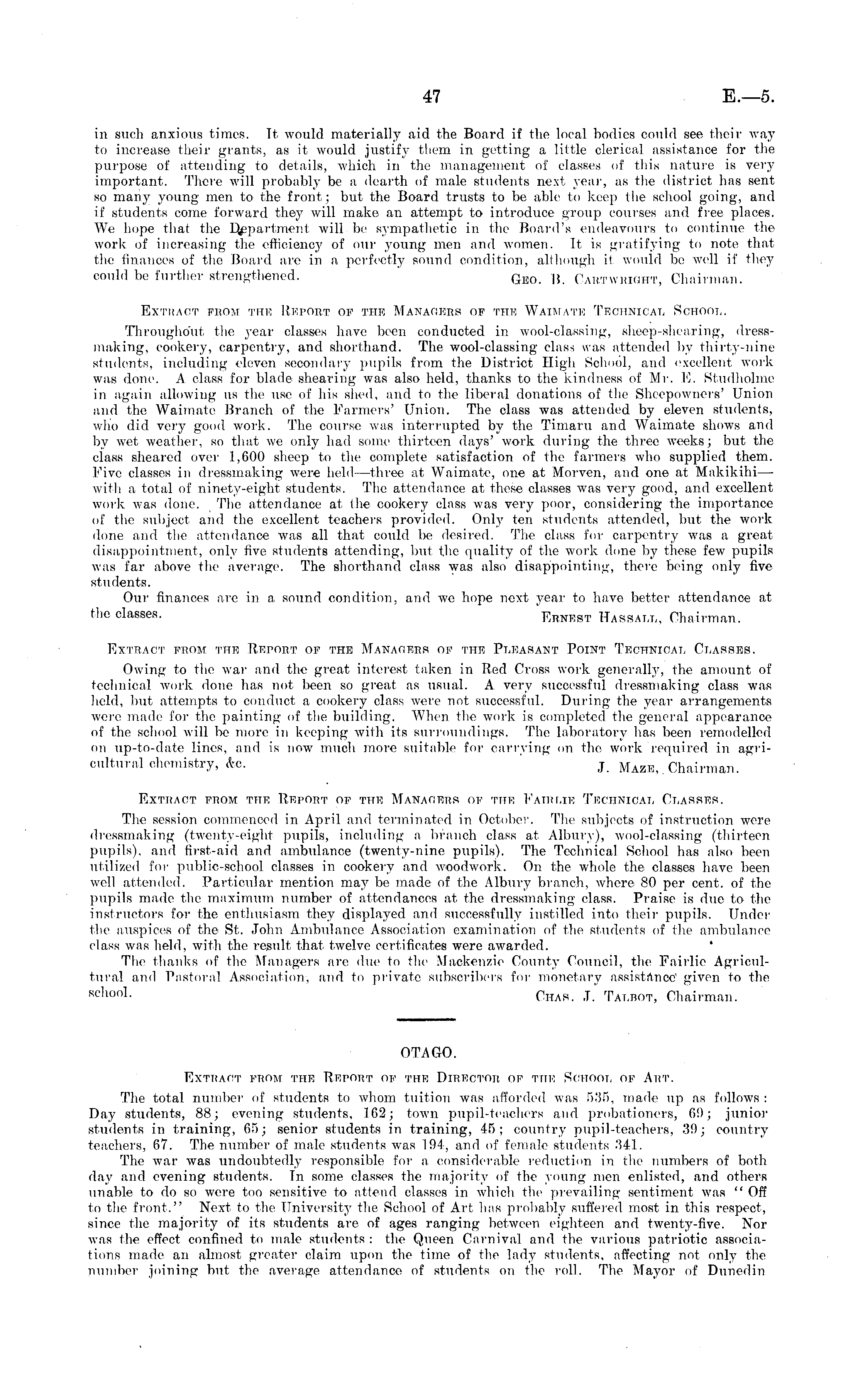 in such anxious times. It would materially aid the Board if the local bodies could see their way to increase their grants, as it would justify them in getting a, little clerical assistance for the purpose of attending to details, which in the management of classes of this nature is very important. There will probably be a dearth of male students next year, as the district has sent so many young men to the front; but the Board trusts to be able to keep the school going, and if students come forward they will make an attempt to introduce group courses and free places. We hope that the Department wdll be sympathetic in the Board's endeavours to continue the work of increasing the efficiency of our young men and women. It. is gratifying to note that the finances of the Board are in a, perfectly sound condition, although it would be well if they could be further strengthened. Geo , |j Cartwriqht, Chairman. Extract from the Report of the Managers of the Waimate Technical School. Throughout, the year classes have been conducted in wool-classing, sheep-shearing, dressmaking, cookery, carpentry, and shorthand. The wool-classing class was attended by thirty-nine students, including eleven secondary pupils from the District High School, and excellent work was done. A class for blade shearing was also held, thanks to the kindness of Mr. E. Studholme in again allowing us the use of his shed, and to tho liberal donations of the Sheepowncrs' Union and the Waimate Branch of the Farmers' Union. The class was attended by eleven students, who did very good work. The course was interrupted by the Timaru and Waimate shows and by wet weather, so that we only had some thirteen days' work during the three weeks; but the class sheared over 1,600 sheep to the complete satisfaction of the farmers who supplied them. Five classes in dressmaking were held —three at Waimate, one at Morven, and one at Makikihi — with a total of ninety-eight students. The attendance at these classes was very good, and excellent work was done. The attendance at the cookery class was very poor, considering the importance of the subject and the excellent teachers provided. Only ten students attended, but, the work done and the attendance was all that could be desired. The class for carpentry was a great disappointment, only five students attending, but the quality of the work done by these few pupils was far above the average. The shorthand class was also disappointing, there being only five students. Our finances arc in a sound condition, and wo hope next year to have better attendance at the classes. Ernest Hassall, Chairman. Extract from the Report of the Managers of the Pleasant Point Technical Classes. Owing to the war and the great interest taken in Red Cross work generally, the amount of technical work done has not been so great as usual. A very successful dressmaking class was held, but attempts to conduct a cookery class were not successful. During the year arrangements were made for the painting of the building. When the work is completed the general appearance of the school will be more in keeping with its surroundings. The laboratory has been remodelled on up-to-date lines, and is now much more suitable for carrying on the work required in agricultural chemistry, <fee. j Maze, . Chairman. Extract from the Report of the Managers ok the Fairlie Tuchnical Classes. The session commenced in April and terminated in October. The subjects of instruction were dressmaking (twenty-eight pupils, including a branch class at, Albury), wool-classing (thirteen pupils), and first-aid and ambulance (twenty-nine pupils). The Technical School has also been utilized for public-school, classes in cookery and woodwork. On the whole the classes have been well attended. Particular mention may be made of the Albury branch, where 80 per cent, of the pupils made the maximum number of attendances at the dressmaking class. Praise is due to the instructors for the enthusiasm they displayed and successfully instilled into their pupils. Under the auspices of the St. John Ambulance Association examination of the students of the ambulance class was held, with the result that, twelve certificates were awarded. The thanks of the Managers are duo to the Mackenzie County Council, the Fairiie Agricultural and Pastoral Association, and to private subscribers for monetary assistance' given to the school. Chas. J, Talbot, Chairman.