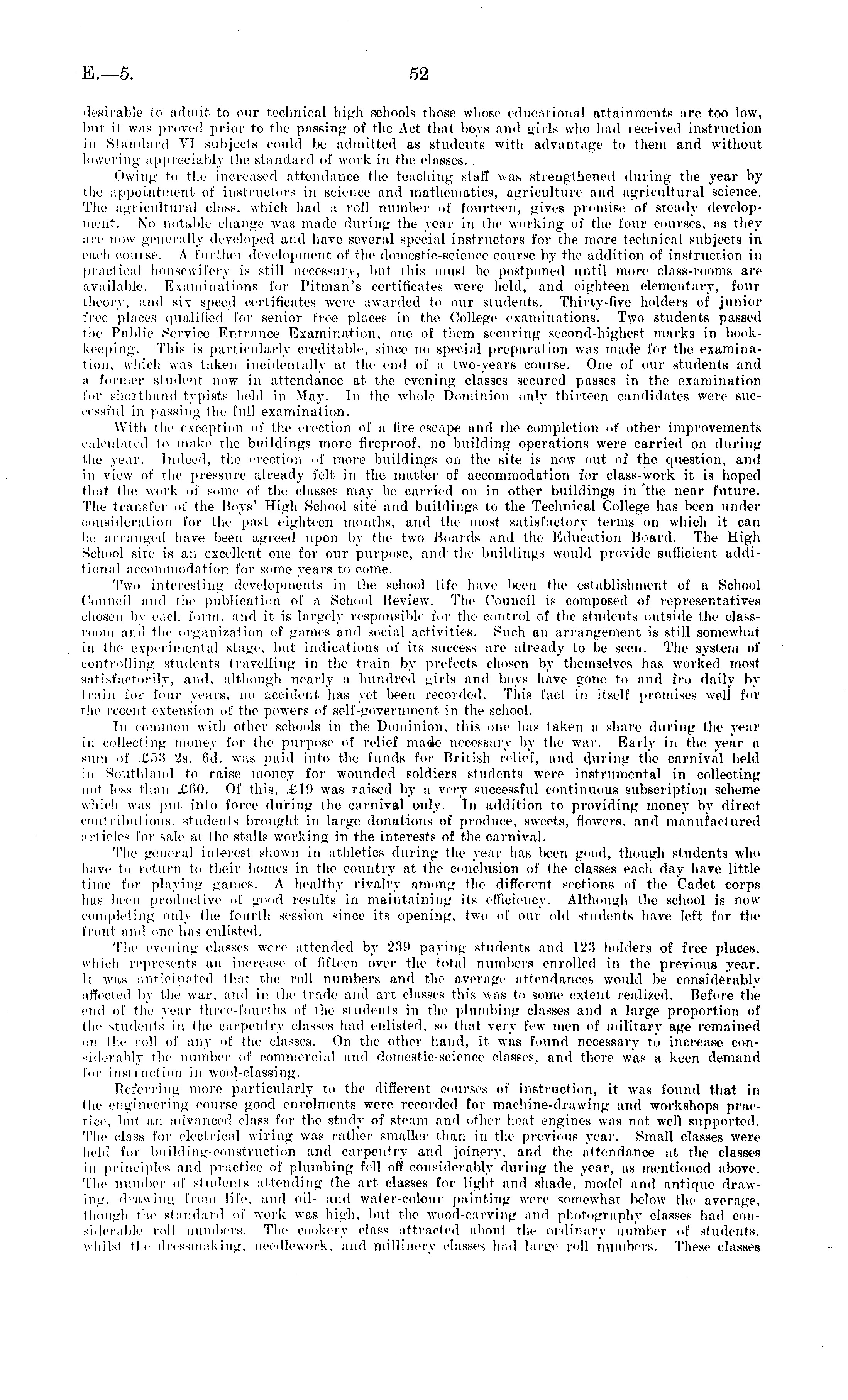 desirable to admit to our technical high schools those whose educational attainments are too low, but it was proved prior to the passing of the Act that boys and girls who had received instruction in Standard VI subjects could be admitted as students with advantage to them and without lowering appreciably the standard of work in the classes. Owing to the increased attendance the teaching staff was strengthened during the year by the appointment of instructors in science and mathematics, agriculture and agricultural science. The agricultural class, which had a roll number of fourteen, gives promise of steady development. No notable change was made during the year in the working of the four courses, as they are now generally developed and have several special instructors for the more technical subjects in each course. A further development, of the domestic-science course by the addition of instruction in practical housewifery is still necessary, but this must be postponed until more class-rooms are available. Examinations for Pitman's certificates were held, and eighteen elementary, four theory, and six speed certificates were awarded to our students. Thirty-five holders of junior free places qualified for senior free places in the College examinations. Two students passed the Public Service Entrance Examination, one of them securing second-highest marks in bookkeeping. This is particularly creditable, since no special preparation was made for the examination, which was taken incidentally at the end of a two-years course. One of our students and a former student now in attendance at the evening classes secured passes in the examination for shorthand-typists held in May. In the whole Dominion only thirteen candidates were successful in passing the full examination. With the exception of the erection of a fire-escape and the completion of other improvements calculated to make the buildings more fireproof, no building operations were carried on during the year. Indeed, the erection of more buildings on the site is now out of the question, and in view of the pressure already felt in the matter of accommodation for class-work it, is hoped that the work of some of the classes may be carried on in other buildings in "the near future. The transfer of the Boys' High School site and buildings to the Technical College has been under consideration for the past eighteen months, and the most satisfactory terms on which it can be arranged have been agreed upon by the two Boards and the Education Board. The High School site is an excellent one for our purpose, and the buildings would provide sufficient additional accommodation for some years to come. Two interesting developments in the school life have been the establishment of a School Council and the publication of a School Review. The Council is composed of representatives chosen by each form, and it is largely responsible for the control of the students outside the classroom and the organization of games and social activities. Such an arrangement is still somewhat in the experimental stage, but indications of its success are already to be seen. The system of controlling students travelling in the train by prefects chosen by themselves has worked most satisfactorily, and, although nearly a hundred girls and boys have gone to and fro daily by train for four years, no accident has yet been recorded. This fact in itself promises well for the recent extension id' the powers of self-government in the school. In common with other schools in the Dominion, this one has taken a share during the year in collecting money for the purpose of relief made necessary by the war. Early in the year a sum of £53 2s. 6d. was paid into the funds for British relief, and during the carnival held in Southland to raise money for wounded soldiers students were instrumental in collecting not less than £60. Of this, £19 was raised by a very successful continuous subscription scheme which was put into force during the carnival only. In addition to providing money by direct contributions, students brought in large donations of produce, sweets, flowers, and manufactured articles for sale at the stalls working in the interests of the carnival. The general interest shown in athletics during the year has been good, though students who have to return to their homes in the country at the conclusion of the classes each day have little time for playing games. A healthy rivalry among the different sections of the Cadet, corps has been productive of good results in maintaining its efficiency. Although the school is now completing Only the fourth session since its opening, two of our old students have left for the front and one has enlisted. The evening classes were attended by 239 paying students and 123 holders of free places, which represents an increase of fifteen over the total numbers enrolled in the previous year. It was anticipated that the roll numbers and the average attendances would be considerable affected by the war, and in the trade and art classes this was to some extent realized. Before the end of the year three-fourths of the students in the plumbing classes and a large proportion of the students in the carpentry classes had enlisted, so that very few men of military age remained mi the roll of any of the classes. On the other hand, it was found necessary to increase considerably the number of commercial and domestic-science classes, and there was a keen demand for instruction in wool-classing. Referring more particularly to the different courses of instruction, it was found that in the engineering course good enrolments were recorded for machine-drawing and workshops practice, but an advanced class for the study of steam and other heat engines was not well supported. The class for electrical wdring was rather smaller than in the previous year. Small classes were held for building-construction and carpentry and joinery, and the attendance at the classes in principles and p