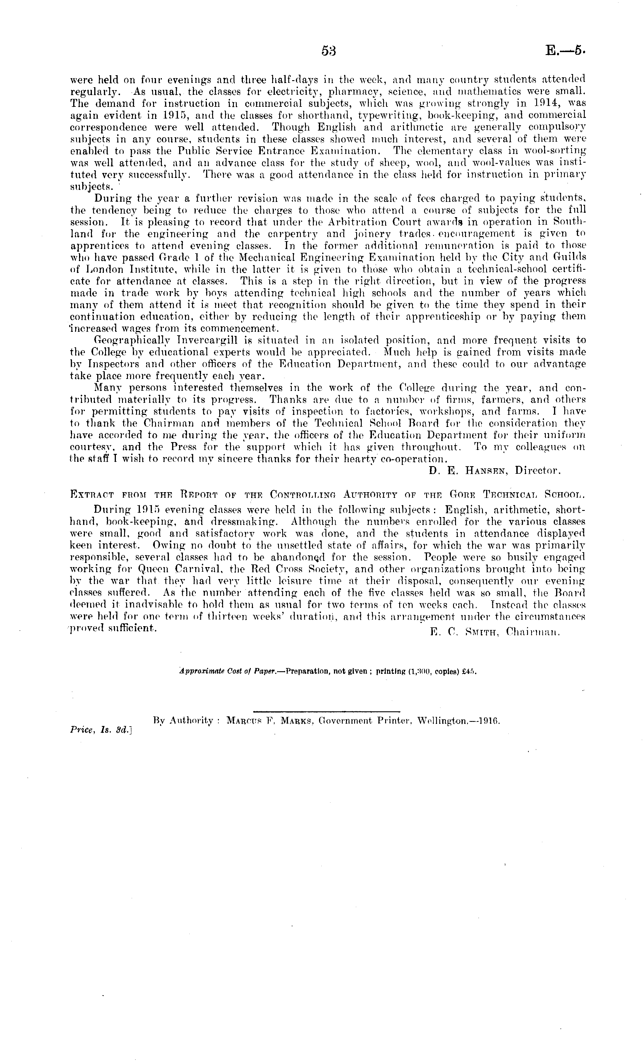were held on four evenings and three half-days in the week, and many country students attended regularly. As usual, the classes for electricity, pharmacy, science, and mathematics were small. The demand for instruction in commercial subjects, which was growing strongly in 1914, was again evident in 1915, and the classes for shorthand, typewriting, book-keeping, and commercial correspondence were well attended. Though English and arithmetic are generally compulsory subjects in any course, students in these classes showed much interest, and several oi them were enabled to pass the Public Service Entrance Examination. The elementary class in wool-sorting was well attended, and an advance class for the study of sheep, wool, and wool-values was instituted very successfully. There was a good attendance in the class held for instruction in primary subjects. During the year a further revision was made in the scale of fees charged to paying students, the tendency being to reduce the charges to those who attend a course of subjects for the full session. It is pleasing to record that under the Arbitration Court awards in operation in Southland for the engineering and the carpentry and joinery trades-encouragement is given to apprentices to attend evening classes. In the former additional remuneration is paid to those 1 who have passed Grade 1 of the Mechanical Engineering Examination held by the City and Guilds of London Institute, while in the latter it is given to those who obtain a technical-school certificate for attendance at classes. This is a step in the right direction, but in view of the progress made in trade work by boys attending technical high schools and the number of years which many of them attend it is meet that recognition should be given to the time they spend in their continuation education, either by reducing the length of their apprenticeship or by paying them 'increased wages from its commencement. Geographically Invorcargill is situated in an isolated position, and more frequent visits to the College by educational experts would be appreciated, Much help is gained from visits made by Inspectors and other officers of the Education Department, and these could to our advantage take place more frequently each year. Many persons interested themselves in the work of the College during the year, and contributed materially to its progress. Thanks are due to a number of firms, farmers, and others for permitting students to pay visits of inspection to factories, workshops, and farms. I have to thank the Chairman and members of the Technical School Board for the consideration they have accorded to me during the year, the officers of the Education Department for their uniform courtesy, and the Press for the support which it has given throughout. To my colleagues on the staff I wish to record my sincere thanks for their hearty co-operation. D. E. Hansen, Director. Extract from the Report of the Controlling Authority of the Gore Technical School. During 1915 evening classes were held in the following subjects: English, arithmetic, shorthand, book-keeping, and dressmaking. Although the numbers enrolled for the various classes were small, good and satisfactory work was done, and the students in attendance displayed keen interest. Owing no doubt to the unsettled state of affairs, for which the war was primarily responsible, several classes had to be abandoned for the session. People were so busily engaged working for Queen Carnival, the Red Cross Society, and other organizations brought into being by the war that they had very little leisure time at their disposal, consequently our evening classes suffered. As the number attending each of the five classes held was so small, the Board deemed it inadvisable to hold them as usual for two terms of ten weeks each. Instead the classes were held for- one term of thirteen weeks' duration, and this arrangement under the circumstances proved sufficient. " R <-. gMITH] Chairman.