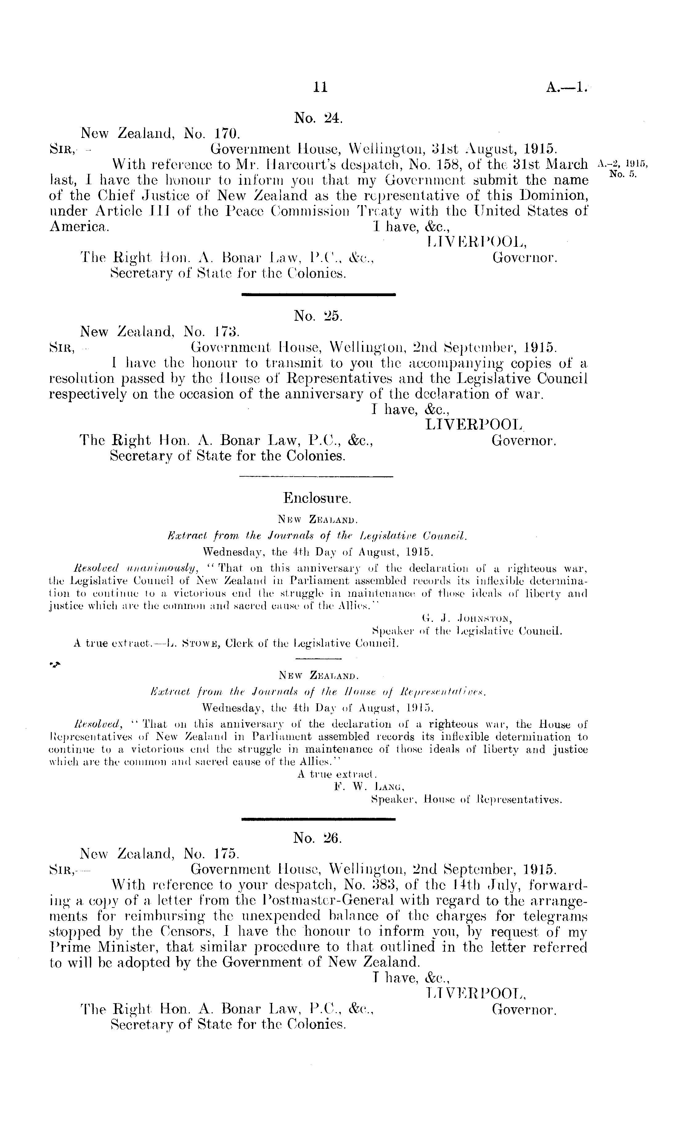 No. 25. New Zealand, No. 173. Sir, - Government House, Wellington, 2nd September, 1915. I have the honour to transmit to you the accompanying copies of a resolution passed by the House of Representatives and the Legislative Council respectively on the occasion of the anniversary of the declaration of war. I have, &c, LIVERPOOL The Right Hon. A. Bonar Law, P. 0., &c, Governor. Secretary of State for the Colonies.