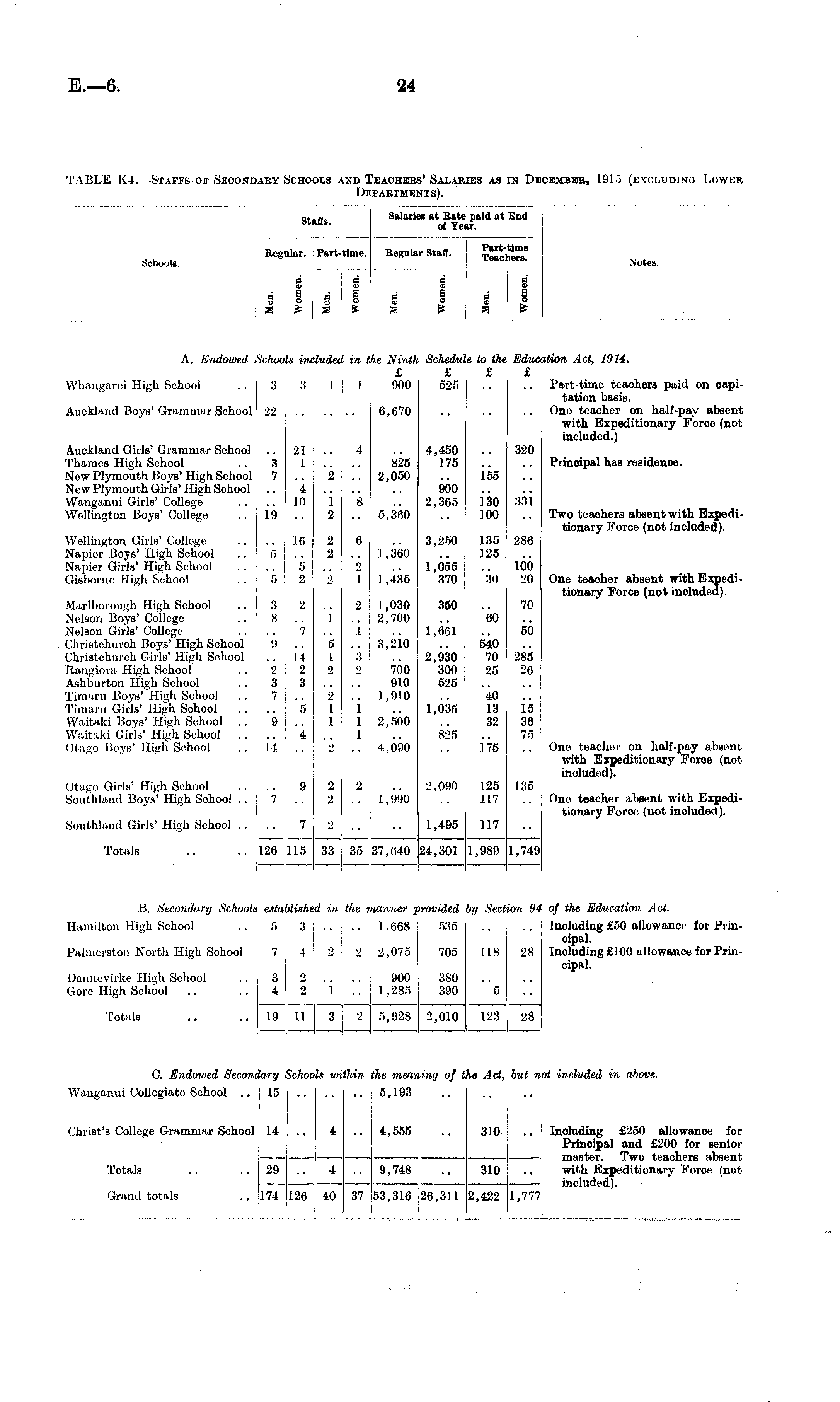 TABLE K4.—Staffs of Secondary Schools and Teachers' Salaries as in December, 1915 (excluding Lower Departments).
