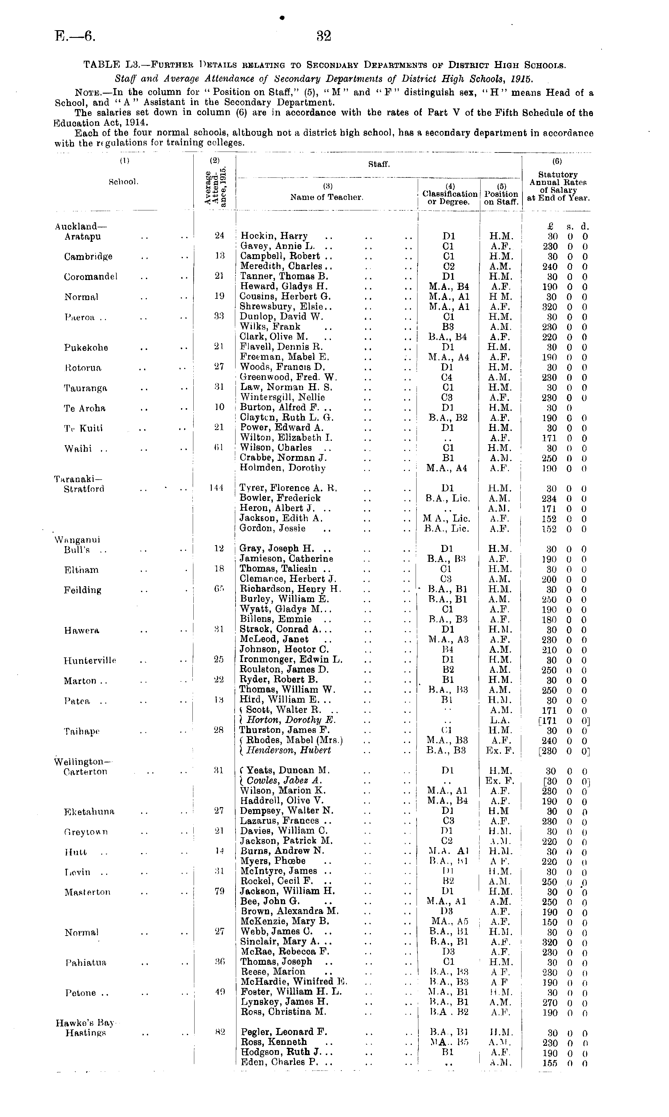Note. —In the column for ' School, and "A" Assistant in i The salaries set down in co Eduoation Act, 1914. Each of the four normal scl with the rigulations for training ir >r " Posit: n the Set column i "Poi the f olumi hools : ooiit fcion on Staff," (5), "M" and "P" distinguish sex, "H" means Head of a icondary Department. (6) are in accordance with the rates of Part V of the Fifth Schedule of the schools, a ng college although not a district high school, has a secondary department in accordance es. (l) (2) « ' 3 SPSS ,£oS >-<i Si (2) Staff. (G) School. 8-8® _ , Statutory ,.., ... , r . Annual Kates (•■>) W (5) 0 f Unlaw Name of Teacher. <_?$%£r ™S at End of yW. Auckland— Aratapu 24 24 £ a. A. Hockin, Harry .. .. .. Dl H.M. 30 0 0 Gavey, Annie L. .. .. .. CI ; A.F. 230 0 0 Campbell, Bobert .. .. .. CI H.M. 30 0 0 Meredith, Charles.. .. .. C2 A.M. 240 0 0 Tanner, Thomas B. .. .. Dl H.M. ! 30 0 0 Howard, Gladys H. .. .. M.A., B4 A.F. 190 0 0 Cousins, Herbert G. .. .. M.A., Al H M. 30 0 0 Shrewsbury, Elsie.. .. .. M.A., Al A.F. 320 0 0 Dunlop, David W. .. '.. CI H.M. 30 0 0 Wilks, Frank .. .. .. B3 A.M. 230 0 0 Clark, Olive M. .. .. .. B.A., B4 A.F. 220 0 0 Fl avail, Dennis R. .. .. Dl H.M. 30 0 0 Freeman, Mabel E. .. .. M.A., A4 A.F. ISO 0 0 Woods, Franois D. .. .. Dl H.M. 30 0 0 Greenwood, Fred. W. .. .. C4 A.M. 230 0 0 Law, Norman H. S. .. .. CI H.M. 30 0 0 Wintersgill, Nellie .. .. 03 A.F. '. 230 0 0 Burton, Alfred F. .. .. .. Dl H.M. 30 0 Claytcn, Ruth L. G. .. .. B.A., B2 A.F. 190 0 0 Power, Edward A. .. .. Dl H.M. 30 0 0 Wilton, Elizabeth I. .. .. .. A.F. 171 0 0 Wilson, Charles .. .. .. CI H.M. 30 0 0 Crabbe, Norman J. .. .. Bl A.M. 250 0 0 Holmden, Dorothy .. .. M.A., A4 A.F. 190 0 0 Cambridge 18 18 Coromandel 21 21 Normal .. 19 19 Paeroa 33 33 Pukekohe 21 21 Rotorua 27 27 Tauranga 81 81 Te Aroha 10 10 Te Kuiti 21 21 Waihi .. 61 61 Taranaki— Stratford 144 144 Tyrer, Florence A. R. .. .. Dl H.M. ; 30 0 0 Bowler, Frederick .. .. B.A., Lie. A.M. 234 0 0 Heron, Albert J. .. .. .. .. A.M. 171 0 0 Jackeon, Edith A. .. .. MA., Lie. A.F. 152 0 0 Gordon, Jessie .. .. .. B.A., Lie. A.F. 152 0 0 Wanganui Bull's .. 12 Eltham Feilding Hawera Huntervillc 18 65 31 25 Gray, Joseph H. .. .. .. Dl H.M. i 30 0 0 Jamieson, Catherine .. B.A., B8 A.F. 190 0 0 Thomas, Taliesin .. .. .. CI H.M. ! 30 0 0 Clemance, Herbert J. .. .. 03 A.M. : 200 0 0 Riohardson, Henry H. .. .. • B.A., Bl H.M. 30 0 0 Burloy, William E. .. .. B.A., Bl A.M. 250 0 0 Wyatt, Gladys M... .. .. CI A.F. 190 0 0 Billons, Emmie .. .. .. B.A., B3 A.F. 180 0 0 Straok, Conrad A. .. .. .. Dl H.M. 30 0 0 McLeod, Janet .. .. .. M.A., A3 A.F. 230 0 0 Johnson, Hector C. .. .. B4 A.M. 210 0 0 Ironmonger, Edwin L. .. .. Dl H.M. 30 0 0 Roulston, James D. .. .. B2 A.M. 250 0 0 Ryder, Robert B. .. .. Bl H.M. ' 30 0 0 Thomas, William W. .. .. ' B.A., B8 A.M. 250 0 0 Hird, William E. .. .. .. Bl H.M. | 30 0 0 j Soott, Walter R .. •• A.M. I 171 0 0 \ Jlorton, Dorothy E. .. .. .. L.A. ! [171 0 0] Thurston, James F. .. .. 01 H.M. 30 0 0 f Rhodes, Mabel (Mrs.) .. .. M.A., B3 A.F. j 240 0 0 {Henderson, Hubert .. .. B.A., B3 Ex. F. ! [230 0 0] Marton 22 Patea la Taihape 28 Wellington— Carterton 31 C Yeats, Duncan M. .. .. Dl H.M. 30 0 0 {Cowles, Jabez A. .. .. .. Ex. F. [30 0 0] Wilson, Marion K. .. .. M.A., Al A.F. 230 0 0 Haddrell, Olive V. .. .. M.A., B4 ( A.F. 190 0 0 Dempsey, Walter N. .. .. Dl H.M 30 0 0 Lazarus, Frances .. .. .. C3 A.F. 230 0 () Davies, William C. .. .. Dl H.M. 30 0 o Jackson, Patrick M. .. .. C2 A.M. 220 0 0 Burns, Andrew N. .. .. M.A. Al H.M. 30 0 0 Myers, Phoebe .. .. .. 11.A., hi A V. 220 0 0 Mclntyre, James .. .. j Dl H.M. 30 0 o Rockei, Cecil F. .. .. .. B2 \ A.M. 250 0 0 Jackson, William H. .. .. Dl H.M. 30 0 0 Bee, John G. .. .. .. M.A., Al A.M. 250 0 0 Brown, Alexandra M. .. .. D3 A.F. 190 0 0 MoKenzie, Mary B. .. .. MA., A5 I A.F. 150 0 0 Webb, James 0. .. .. .. B.A., Bl ; H.M. 30 0 0 Sinclair, Mary A. .. .. .. B.A., Bl A.F. ' 320 0 0 McRae, Robecoa F. .. .. D3 A.F. 230 0 0 Thomas, Joseph .. .. .. 01 H.M. 30 0 0 Reose, Marion .. .. .. B.A., B3 A F. 230 0 0 MoHardie, Winifred 10, B.A., B3 AF 190 0 0 Foster, William H. L. .. M.A., Bl H.M. ; 30 0 0 Lynskey, James H. .. .. B.A., Bl A.M. , 270 0 0 Ross, Christina M. .. .. B.A . B2 A.F. I 190 0 0 Eketahuna 27 fireytown 21 Hutt .. 14 Levin 31 Masterton 79 Normal 27 Pahiatua 86 Potone 49 Hawko's Bay Hastings 82 Pegler, Leonard F. .. .. B.A, Bl H.M. ' 30 0 0 Ross, Kenneth .. .. .. MA. B5 A.M. 230 0 0 Hodgson, Ruth J. .. .. .. Bl A.F. 190 0 0 Eden, Charles P. .. .. .. .. I A.M. 155 0 0