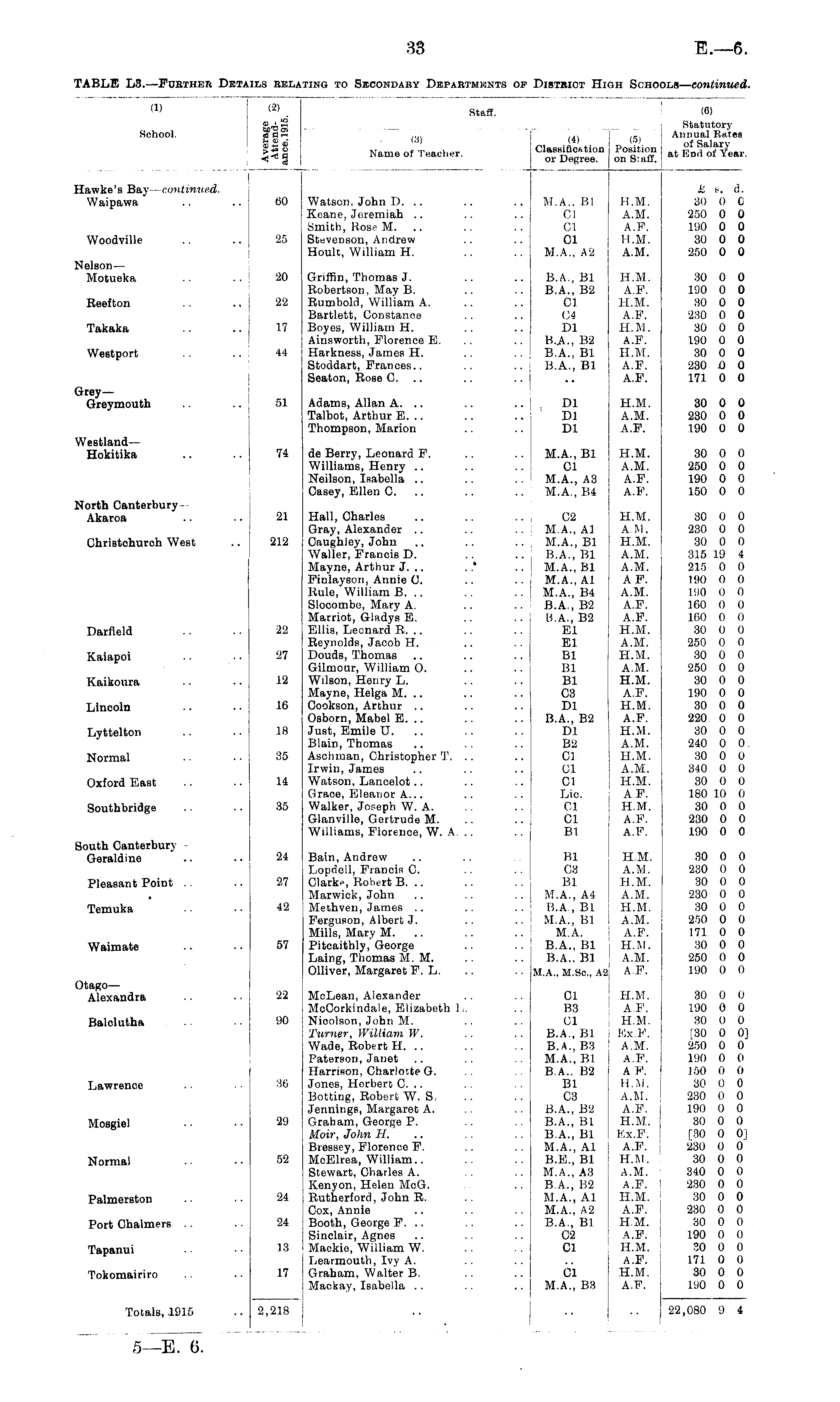(1) School. (2) M I " Staff. (3) Name of Teacher. (4) Classification or Degree. (4) Classification or Degree. (G) Statutory , r . ' Annual Rates p 'iVi ! of Salary o P nfa 0 ff n JatF.ndofYear. I Hawke's Bay— continued. Waipawa 60 Watson. John D. Keane, Jeremiah Smith, Rose M. .. Stevenson, Andrew Hoult, William H. .. M.A.. Bl 01 CI 01 M.A., A2 H.M. A.M. A.F. H.M. A.M. £ a. A. 30 0 C 250 0 0 190 0 0 30 0 0 250 0 0 Woodville 25 Nelson— Motueka 20 Griffin, Thomas J. Robertson, May B. Rumbokl, William A. Bartlett, Constance Boyes, William H. Ainsworth, Florence E. Harkness, James H. Stoddart, Frances.. Seaton, Rose C. B.A..B1 .. B.A..B2 CI 04 Dl B.A., B2 B.A., Bl B.A., Bl H.M. A.F. H.M. A.F. H.M. A.F. H.M. A.F. A.F. 30 0 0 190 0 0 30 0 0 230 0 0 30 0 0 190 0 0 30 0 0 230 0 0 171 0 0 Reefton 22 Takaka 17 Westport 44 Grey— Greymouth 51 Adams, Allan A. .. Talbot, Arthur E. .. Thompson, Marion Dl Dl Dl H.M. A.M. A.F. 30 0 0 230 0 0 190 0 0 Westland — Hokitika 74 de Berry, Leonard F. Williams, Henry Neilson, Isabella Casey, Ellen C. .. .. M.A..B1 01 M.A., A3 .. M.A..B4 H.M. A.M. A.F. A.F. 30 0 0 250 0 0 190 0 0 150 0 0 North CanterburyAkaroa 21 Hall, Charles Gray, Alexander Oaughloy, John Waller, Francis D. Mayno, Arthur J. .. .,' Finlayson, Annie 0. Rule, William B. .. Slocombc, Mary A. Marriot, Gladys E. Ellis, Leonard R. .. Reynolds, Jacob H. Douds, Thomas Gilmour, William O. Wilson, Henry L. Mayne, Holga M. .. Cookson, Arthur Osborn, Mabel E. .. Just, Emile U. Blain, Thomas Ascbman, Christopher T. .. Irwin, James Watson, Lancelot Grace, Eleanor A... Walker, Joseph W. A. Glanvillo, Gertrude M. Williams, Florence, W. A. .. .. i 02 M.A., Al .. I M.A., Bl .. : B.A., Bl .. ! M.A., Bl .. I M.A..A1 .. M.A., B4 .. B.A..B2 B.A., B2 El El Bl Bl Bl 03 Dl B.A., B2 Dl B2 CI 01 01 Lie. 01 CI B1 H.M. A.M. H.M. A.M. A.M. AF. A.M. A.F. A.F. H.M. A.M. H.M, A.M. H.M. A.F. H.M. A.F. H.M. A.M. H.M. A.M. H.M. AF. H.M. A.F. A.F. 30 0 0 230 0 0 80 0 0 315 19 4 215 0 0 190 0 0 190 0 0 160 0 0 160 0 0 80 0 0 250 0 0 30 0 0 250 0 0 30 0 0 190 0 0 30 0 0 220 0 0 30 0 0 240 0 0 30 0 0 340 0 0 30 0 0 180 10 0 30 0 0 230 0 0 190 0 0 21 Christohuroh West 212 212 Darfield 22 22 Kaiapoi 27 27 Kaikoura 12 12 Lincoln 10 16 Lyttelton 18 18 Normal 35 35 Oxford East 14 14 Southbridge 35 35 South Canterbury Geraldine 24 24 Bain, Andrew Lopdoll, Francis C. Clark-, Robert B. .. Marwick, John Methven, James Ferguson, Albert J. Mills, Mary M. .. Pitcaitbly, George Laing, Thomas M. M. Ollivcr, Margaret F. L. Bl 08 Bl .. M.A., A4 B.A, Bl .. M.A., Bl M.A. B.A., Bl B.A..B1 ■ ■ M.A., M.Sc., A2 H.M. A.M. H.M. A.M. H.M. A.M. A.F. H.M. A.M. A.F. 30 0 0 230 0 0 30 0 0 230 0 0 30 0 0 250 0 0 171 0 0 30 0 0 250 0 0 190 0 0 Pleasant Point .. 27 27 Temuka 42 42 Waimate 57 57 Otago— Alexandra 22 22 McLean, Alexander McCorkindale, Elizabeth 1,. Nioolson, John M. Turner, William W. Wade, Robert H. .. Paterson, Janet Harrison, Charlotte G. Jones, Horbert C. .. Botting, Robert W. S, Jennings, Margaret A. Graham, George P. Moir, John II. Bressey, Florence F. McElrea, William.. Stewart, Charles A. Kenyon, Helen McG. Rutherford, John R. Cox, Annie Booth, George F. .. Sinclair, Agnes Mackio, William W. Learmouth, Ivy A. Graham, Walter B. Mackay, Isabella .. 01 B3 01 B.A..B1 i B.A., B3 M.A., Bl B.A., B2 Bl C3 B.A., B2 B.A., Bl B.A., Bl .. M.A., Al B.E., Bl .. M.A., A3 B.A., B2 M.A., Al M.A., A2 B.A., Bl 02 01 '.'. 01 M.A., B3 H.M. A.F. H.M. Ex F. A.M. A.F. A F. H.M. A.M. A.F. H.M. Ex.F. A.F. H.M. A.M. A.F. H.M. A.F. H.M. A.F. H.M. A.F. H.M. A.F. 30 0 0 190 0 0 30 0 0 [30 0 0] 250 0 0 190 0 0 150 0 0 30 0 0 230 0 0 190 0 0 30 0 0 [30 0 0] 230 0 0 30 0 0 340 0 0 230 0 0 80 0 0 230 0 0 30 0 0 190 0 0 30 0 0 171 0 0 30 0 0 190 0 0 Balclutha 90 90 Lawrence 36 36 Mosgiel 29 29 Normal 52 52 Palmerston 24 24 Port Chalmers .. 24 24 Tapanui 13 13 Tokomairiro 17 17 Totals, .1915 .. 2,218 2,218 22,080 9 4