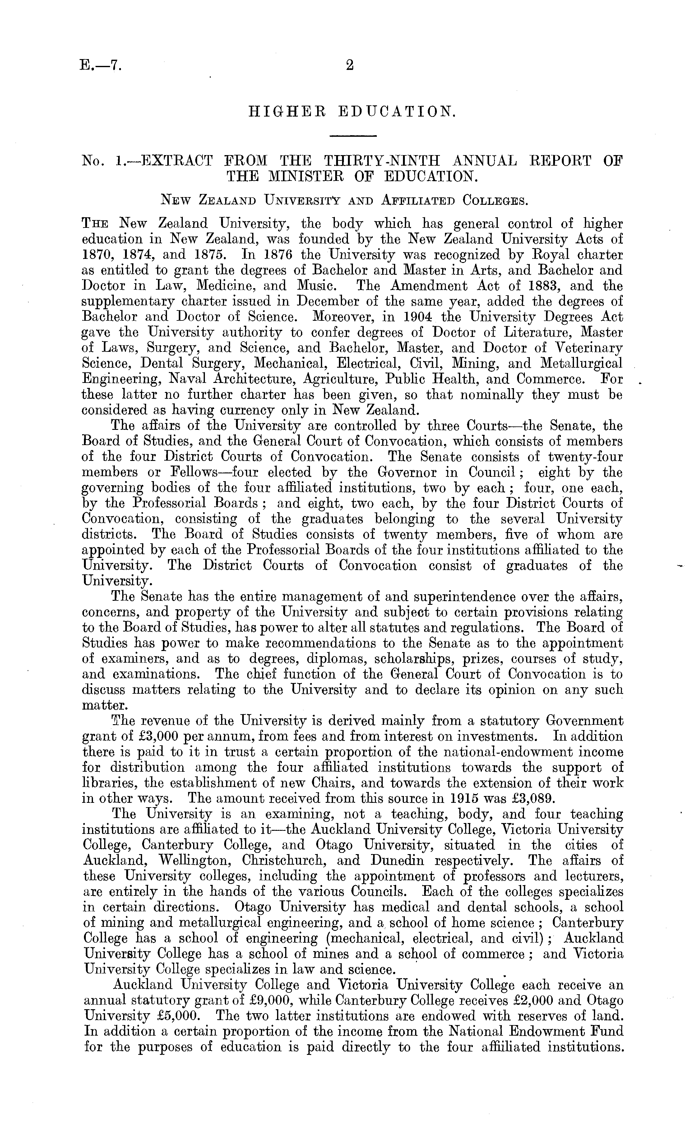 HIGHER EDUCATION. No. I.—EXTRACT FROM THE THIRTY-NINTH ANNUAL REPORT OF THE MINISTER OF EDUCATION. New Zealand University and Affiliated Colleges. The New Zealand University, the body which has general control of higher education in New Zealand, was founded by the New Zealand University Acts of 1870, 1874, and 1875. In 1876 the University was recognized by Royal charter as entitled to grant the degrees of Bachelor and Master in Arts, and Bachelor and Doctor in Law, Medicine, and Music. The Amendment Act of 1883, and the supplementary charter issued in December of the same year, added the degrees of Bachelor and Doctor of Science. Moreover, in 1904 the University Degrees Act gave the University authority to confer degrees of Doctor of Literature, Master of Laws, Surgery, and Science, and Bachelor, Master, and Doctor of Veterinary Science, Dental Surgery, Mechanical, Electrical, Civil, Mining, and Metallurgical Engineering, Naval Architecture, Agriculture, Public Health, and Commerce. For these latter no further charter has been given, so that nominally they must be considered as having currency only in New Zealand. The affairs of the University are controlled by three Courts—the Senate, the Board of Studies, and the General Court of Convocation, which consists of members of the four District Courts of Convocation. The Senate consists of twenty-four members or Fellows—four elected by the Governor in Council; eight by the governing bodies of the four affiliated institutions, two by each ; four, one each, by the Professorial Boards ; and eight, two each, by the four District Courts of Convocation, consisting of the graduates belonging to the several University districts. The Board of Studies consists of twenty members, five of whom are appointed by each of the Professorial Boards of the four institutions affiliated to the University. The District Courts of Convocation consist of graduates of the University. The Senate has the entire management of and superintendence over the affairs, concerns, and property of the University and subject to certain provisions relating to the Board of Studies, has power to alter all statutes and regulations. The Board of Studies has power to make recommendations to the Senate as to the appointment of examiners, and as to degrees, diplomas, scholarships, prizes, courses of study, and examinations. The chief function of the General Court of Convocation is to discuss matters relating to the University and to declare its opinion on any such matter. The revenue of the University is derived mainly from a statutory Government grant of £3,000 per annum, from fees and from interest on investments. In addition there is paid to it in trust a certain proportion of the national-endowment income for distribution among the four affiliated institutions towards the support of libraries, the establishment of new Chairs, and towards the extension of their work in other ways. The amount received from this source in 1915 was £3,089. The University is an examining, not a teaching, body, and four teaching institutions are affiliated to it—the Auckland University College, Victoria University College, Canterbury College, and Otago University, situated in the cities of Auckland, Wellington, Christchurch, and Dunedin respectively. The affairs of these University colleges, including the appointment of professors and lecturers, are entirely in the hands of the various Councils. Each of the colleges specializes in certain directions. Otago University has medical and dental schools, a school of mining and metallurgical engineering, and a school of home science ; Canterbury College has a school of engineering (mechanical, electrical, and civil); Auckland University College has a school of mines and a school of commerce ; and Victoria University College specializes in law and science. Auckland University College and Victoria University College each receive an annual statutory grant of £9,000, while Canterbury College receives £2,000 and Otago University £5,000. The two latter institutions are endowed with reserves of land. In addition a certain proportion of the income from the National Endowment Fund for the purposes of education is paid directly to the four affiiliated institutions.