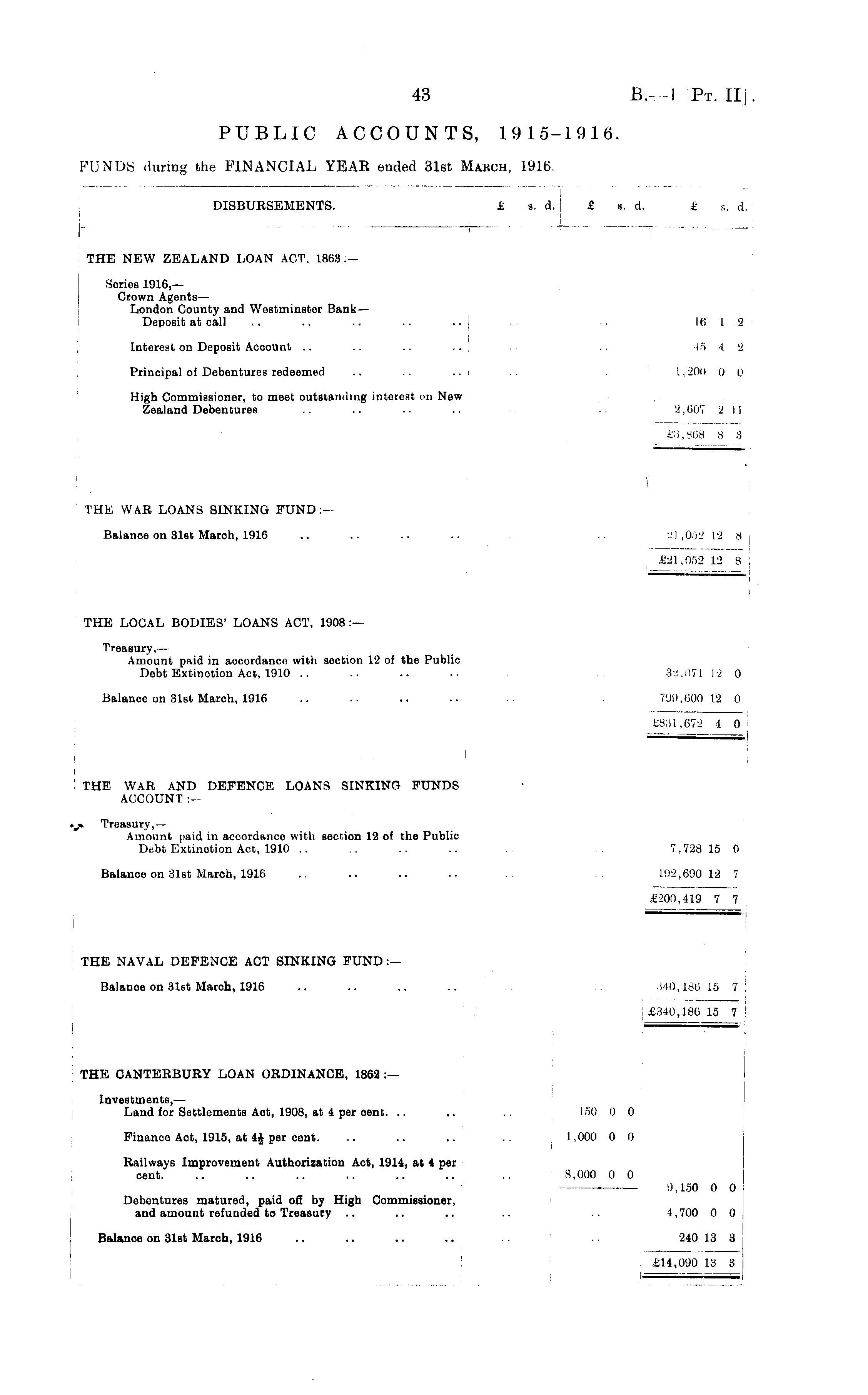 DISBURSEMENTS. _ £ s. d. £ s. d. £ s. d. _ J THE NEW ZEALAND LOAN ACT, 1863:Series 1916,— Crown Agents— London County and Westminster BankDeposit at call 16 1 2 Interest on Deposit Acoount 15 4 2 Principal of Debentures redeemed .. .. .. I 1,200 0 0 High Commissioner, to meet outstanding interest on New Zealand Debentures '.!. OCT S 11 £8,868 8 3 THE WAR LOANS SINKING FUND :- Balance on 31st Maroh, 1916 21,052 12 8 £21,052 12 8 THE LOCAL BODIES' LOANS ACT, 1908 :— Treasury,— Amount paid in aocordanoo with section 12 of the Public Debt Extinction Aot, 1910 3-J.071 12 0 Balance on 31st March, 1916 799,600 12 0 £831,672 4 0 I I ' THE WAR AND DEFENCE LOANS SINKING FUNDS ACCOUNT :— j* Treasury,— Amount paid in accordance with Bection 12 of the Public Debt Extinction Act, 1910 7,728 15 0 Balance on 31st March, 1916 192,690 12 7 G.tr\r\ Aid rt n £200,419 7 7 £200,419 7 7 THE NAVAL DEFENCE ACT SINKING FUND :— Balance on 31st March, 1916 ■ ill), 180 15 7 £340,186 15 7 THE CANTERBURY LOAN ORDINANCE, 1862 :— Investments, — Land for Settlements Act, 1908, at 4 per oent. .. .. 150 0 0 Finance Aot, 1915, at 4& per cent. 1,000 0 0 Railways Improvement Authorization Act, 1914, at 4 per oent. Debentures matured, paid off by High Commissioner, and amount refunded to Treasury Balanoe on 31st March, 1916 8,000 0 0 9,150 0 0 4,700 0 0 240 13 3 £14,090 13 8
