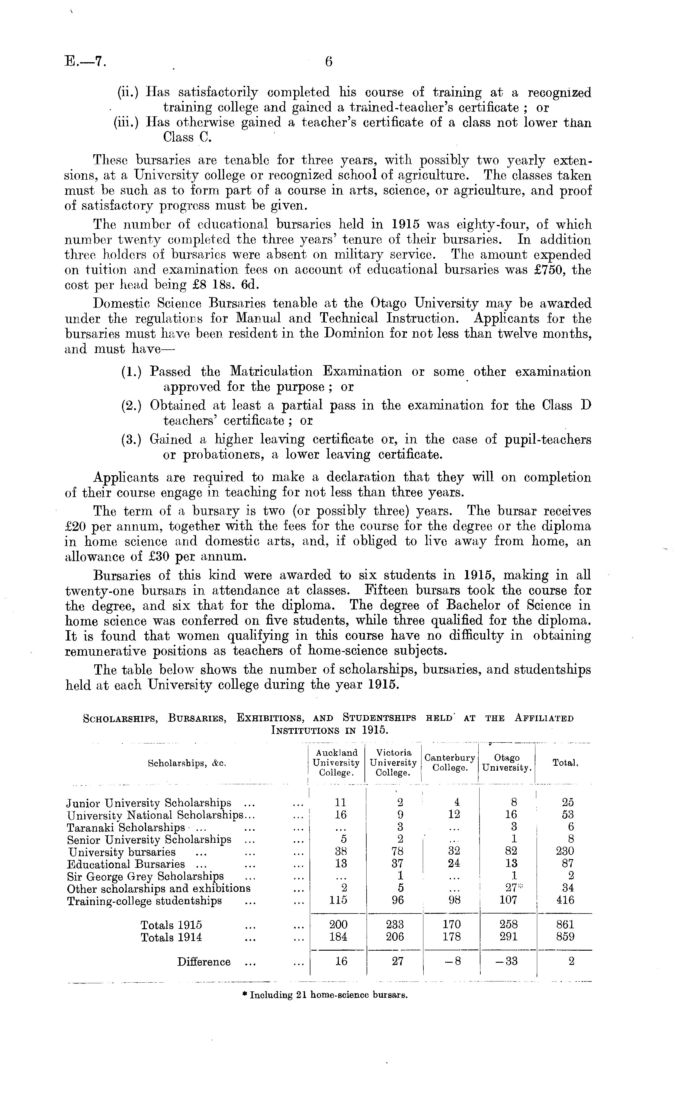(ii.) Has satisfactorily completed his course of training at a recognized training college and gained a trained-teacher's certificate ; or (iii.) Has otherwise gained a teacher's certificate of a class not lower than Class C. These bursaries are tenable for three years, with possibly two yearly extensions, at a University college or recognized school of agriculture. The classes taken must be such as to form part of a course in arts, science, or agriculture, and proof of satisfactory progress must be given. The number of educational bursaries held in 1915 was eighty-four, of which number twenty completed the three years' tenure of their bursaries. In addition three holders of bursaries were absent on military service. The amount expended on tuition and examination fees on account of educational bursaries was £750, the cost per head being £8 18s. 6d. Domestic Science Bursaries tenable at the Otago University may be awarded under the regulations for Manual and Technical Instruction. Applicants for the bursaries must have been resident in the Dominion for not less than twelve months, and must hay (1.) Passed the Matriculation Examination or some other examination approved for the purpose ; or (2.) Obtained at least a partial pass in the examination for the Class D teachers' certificate ; or (3.) Gained a higher leaving certificate or, in the case of pupil-teachers or probationers, a lower leaving certificate. Applicants are required to make a declaration that they will on completion of their course engage in teaching for not less than three years. The term of a bursary is two (or possibly three) years. The bursar receives £20 per annum, together with the fees for the course for the degree or the diploma in home science and domestic arts, and, if obliged to live away from home, an allowance of £30 per annum. Bursaries of this kind were awarded to six students in 1915, making in all twenty-one bursars in attendance at classes. Fifteen bursars took the course for the degree, and six that for the diploma. The degree of Bachelor of Science in home science was conferred on five students, while three qualified for the diploma. It is found that women qualifying in this course have no difficulty in obtaining remunerative positions as teachers of home-science subjects. The table below shows the number of scholarships, bursaries, and studentships held at each University college during the year 1915.