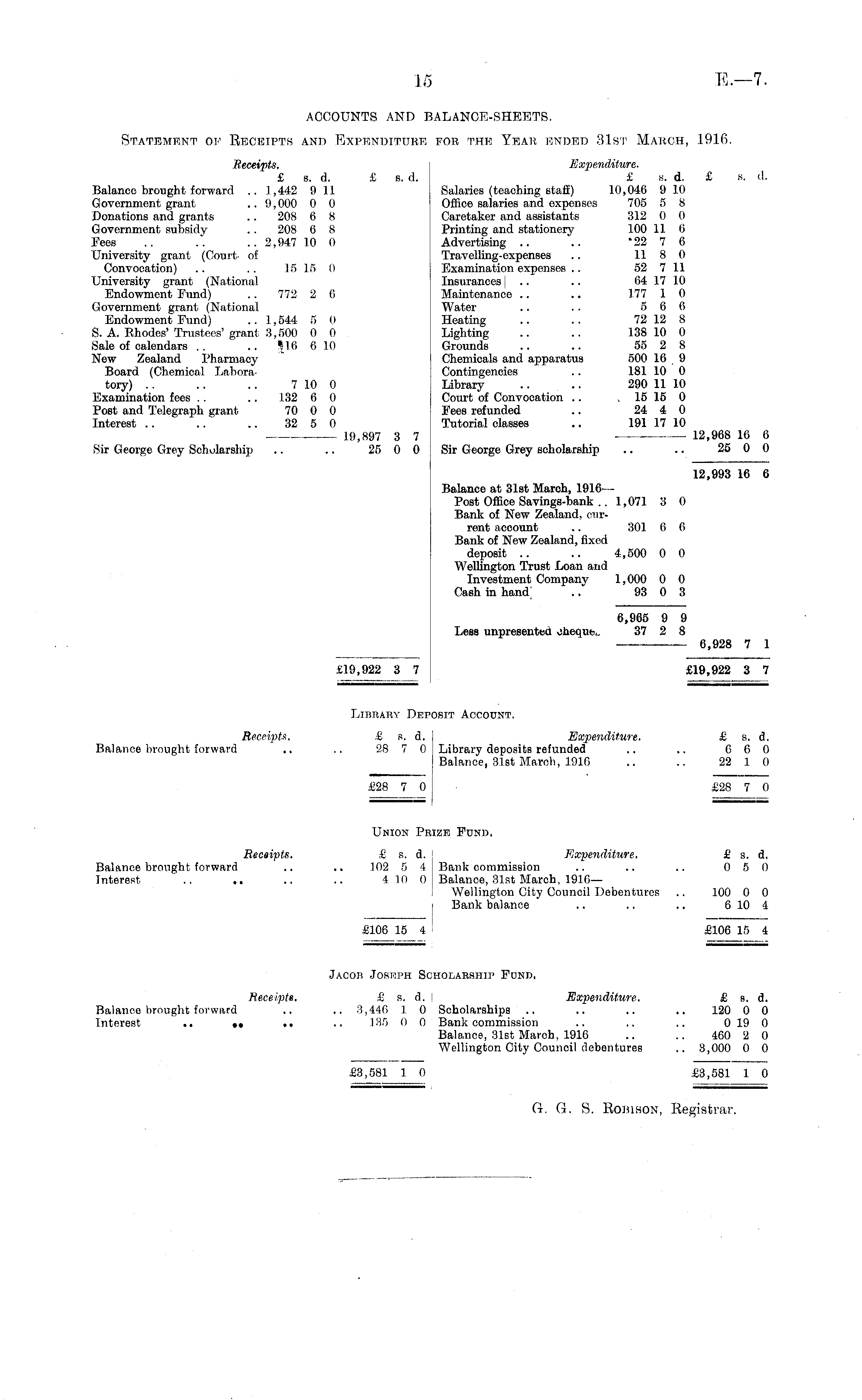 ACCOUNTS AND BALANCE-SHEETS. Statement op Receipts and Expenditure for the Year ended 31st March, 1916. Receipts, Expenditure. £ s. d. £ s. d. £ s. d. £ s. d. Balance brought forward .. 1,442 9 11 Salaries (teaching staff) 10,046 9 10 Government grant .. 9,000 0 0 Office salaries and expenses 705 5 8 Donations and grants .. 208 6 8 Caretaker and assistants 312 0 0 Government subsidy . . 208 6 8 Printing and stationery 100 11 6 Pees .. .. .. 2,947 10 0 Advertising .. .. "22 7 6 University grant (Court of Travelling-expenses .. 11 8 0 Convocation) .. .. 15 16 0 Examination expenses .. 52 711 University grant (National Insurances | .. .. 64 17 10 Endowment Eund) .. 772 2 6 Maintenance .. .. 177 1 0 Government grant (National Water .. . . 5 6 0 Endowment Fund) .. 1,544 5 0 Heating .. .. 72 12 8 S. A. Rhodes'Trustees'grant 3,500 0 0 Lighting .. .. 138 10 0 Sale of calendars .. .. 116 6 10 Grounds .. .. 55 2 8 New Zealand Pharmacy Chemicals and apparatus 500 16 9 Board (Chemical Labora- Contingencies .. 181 10 0 tory) . . .. .. 7 10 0 Library .. ... 290 11 10 Examination fees .. .. 132 6 0 Court of Convocation .. , 15 15 0 Post and Telegraph grant 70 0 0 Fees refunded .. 24 4 0 Interest .. .. .. 32 5 0 Tutorial classes .. 191 17 10 __ _ 19,897 3 7 12,968 16 6 Sir George Grey Scholarship .. .. 25 0 0 Sir George Grey scholarship .. .. 25 0 0 12,993 16 6 Balance at 31st March, 1916— Post Office Savings-bank .. 1,071 3 0 Bank of New Zealand, current account .. 301 6 6 Bank of New Zealand, fixed deposit .. .. 4,500 0 0 Wellington Trust Loan and Investment Company 1,000 0 0 Cash in hand/ .. 93 0 3 6,965 9 9 Less unpresented oheque,. 37 2 8 6,928 7 1 £19,922 3 7 £19,922 3 7 Library Deposit Account. Receipts. £ s. d. Expenditure. £ s. d. Balance brought forward .. .. 28 7 0 Library deposits refunded .. .. 6 6 0 Balance, 31st March, 1910 .. .. 22 1 0 £28 7 0 £28 7 0 Union Prizf. Fund, Receipts. & s. d. Expenditure. £ s. d. Balance brought forward .. .. 102 5 4 Bank commission .. .. .. 0 5 0 Interest '.. .. .. .. 4 10 0 Balance, 31st March, 1910— Wellington City Council Debentures .. 100 0 0 | Bank balanoe .. .. .. 610 4 £106 15 4 I £106 15 4 Jacob Joseph Scholarship Fund, Receipts. £ s. d. ! Expenditure. £ s. d. Balance brought forward .. .. 3,446 1 0 Scholarships .. .. .. .. 120 0 0 Interest .. ~ .. .. 185 0 0 Bank commission .. .. .. 0 19 0 Balance, 31st March, 1916 .. .. 460 2 0 Wellington City Council debentures .. 3,000 0 0 £3,581 1 0 £3,581 1 0 G. G. S. Rohihon, Registrar,