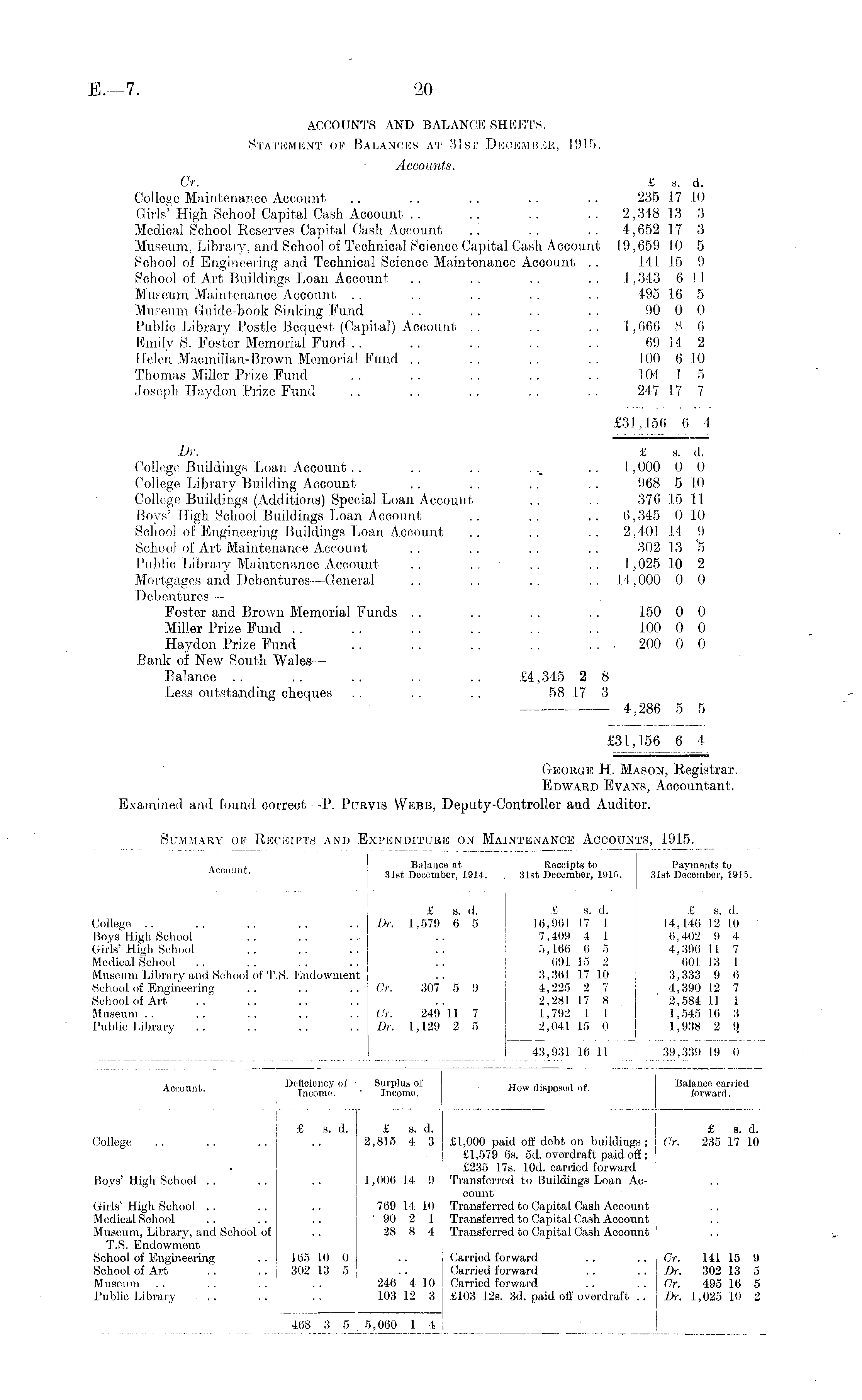 ACCOUNTS AND BALANCE SHEETS. Statement ov Balances at 31st Decembsb, 1915. Accounts. Cr. £ s. d. College Maintenance Account .. . . .. .. .. 235 17 10 Girls' High School Capital Cash Aocount .. .. .. .. 2,348 13 3 Medical School Reserves Capital Cash Account .. .. .. 4,652 17 3 Museum, Library, and School of Technical Science Capital Cash Aocount 19,659 10 5 School of Engineering and Technical Science Maintenance Account . . 141 15 9 School of Art Buildings Loan Account, . . . . . . . . I ,343 611 Museum Maintenance Account .. .. .. .. .. 495 16 5 Museum Guide-book Sinking Fund .. .. .. .. 90 0 0 Public Library Postlc Bequest (Capital) Account .. .. .. 1,666 S 6 Emily S. Foster Memorial Fund . . . . . . . . . . 69 14 2 Helen Macmillan-Brown Memorial Fund .. .. .. .. 100 6 10 Thomas Miller Prize Fund . . . . . . . . .. 104 1 5 Joseph Haydon Prize Fund .. .. .. . . . . 247 17 7 £31,156 6 4 Dr. £ s. (I. College Buildings Loan Account .. .. .. ... .. 1,000 0 0 College Library Building Aocount; . . . . .. . . 968 5 10 College Buildings (Additions) Special Loan Account .. .. 376 15 II Boys' High School Buildings Loan Account .. .. .. 6,345 010 School of Engineering Buildings Loan Account .. .. .. 2/101 II 9 School of Art Maintenance Account, .. .. .. .. 302 J3 "5 Publio Library Maintenance Account .. .. .. .. 1,025 10 2 Mortgages and Debentures—General .. .. .. .. 14,000 0 0 Debentures— Foster and Brown Memorial Funds .. .. .. .. 150 0 0 Miller Prize Fund .. .. .. .. .. .. 100 0 0 Haydon Prize Fund .. .. .. .. ... 200 0 0 Bank of New South WalesBalance .. .. .. .. .. £4,345 2 8 Less outstanding cheques .. .. .. 58 17 3 4 ; 286 5 5 £31,156_ 6 4 Georue H. Mason, Registrar. Edward Evans, Accountant. Examined and found correct—P. Purvis Wkbb, Deputy-Controller and Auditor.