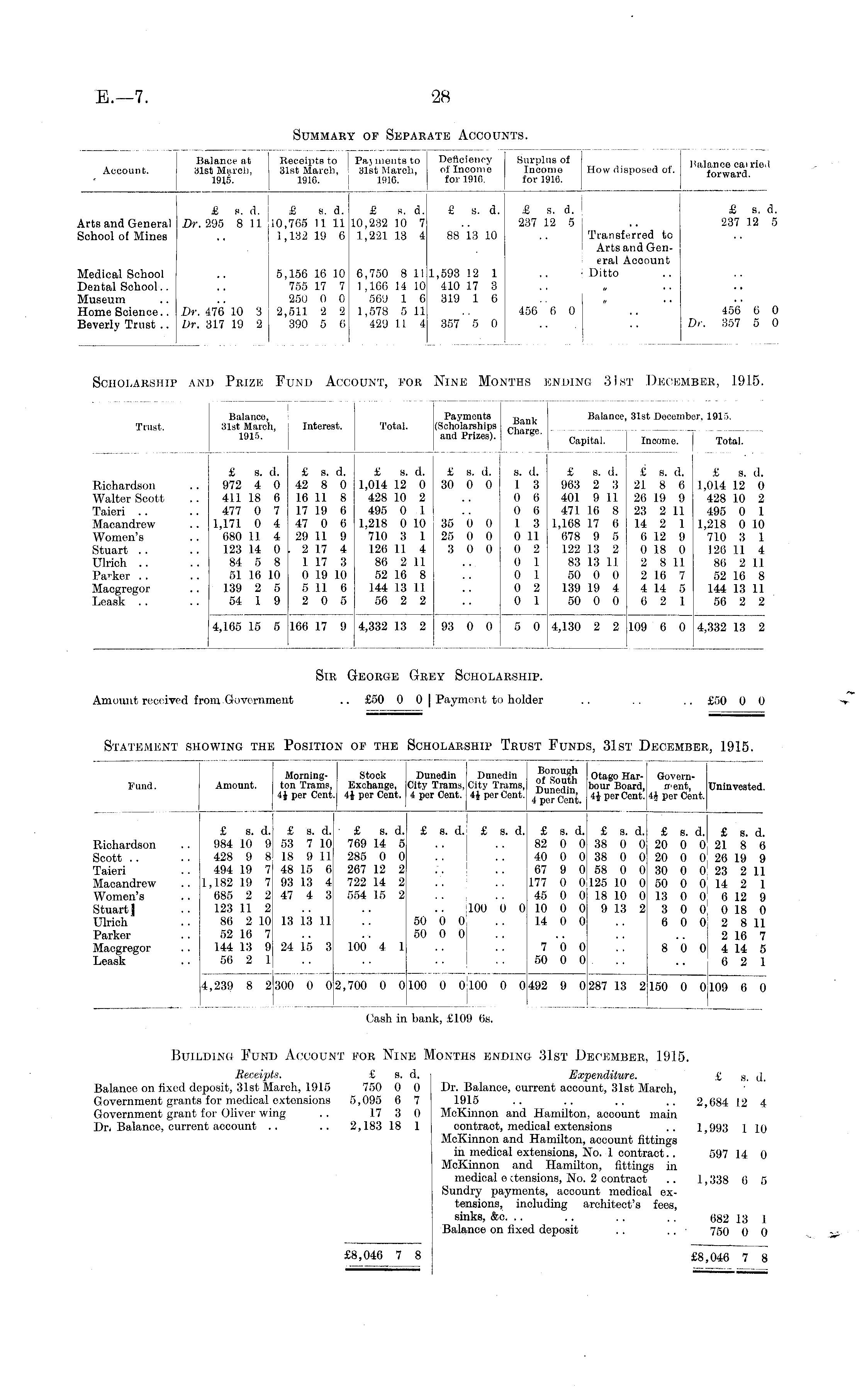 Trust. Balance, 31st March, I Interest. 1915. Total. Payments (Scholarships and Prizes). BankCharge. Balance, Capital. 31st .Decembi >r, 1915. Total. Income. Richardson Walter Scott Taieri .. Macandrew Women's Stuart . . Ulrich .. Pa'ker . . £ s. d. £ s. d 972 4 0 42 8 ( 411 18 6 16 11 c 477 0 7 17 19 ( 1,171 0 4 47 0 ( 680 11 4 29 11 !. 123 1.4 0 . 2 17 4 84 5 8 1 17 i 51 16 10 0 19 1( 139 2 5 5 11 ( 54 1 9 2 0 f £ s. d. 42 8 0 16 11 8 17 19 6 47 0 6 29 11 9 2 17 4 1 17 3 0 19 10 5 11 6 2 0 5 £ s. d. 1,014 12 0 428 10 2 495 0 1 1,218 0 10 710 3 1 126 11 4 86 2 11 52 16 8 144 13 11 56 2 2 £ s. d. 30 0 0 s. d. I 3 0 6 0 6 1 3 0 11 0 2 0 1 0 1 0 2 0 1 £ s. d. 963 2 3 401 9 11 471 16 8 1,168 17 6 678 9 5 122 13 2 83 13 11 50 0 0 139 19 4 50 0 0 £ s. d. 2.1. 8 6 26 19 9 23 2 11 14 2 1 6 12 9 0 18 0 2 8 11 2 16 7 4 14 5 6 2 I £ s. d. 1,014 12 0 428 10 2 495 0 1 1,218 0 10 71.0 3 1 126 11 4 80 2 11 52 16 8 144 13 11 56 2 2 35 0 0 25 0 0 3 0 0 Macgregor Leask .. 4,165 15 5 166 17 9 4,332 13 2 93 0 0 5 0 4,130 2 2 109 6 0 4,332 13 2