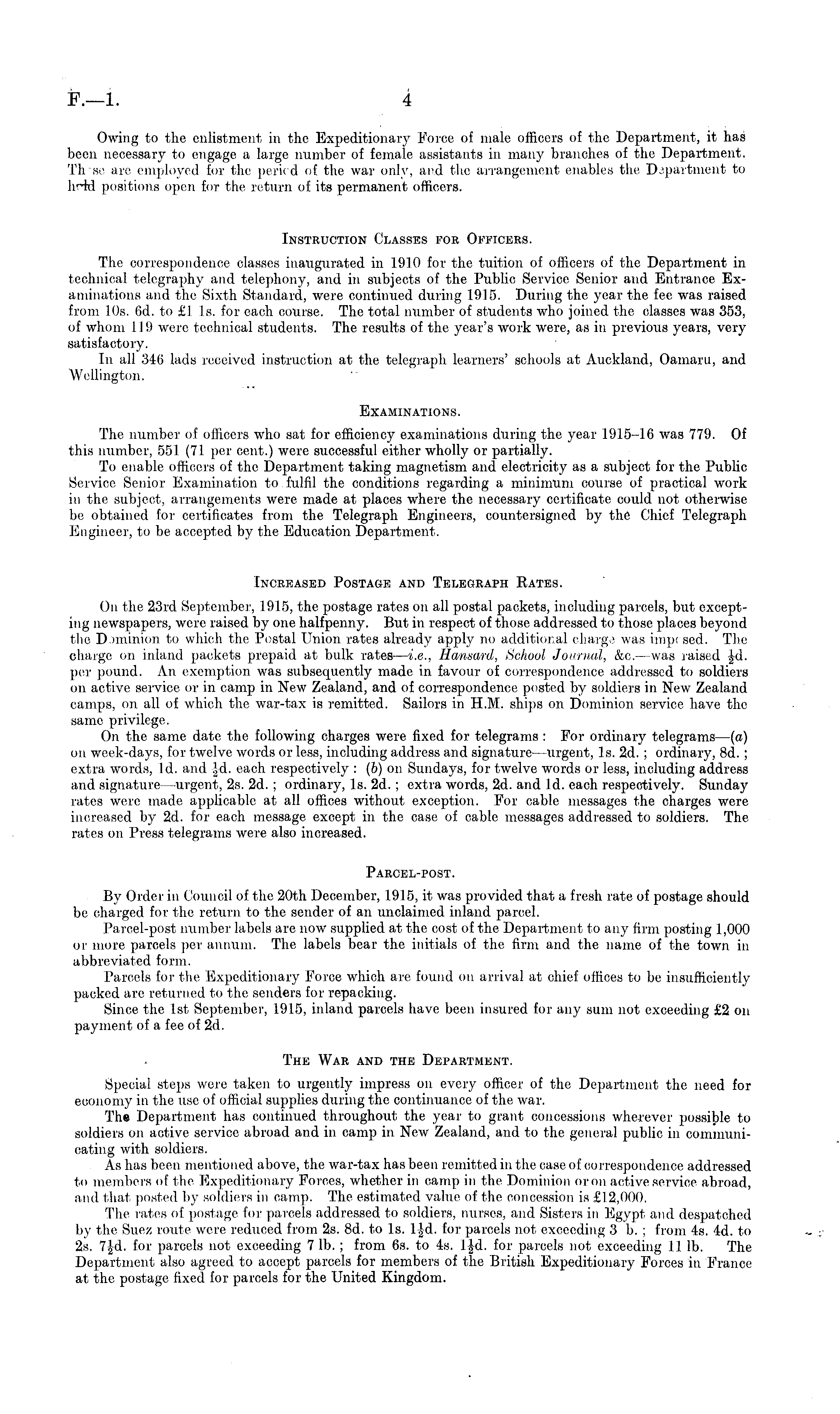 Owing to the enlistment in the Expeditionary Force of male officers of the Department, it has been necessary to engage a large number of female assistants in many branches of the Department. Th so are employed for the pericd of the war only, and the arrangement enables the Department to hrfd positions open for the return of its permanent officers. Instruction Classes for Officers. The correspondence classes inaugurated in 1.910 for the tuition of officers of the Department in technical telegraphy and telephony, and in subjects of the Public Service Senior and Entrance Examinations and the Sixth Standard, were continued during 1915. During the year the fee was raised from 10s. 6d. to £1 Is, for each course. The total number of students who joined the classes was 353, of whom 119 were technical students. The results of the year's work were, as in previous years, very satisfactory. In all 346 lads received instruction at the telegraph learners' schools at Auckland, Oamaru, and Wellington. Examinations. The number of officers who sat for efficiency examinations during the year 1915-16 was 779. Of this number, 551 (71 per cent.) were successful either wholly or partially. To enable officers of the Department taking magnetism and electricity as a subject for the Public Service Senior Examination to fulfil the conditions regarding a minimum course of practical work iv the subject, arrangements were made at places where the necessary certificate could not otherwise be obtained for certificates from the Telegraph Engineers, countersigned by the Chief Telegraph Engineer, to be accepted by the Education Department. Increased Postage and Telegraph Rates. On the 23rd September, 1915, the postage rates on all postal packets, including parcels, but excepting newspapers, were raised by one halfpenny. But in respect of those addressed to those places beyond the Dominion to which the Postal Union rates already apply no additional charge was imp< sod. The charge on inland packets prepaid at bulk rates — i.e., Hansard, School Journal, &c.—was raised Jd. per pound. An exemption was subsequently made in favour of correspondence addressed to soldiers on active service or in camp in New Zealand, and of correspondence posted by soldiers in New Zealand camps, on all of which the war-tax is remitted. Sailors in H.M. ships on Dominion service have the same privilege. On the same date the following charges were fixed for telegrams : For ordinary telegrams— (a) on week-days, for twelve words or less, including address and signature —urgent, 1 s. 2d. ; ordinary, Bd. ; extra words, Id. and |d. each respectively : (b) on Sundays, for twelve words or less, including address and signature—urgent, 2s. 2d. ; ordinary, Is. 2d. ; extra words, 2d. and Id. each respectively. Sunday rates were made applicable at all offices without exception. For cable messages the charges were increased by 2d. for each message except in. the case of cable messages addressed to soldiers. The rates on Press telegrams were also increased. Parcel-post. By Order in Council of the 20th December, 1915, it was provided that a fresh rate of postage should be charged for the return to the sender of an unclaimed inland parcel. Parcel-post number labels are now supplied at the cost of the Department to any firm posting J ,000 or more parcels per annum. The labels bear the initials of the firm and the name of the town in abbreviated form. Parcels for the Expeditionary Force which are found on arrival at chief offices to be insufficiently packed are returned to the senders for repacking. Since the Ist September, 1915, inland parcels have been insured for any sum not exceeding £2 on payment of a fee of 2d. The War and the Department. Special steps were taken to urgently impress on every officer of the Department the need for economy in the use of official supplies during the continuance of the war. The Department has continued throughout the year to grant concessions wherever possible to soldiers on active service abroad and in camp in. New Zealand, and to the general public in communicating with soldiers. As has been mentioned above, the war-tax has been remitted in the case of correspondence addressed to members of the Expeditionary Forces, whether in camp in the Dominion oron active service abroad, and that posted by soldiers in camp. The estimated value of the concession is £12,000. The rates of postage for parcels addressed to soldiers, nurses, and Sisters in Egypt and despatched by the Suez route were reduced from 2s. Bd. to Is. l|d. for parcels not exceeding 3 b. ; from 4s. 4d. to 2s. 7|d. for parcels not exceeding 7 lb. ; from 6s. to 4s. lid. for parcels not exceeding 11 lb. The Department also agreed to accept parcels for members of the British Expeditionary Forces in France at the postage fixed for parcels for the United Kingdom.