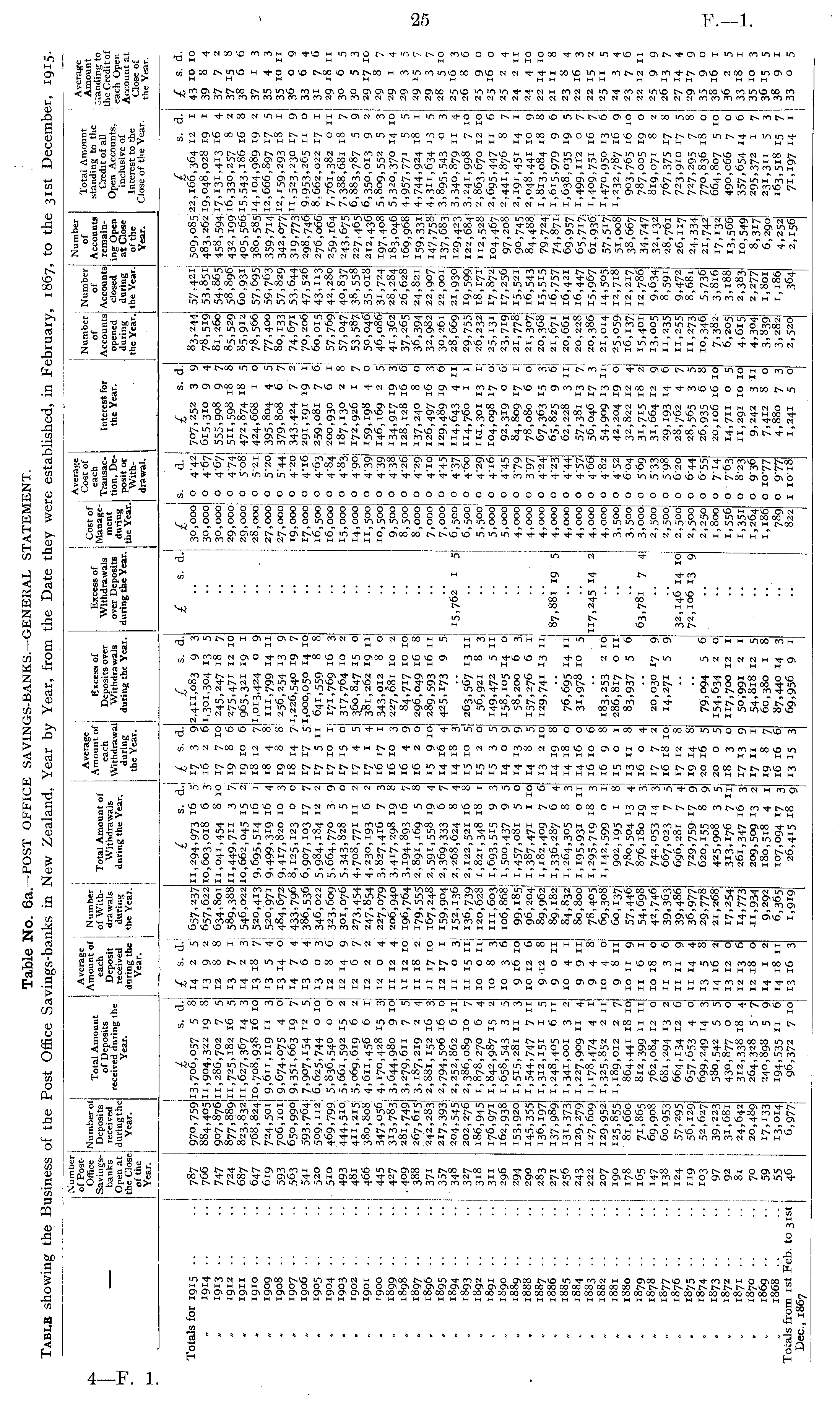 Table No. 6a.—POST OFFICE SAVINGS-BANKS.—GENERAL STATEMENT. Table showing the Business of the Post Office Savings-banks in New Zealand, Year by Year, from the Date they were established, in February, 1867, to the 31st December, 1915.