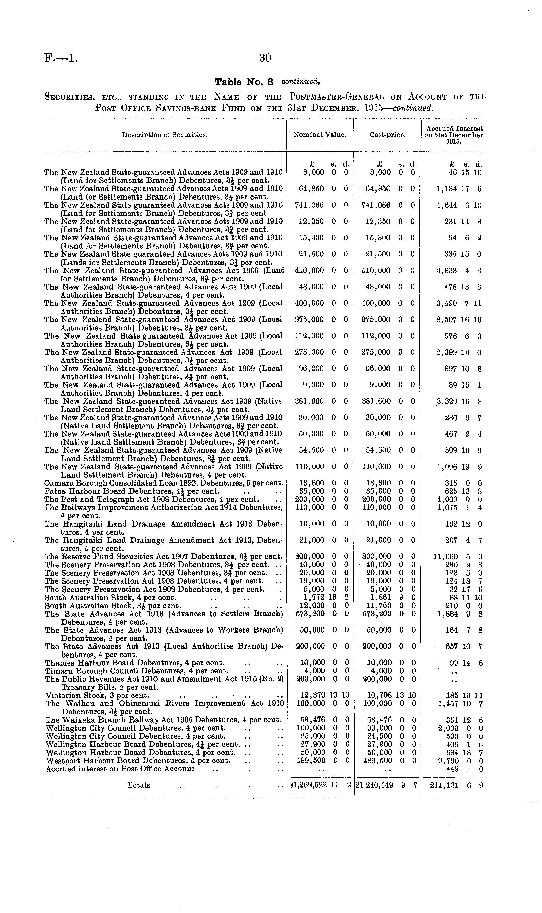 Description of Securities. Nominal Value. Cost-price. Accrued Interest on 31st December 1915. The New Zealand State-guaranteed Advances Acts 1909 and 1910 (Land for Settlements Branoh) Debentures, 34. per cent. The New Zealand State-guaranteed Advanoes Acts 1909 and 1910 (Land for Settlements Branoh) Debentures, 34. per oent. The New Zealand State-guaranteed Advanoes Acts 1909 and 1910 (Land for Settlements Branch) Debentures, 3} per oent. The New Zealand State-guaranteed Advanoes Acts 1909 and 1910 (Land for Settlements Branch) Debentures, 3| per oent. The New Zealand State-guaranteed Advanoes Aot 1909 and 1910 (Land for Settlements Branoh) Debentures, 3| per oent. The New Zealand State-guaranteed Advances Acts 1909 and 1910 (Lands for Settlements Branch) Debentures, 3| per oent. The New Zealand State-guaranteed Advances Act 1909 (Land for Settlements Branoh) Debentures, 3| per cent. The New Zealand State-guaranteed Advances Acts 1909 (Local Authorities Branch) Debentures, 4 per oent. The New Zealand State-guaranteed Advanoes Act 1909 (Local Authorities Branoh) Debentures, 34. per cent. The New Zealand State-guaranteed Advanoes Aot 1909 (Looal Authorities Branoh) Debentures, 34. per oent. The New Zealand State-guaranteed Advances Act 1909 (Local Authorities Branoh) Debentures, 34. per oent. The New Zealand State-guaranteed Advances Aot 1909 (Looal Authorities Branoh) Debentures, 34. per oent. The New Zealand State-guaranteed Advances Aot 1909 (Looal Authorities Branoh) Debentures, 3| por cent. The New Zealand State-guaranteed Advanoes Act 1909 (Local Authorities Branoh) Debentures, 4 per oent. The New Zealand State-guaranteed Advanoes Act 1909 (Native Land Settlement Branoh) Debentures, 3J per oent. The New Zealand State-guaranteed Advanoes Aots 1909 and 1910 (Native Land Settlement Branch) Debentures, 3| per cent. The New Zealand State-guaranteed Advanoes Aots 1909 and 1910 (Native Land Settlement Branch) Debentures, 3f per oent. The New Zealand State-guaranteed Advances Aot 1909 (Native Land Settlement Branoh) Debentures, 3| per cent. The New Zealand State-guaranteed Advanoes Act 1909 (Native Land Settlement Branoh) Debentures, 4 per oent. Oamaru Borough Consolidated Loan 1893, Debentures, 5 per oent. Patea Harbour Board Debentures, 44. per oent. The Post and Telegraph Act 1908 Debentures, 4 per oent. The Railways Improvement Authorization Aot 1914 Debentures, 4 per oent. The Rangitaiki Land Drainage Amendment Aot 1913 Debentures, 4 per oent. The Rangitaiki Land Drainage Amendment Act 1913, Debentures, 4 per oent. The Reserve Fund Securities Aot 1907 Debentures, 34. por oent. The Scenery Preservation Aot 1908 Debentures, 3J per oent. .. The Scenery Preservation Aot 1908 Debentures, 3f per cent. .. The Scenery Preservation Aot 1908 Debentures, 4 per oent. The Soenery Preservation Aot 1908 Debentures, 4 per oent. South Australian Stook, 4 per cent. South Australian Stook, 34. per oent. The State Advances Act 1913 (Advanoes to Settlers Branoh) Debentures, 4 per oent. The State Advances Aot 1913 (Advanoes to Workers Branoh) Debentures, 4 per oent. The State Advanoes Aot 1913 (Looal Authorities Branch) Debentures, 4 per cent. Thames Harbour Board Debentures, 4 per oent. Timaru Borough Counoil Debentures, 4 per oent. The Public Revenues Aot 1910 and Amendment Act 1915 (No. 2) Treasury Bills, 4 per oent. Victorian Stook, 3 por oent. The Waihou and Ohinemuri Rivers Improvement Act 1910 Debentures, 34. per oent. The Waikaka Branoh Railway Act 1905 Debentures, 4 per cent. Wellington City Counoil Debentures, 4 per oent. Wellington City Counoil Debentures, 4 per oent. Wellington Harbour Board Debentures, 4J per cent. Wellington Harbour Board Debentures, 4 per oent. Westport Harbour Board Debentures, 4 per oent. Aoorued interest on Post Office Aooount £ s. d. 8,000 0 0 64,850 0 0 741,066 0 0 12,350 0 0 15,300 0 0 21,500 0 0 410,000 0 0 48,000 0 0 400,000 0 0 975,000 0 0 112,000 0 0 275,000 0 0 96,000 0 0 9,000 0 0 3381,600 0 0 330,000 0 0 50,000 0 0 54,500 0 0 110,000 0 0 £ s. d. 8,000 0 0 64,850 0 0 741,066 0 0 12,350 0 0 15,300 0 0 21,500 0 0 410,000 0 0 48,000 0 0 400,000 0 0 975,000 0 0 112,000 0 0 275,000 0 0 96,000 0 O 9,000 0 O 381,600 0 0 30,000 0 0 50,000 0 0 54,500 0 0 110,000 0 0 £ s. d. 46 15 10 1,134 17 6 4,644 6 10 231 11 3 94 6 2 385 15 0 3,833 4 3 478 18 3 3,490 7 11 8,507 16 10 976 6 3 2,399 13 0 897 10 8 89 15 1 3,329 16 8 280 9 7 467 9 4 509 10 9 1,096 19 9 13,800 0 0 35,000 0 0 200,000 0 0 110,000 0 O 13,800 0 0 35,000 0 0 200,000 0 0 110,000 0 0 345 0 0 625 13 8 4,000 0 0 1,075 1 4 10,000 0 0 10,000 0 0 132 12 0 21,000 0 0 21,000 0 0 207 4 7 800,000 0 0 40,000 0 0 20,000 0 0 19,000 0 0 5,000 0 0 1,772 16 2 12,000 0 0 573,200 0 0 800,000 0 0 40,000 0 0 20,000 0 0 19,000 0 0 5,000 0 0 1,861 9 0 11,760 0 0 573,200 0 0 11,660 5 0 230 2 8 123 5 9 124 18 7 32 17 6 88 11 10 210 0 0 1,884 9 8 50,000 0 0 50,000 0 0 164 7 8 200,000 0 0 200,000 0 0 657 10 7 10,000 0 0 4,000 0 0 200,000 0 0 10,000 0 0 4,000 0 0 200,000 0 0 99 14 6 12,379 19 10 100,000 0 0 10,708 13 10 100,000 0 0 185 13 11 1,457 10 7 53,476 0 0 100,000 0 0 25,000 0 0 27,900 0 0 50,000 O 0 489,500 0 0 53,476 0 0 99,000 0 0 24,500 0 0 27,900 0 0 50,000 0 0 489,500 0 0 351 12 6 2,000 0 0 500 0 0 406 1 6 684 18 7 9,790 0 0 449 1 0 Totals 21,262,522 11 2 21,240,449 9 7 214,131 6 9