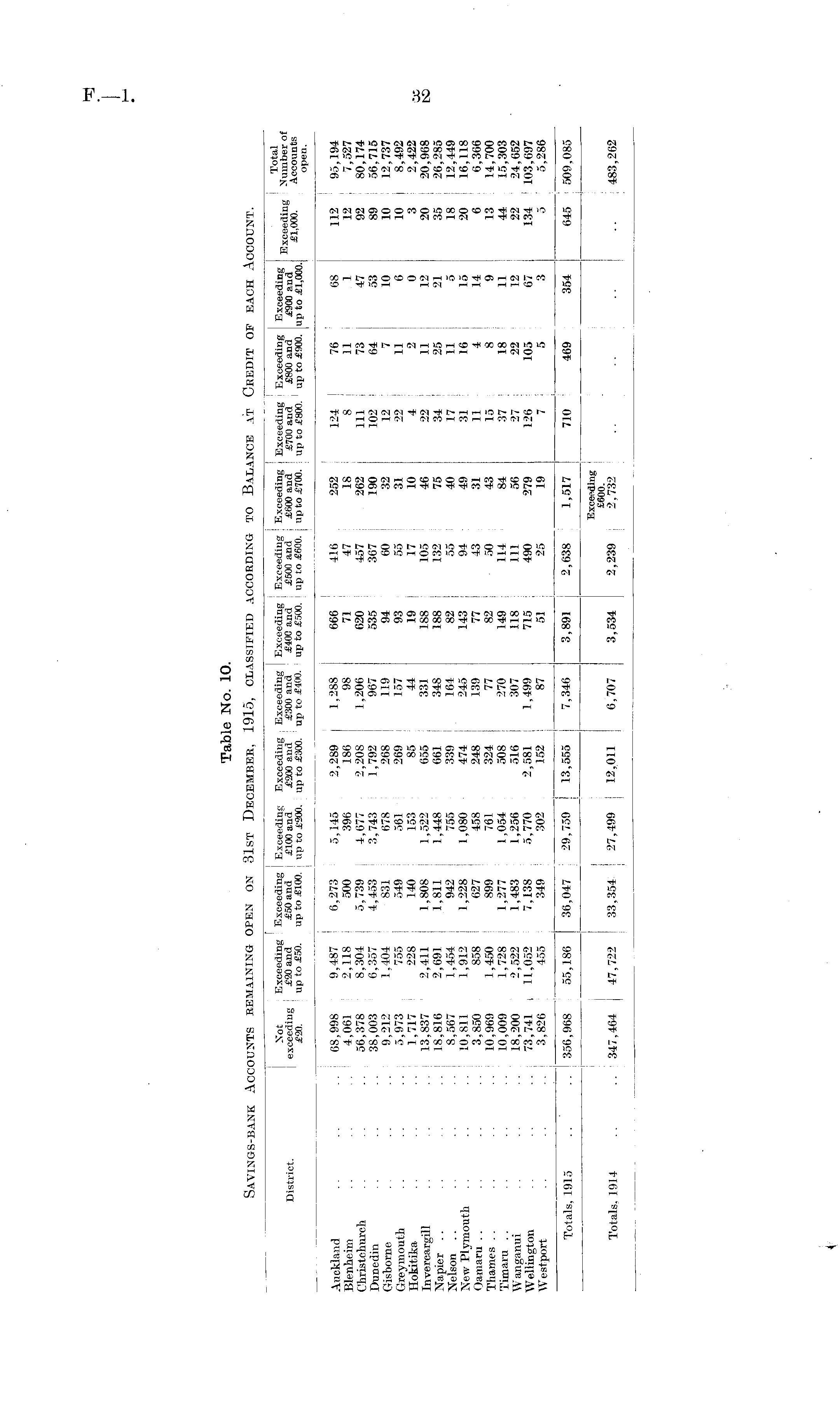 District. Not Exceeding Exceeding : Exceeding Exceeding Exceeding i Exceeding ; Exceeding : Exceeding Exceeding : Exceeding Exceeding exceeding £20 and £50 and £100 and' £200 and £300 and £400 and £500 and £600 and £700 and £800 and £900 and £20. up to £50. up to £100. up to £200. up to £300. up to £400. up to £500. up to £600. up to £700. up to £800. ' up to £900. up to £1,000. Total Exceeding Number oi £1,000. Accounts open. ... I Auckland Blenheim Christchurch Dunedin Gisborne Greymouth Hokitika Invercargill Napier . . Nelson .. New Plymouth Oamaru . . Thames .. Timaru .. Wanganui Wellington Westport 6S,998 4,061 56,378 38,003 9,212 5,973 1,717 13,837 18,816 8,567 10,811 3,850 10,969 10,009 18,200 73,741 3,826 I 9,487 2,118 8,304 6,3357 1,404 755 228 2,411 2,691 1,454 1,912 858 1,450 1,728 2,522 11,052 455 6,273 500 5,739 4,453 831 549 140 1.808 1,811 942 1.228 627 899 1,277 1,483 7,138 349 5,145 396 4,677 3,743 678 561 153 1,522 1,448 755 1,080 458 761 1,054 1,256 5,770 302 2,289 186 2,208 1,792 268 269 85 655 661 339 474 248 324 508 516 2,581 152 1,288 98 1,206 967 119 157 44 331 348 164 245 139 77 270 307 1,499 87 666 71 020 535 94 93 19 188 188 82 143 j 77 82 149 118 715 51 416 47 457 367 60 55 17 105 132 55 94 43 50 114 111 490 25 252 18 262 190 32 31 10 46 75 40 49 31 43 84 56 279 19 124 8 111 102 12 22 4 22 34 17 31 11 15 37 27 126 7 76 11 73 64 7 11 2 11 25 11 16 4 8 18 22 105 5 68 1 47 53 10 6 0 12 21 5 15 14 9 11 12 67 3 112 95,194 12 ! 7,527 92 80,174 89 56.715 10 12,737 10 8,492 3 2,422 20 20,968 335 26,285 18 12,449 20 16,118 6 6,366 13 14,700 44 15,303 22 24,652 134 103,697 5 5,286 Totals. 1915 3350,968 55,186 316,047 29,759 j 13,555 7,346 3,891 2,638 1,517 710 469 354 645 j 509,085 I 347,464 j 47,722 333,3354 27,499 12,011 6,707 3,534 2,239 Exceeding £600. 2,732 483,262 Totals. 1914