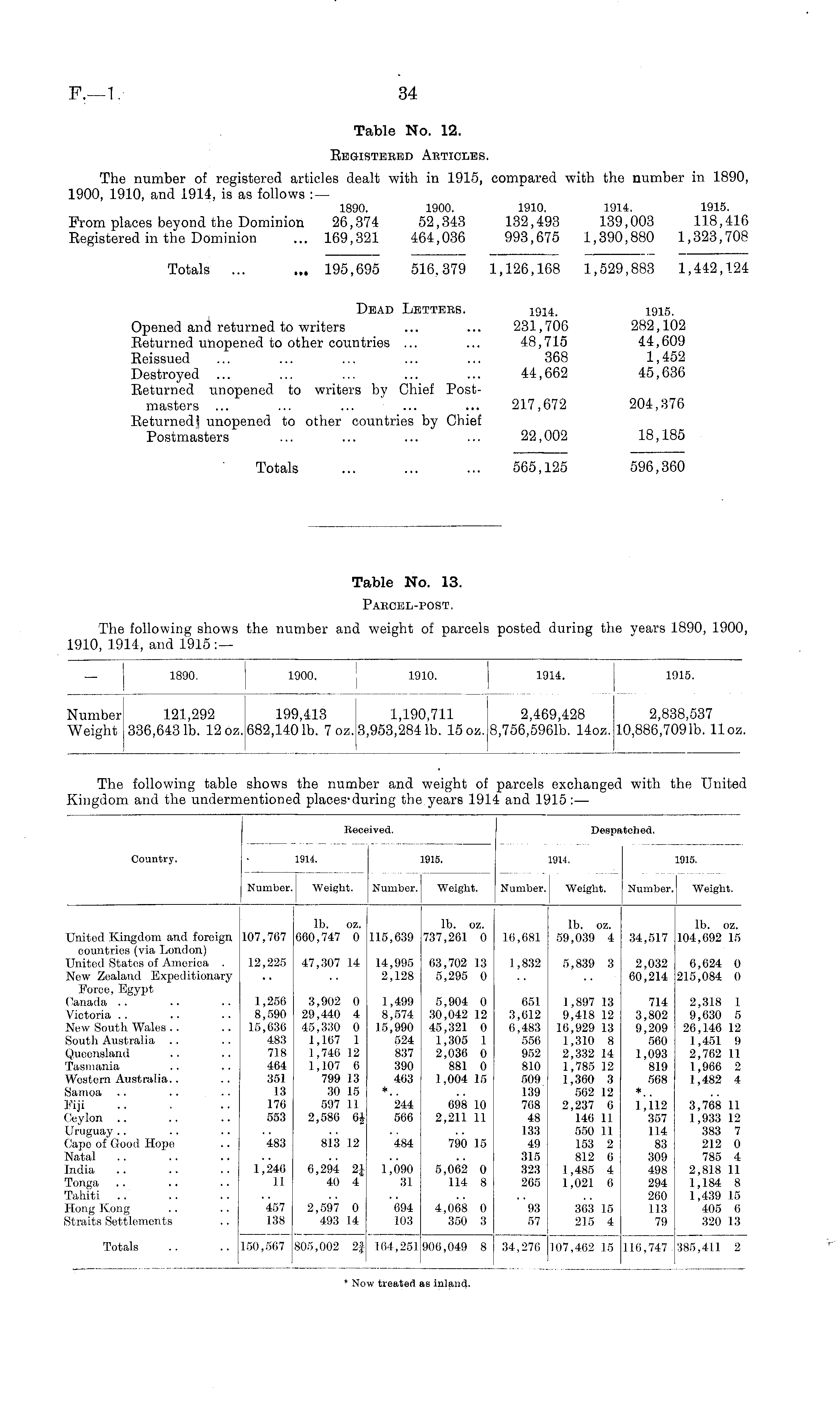 — 1890. 1900. 1910. 1914. 1915. Number 121,292 199,413 1,190,711 2,469,428 2,838,537 Weight 336,6431b. 12 oz. 682,1401b. 7 oz. 3,953,2841b. 15 oz. 8,756,5961b. 14oz. 10,886,7091b. 11 oz. 1890. 1900. 1910. The following table shows the number and weight of parcels exchanged with the United Kingdom and the undermentioned places-during the years 1914 and 1915:— larcels exchanged with the United and 1915:— Iteceived. Despatched. Country. Number. 1914. Weight. 1915. 1914. 1915. Number. Weight. Number. Weight. Number. Weight. Unitod Kingdom and foreign countries (via London) United States of America . New Zealand Expeditionary Force, Egypt Canada Victoria New South Wales South Australia Queensland Tasmania Western Australia.. 107,707 lb. oz. 660,747 0 115,639 lb. oz. 737,201. 0 16,681 lb. oz. 59,0319 4 34,517 lb. oz. 104,692 15 12,225 47,3107 14 14,995 2,128 63,702 13 5,295 0 1,832 5,839 3 2,032 60,21.4 6,624 0 215,084 0 Samoa Fiji Ceylon Uruguay Capo of Good Hope Natal India 1,256 8,590 15,630 483 718 464 351 13 176 553 3,902 0 29,440 4 45,33310 0 1,167 1 1,746 12 1,107 6 799 13 30 15 597 11 2,586 64. 1,499 8,574 15,990 524 837 390 463 *. 244 566 5,904 0 310,042 12 45,321 0 1,305 1 2,036 0 881 0 1,004 15 698 10 2,211 11 651 3,612 6,483 556 952 810 509 139 768 48 133 49 315 323 265 1,897 13 9,418 12 16,929 13 1,310 8 2,332 14 1,785 12 1,360 3 562 12 2,237 6 146 11 550 11 153 2 812 6 1,485 4 1,021 6 714 3,802 9,209 560 1,093 819 568 *.. 1,112 357 114 83 309 498 294 260 113 79 2,318 1 9,630 5 26,146 12 1,451 9 2,762 11 1,966 2 1,482 4 3,768 11 1,933 12 383 7 212 0 785 4 2,818 11 1,184 8 1,4319 15 405 6 320 13 483 813 12 484 790 15 1,246 11 6,294 2J 40 4 1,090 31 5,062 0 114 8 Tonga Tahiti Hong Kong Straits Settlements 457 138 2,597 0 493 14 694 103 4,068 0 350 3 93 57 363 15 215 4 Totals 150,567 805,002 2| 164,251 906,049 8 314,276 107,462 15 116,747 3185,411 2 * Now treated ,s inland.