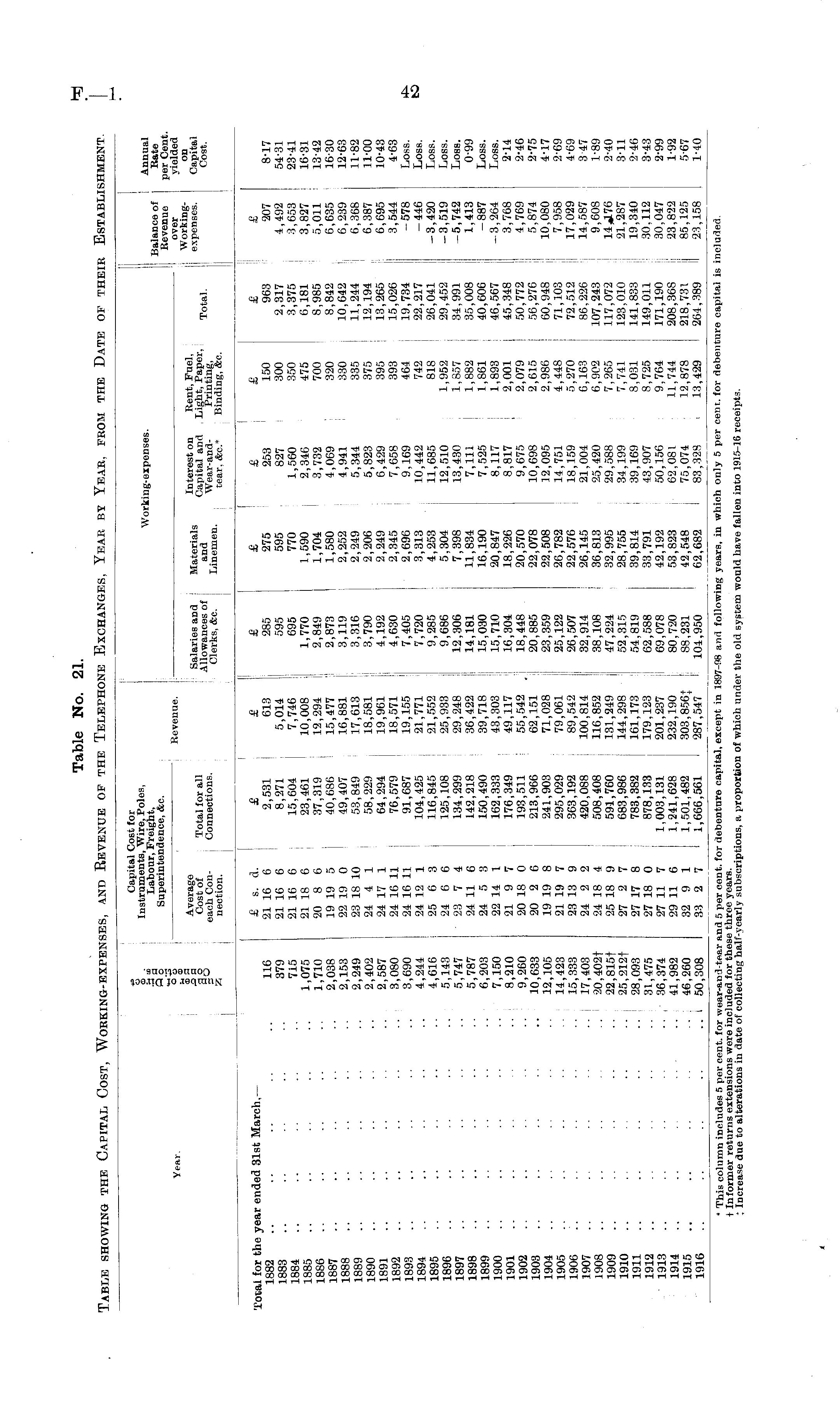 Table No. 21. Table showing the Capital Cost, Working-expenses, and Revenue of the Telephone Exchanges, Year by Year, from the Date of their Establishment.