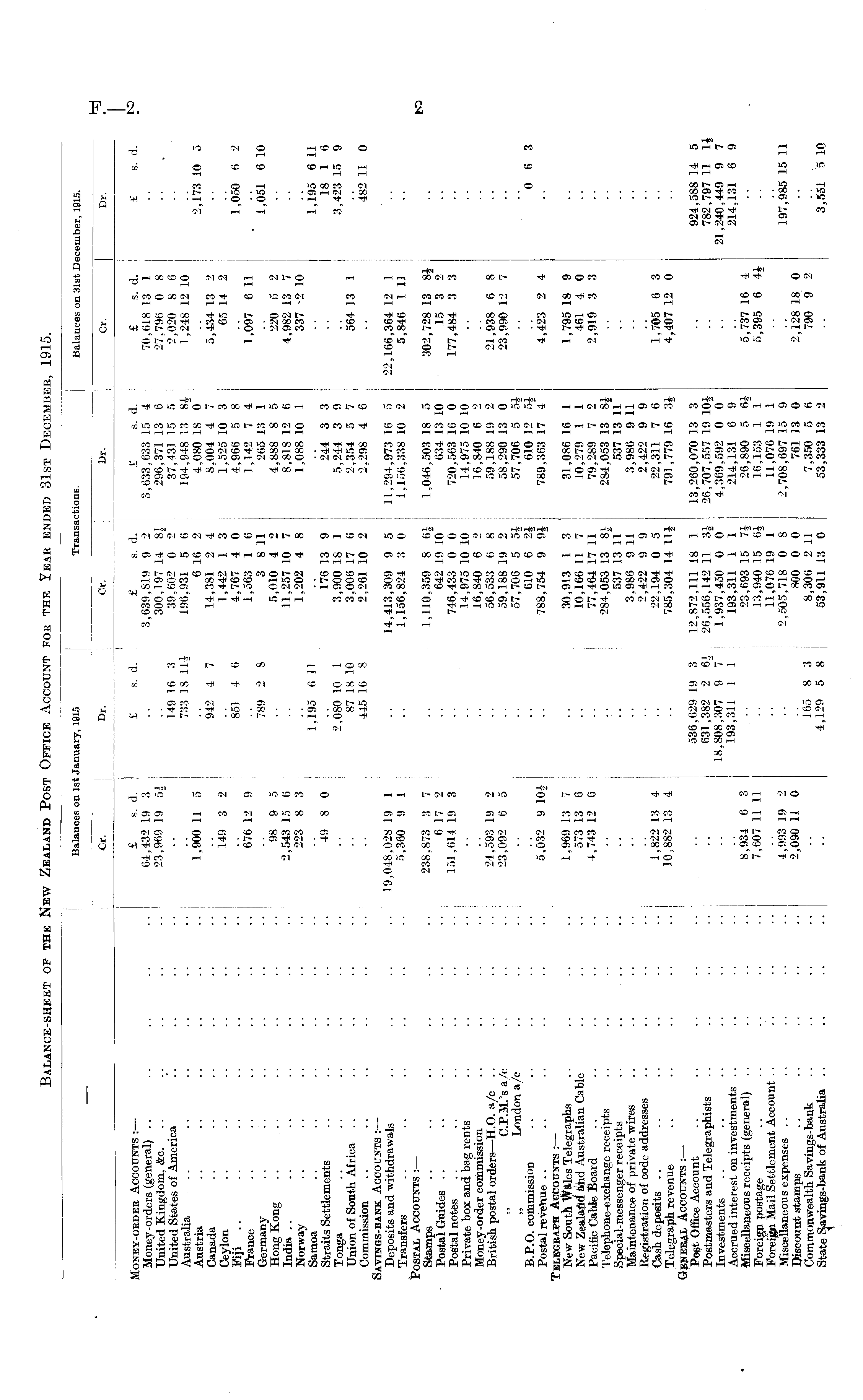Balances on 1st January, 1915 Transactions. Balances on 31st December, 1915. Cr. Dr. Cr. Dr. Cr. Dr. MONEY-ORDER ACCOUNTS :— Money-orders (general) United Kingdom, &c. United States of America Australia Austria Canada Ceylon Fiji .. France Germany Hong Kong India Norway Samoa Straits Settlements Tonga Union of South Africa Commission Savings-bank Accounts :— Deposits and withdrawals Transfers Postal Accounts :— Stamps Postal Guides Postal notes Private box and bag rents Money-order commission British postal orders —H.O. a/c .. C.P.M.'s a/c „ London a/c B.P.O. commission Postal revenue Telegraph Accounts :— New South Wales Telegraphs New Zealand and Australian Cable Pacific Cable Board Telephone-exchange receipts Special-messenger receipts Maintenance of private wires Registration of code addresses Cash deposits Telegraph revenue General Accounts :— Post Office Account Postmasters and Telegraphists Investments Accrued interest on investments .. Miscellaneous receipts (general) Foreign postage Foreign Mail Settlement Account .. Miscellaneous expenses Discount stamps Commonwealth Savings-bank State Sa.vings-bank of Australia .. £ s. d. I 64,432 19 3 23,969 19 51 1,900 11 5 149 3 2 676 12 9 98 9 5 2,543 15 6 223 8 3 49 8 0 19,048,028 19 1 5,360 9 1 238,873 3 7 6 17 2 151,614 19 3 24,593 19 2 23,092 6 5 5,032 9 101 1,969 13 7 573 13 6 4,743 12 6 1,822 13 4 10,882 13 4 8,934 6 3 7,607 11 11 4,993 19 2 2,090 11 0 I £ s. d. 149 16 3 733 18 1U 942 4 7 851 4 6 789 2 S 1,195 6 11 2,080 10 1 87 18 10 445 16 8 536,629 19 3 631,382 2 6J18,808,307 9 7" 193,311 1 1 165 8 3 4,129 5 8 ' £ s. d. 3,639,819 9 2 300,197 14 8 J 39,602 0 2 196,931 5 6 6 16 2 14,381 2 4 1,442 1 3 4,767 4 0 1,563 1 6 3 8 11 5,010 4 2 11,257 10 7 1,202 4 8 176 13 9 3,900 18 1 3,006 17 6 2,261 10 2 14,413,309 9 5 1,156,824 3 0 1,110,359 8 6J 642 19 10" 746,433 0 0 14,975 10 10 16,840 6 2 56,533 6 8 59,188 19 2 57,706 5 51 610 6 2| 788,754 9 9| 30,913 1 3 10,166 11 7 77,464 17 11 284,053 13 8J 537 13 11 3,986 9 11 2,422 9 9 22,194 0 5 785,304 14 11J 12,872,111 18 1 26,556,142 11 3| 1,937,450 0 0 193,311 1 1 23,693 15 7J 13,940 15 6J 11,076 19 1 2,505,718 0 8 800 0 0 8,306 2 11 53,911 13 0 £ s. d. 3,633,633 15 4 296,371 13 6 37,431 15 5 194,948 13 81 4,OS0 18 0 8,004 4 7 1,525 10 3 4,966 5 8 1,142 7 4 265 13 1 4,888 8 5 8,818 12 6 1,088 10 1 244 3 3 5,244 3 9 2,354 5 7 2,298 4 6 11,294,973 16 5 1,156,338 10 2 1,046,503 18 5 634 13 10 720,563 16 0 14,975 10 10 16,840 6 2 59,188 19 2 58,290 13 0 57,706 5 5* 610 12 5J 789,363 17 4 31,086 16 1 10,279 1 1 79,289 7 2 284,053 13 8J 537 13 11" 3,986 9 11 2,422 9 9 22,311 7 6 791,779 16 3J 13,260,070 13 3 26,707,557 19 10 J 4,369,592 0 0" 214,131 6 9 26,890 5 6* 16,153 1 1 11,076 19 1 2,708,697 15 9 761 13 0 7,350 5 6 53,333 13 2 £ s. d. 70,618 13 1 27,796 0 8 2,020 8 6 1,248 12 10 5,434 13 2 65 14 2 1,097 6 11 220 5 2 4,982 13 7 337 -2 10 564 13 1 22,166,364 12 1 5,846 1 11 302,728 13 8J 15 3 2 177,484 3 3 21,938 6 8 23,990 12 7 £ s. d. 2,173 10 5 1.050 6 2 1.051 6 10 1,195 6 11 18 1 6 3,423 15 9 482 11 0 4,423 2 4 0 6 3 1,795 18 9 461 4 0 2,919 3 3 1,705 6 3 4,407 12 0 | 5,737 16 4 5,395 6 U 924,588 14 5 782,797 11 U 21,240,449 9 7 214,131 6 9 2,128 18 0 790 9 2 197,985 15 11 3,551 5 10