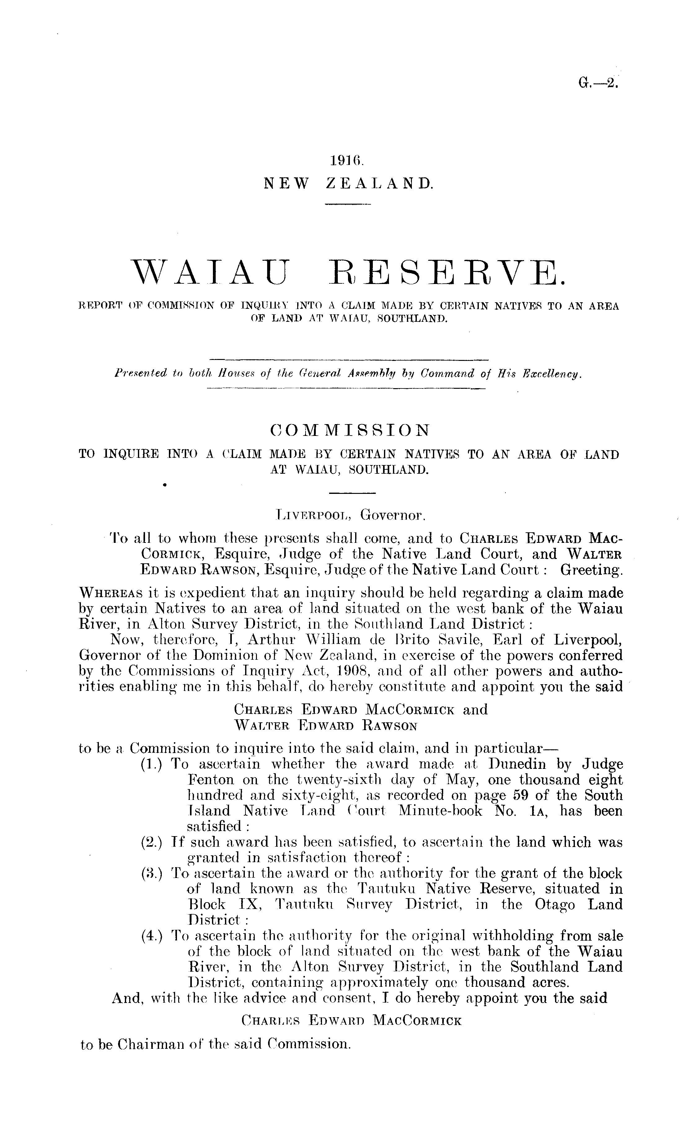 WAIAU RESERVE. REPORT OF COMMISSION OF INQUIRY INTO A CLAIM MADE BY CERTAIN NATIVE TO AN AREA OF LAND AT WAIAU, SOUTHLAND.