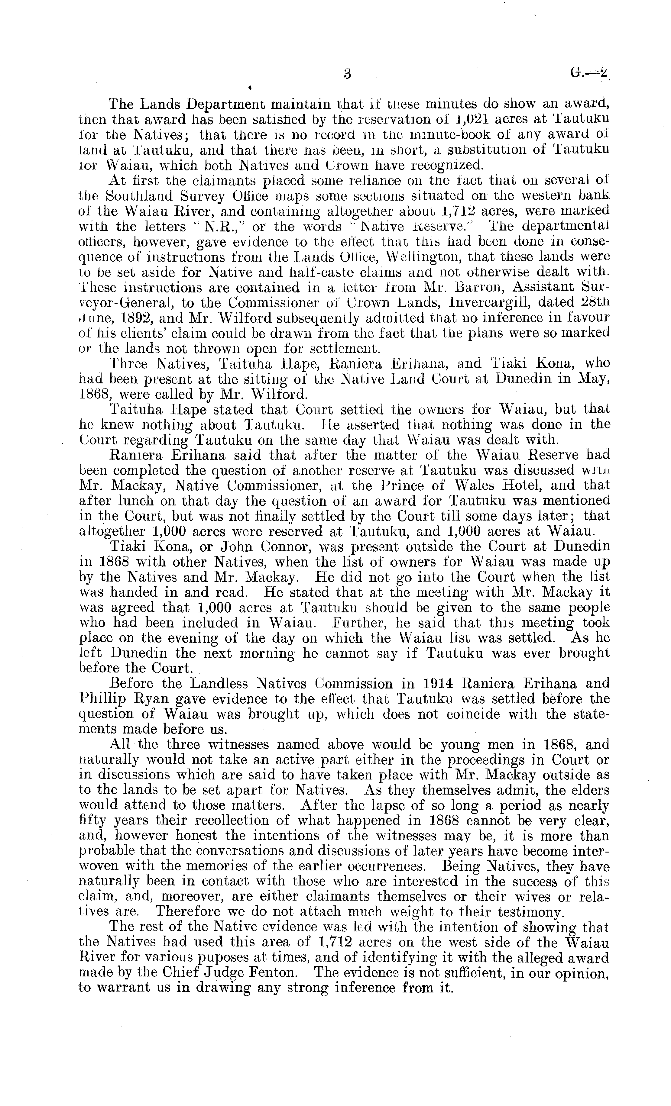 The Lands Department maintain that if tnese minutes do show an award, then that award has been satisfied by the reservation of 1,021 acres at Tautuku for the Natives; that there is no record in tne minute-book of any award of land at Tautuku, and that there lias been, in snort, a substitution of Tautuku for Waiau, which both Natives and Crown have recognized. At first the claimants placed some reliance on tne fact that on several of the Southland Survey Office maps some sections situated on the western bank of the Waiau River, and containing altogether about 1,712 acres, were marked with the letters " N.R.," or the words L " Native Reserve/.' The departmental officers, however, gave evidence to the effect that this had been done in consequence of instructions from the Lands Office, Wellington, that these lands were to be set aside for Native and half-caste claims and not otherwise dealt with. These instructions are contained in a letter from Mr. Barron, Assistant Sur-veyor-General, to the Commissioner of Crown Lands, Invereargill, dated 28th June, 1892, and Mr. Wilford subsequently admitted tliat no inference in favour of his clients' claim could be drawn from the fact that the plans were so marked or the lands not thrown open for settlement. Three Natives, Taituha Hape, Raniera Erihana, and Tiaki Kona, who had been present at the sitting of the Native Land Court at Dunedin in May, 1868, were called by Mr. Wilford. Taituha Hape stated that Court settled the owners for Waiau, but that he knew nothing about Tautuku. He asserted that nothing was done in the Court regarding Tautuku on the same day that Waiau was dealt with. Raniera Erihana said that after the matter of the Waiau Reserve had been completed the question of another reserve at Tautuku was discussed witu Mr. Mackay, Native Commissioner, at the Prince of Wales Hotel, and that after lunch on that day the question of an award for Tautuku was mentioned in the Court, but was not finally settled by the Court till some days later; that altogether 1,000 acres were reserved at Tautuku, and 1,000 acres at Waiau. Tiaki Kona, or John Connor, was present outside the Court at Dunedin in 1868 with other Natives, when the list of owners for Waiau was made up by the Natives and Mr. Mackay. He did not go into the Court when the list was handed in and read. He stated that at the meeting with Mr. Mackay it was agreed that 1,000 acres at Tautuku should be given to the same people who had been included in Waiau. Further, he said that this meeting took place on the evening of the day on which the Waiau list was settled. As he left Dunedin the next morning he cannot say if Tautuku was ever brought before the Court. Before the Landless Natives Commission in 1914 Raniera Erihana and Phillip Ryan gave evidence to the effect that Tautuku was settled before the question of Waiau was brought up, which does not coincide with the statements made before us. All the three witnesses named above would be young men in 1868, and naturally would not take an active part either in the proceedings in Court or in discussions which are said to have taken place with Mr. Mackay outside as to the lands to be set apart for Natives. As they themselves admit, the elders would attend to those matters. After the lapse of so long a period as nearly fifty years their recollection of what happened in 1868 cannot be very clear, and, however honest the intentions of the witnesses may be, it is more than probable that the conversations and discussions of later years have become interwoven with the memories of the earlier occurrences. Being Natives, they have naturally been in contact with those who are interested in the success of this claim, and, moreover, are either claimants themselves or their wives or relatives are. Therefore we do not attach much weight to their testimony. The rest of the Native evidence was led with the intention of showing that the Natives had used this area of 1,712 acres on the west side of the Waiau River for various puposes at times, and of identifying it with the alleged award made by the Chief Judge Fenton. The evidence is not sufficient, in our opinion, to warrant us in drawing any strong inference from it.