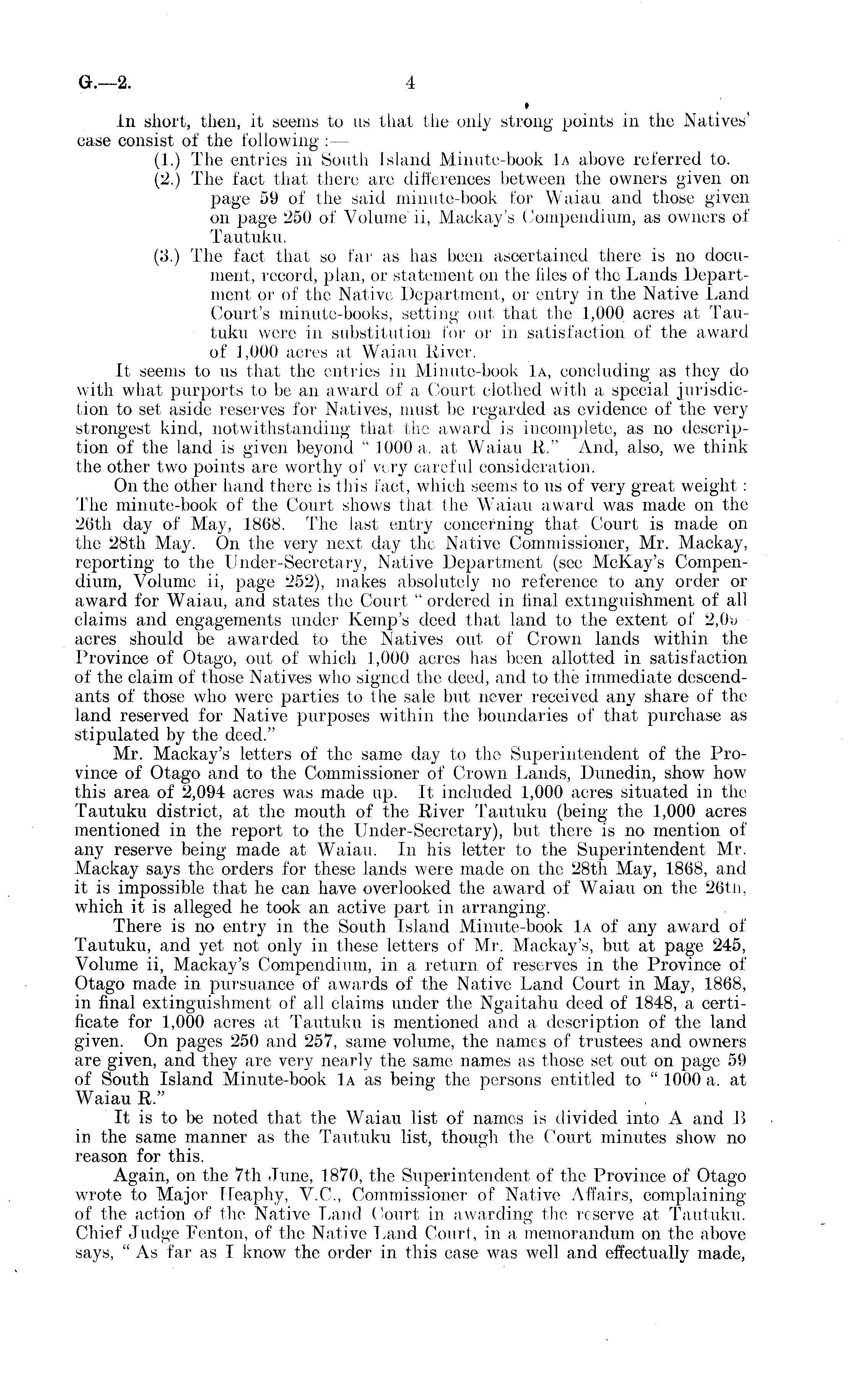 In short, then, it seems to us that the only strong points in the Natives' case consist of the following : — (1.) The entries in South Island Minute-book 1a above referred to. (2.) The fact that there are differences between the owners given on page 59 of the said minute-book for Waiau and those given on page 250 of Volume ii, Maokay's Compendium, as owners of Tautuku. (3.) The fact that so far as has been ascertained there is no document, record, plan, or statement on the fifes of the Lands Department or of the Native Department, or entry in the Native Land Court's minute-books, setting out that the 1,000 acres at Tautuku were in substitution for or 1 in satisfaction of the award of 1,000 acres at Waiau River. It seems to us that the entries in Minute-book la, concluding as they do with what purports to be an award of a Court clothed with a special jurisdiction to set aside reserves for Natives, must be regarded as evidence of the very strongest kind, notwithstanding that the award is incomplete, as no description of the land is given beyond " 1000 a. at Waiau R." And, also, we think the other two points are worthy of very careful consideration. On the other hand there is this fact, which seems to us of very great weight : The minute-book of the Court shows that the Waiau award was made on the 26th day of May, 1868. The last entry concerning that Court is made on the 28th May. On the very next day the Native Commissioner, Mr. Mackay, reporting to the Under-Secretary, Native Department (sec McKay's Compendium, Volume ii, page 252), makes absolutely no reference to any order or award for Waiau, and states the Court " ordered in final extinguishment of all claims and engagements under Kemp's deed that land to the extent of 2,o'y acres should be awarded to the Natives out of Crown lands within the Province of Otago, out of which 1,000 acres has been allotted in satisfaction of the claim of those Natives who signed the deed, and to the immediate descendants of those who were parties to the sale but never received any share of the land reserved for Native purposes within the boundaries of that purchase as stipulated by the deed." Mr. Mackay's letters of the same day to the Superintendent of the Province of Otago and to the Commissioner of Crown Lands, Dunedin, show how this area of 2,094 acres was made up. It included 1,000 acres situated in the Tautuku district, at the mouth of the River Tautuku (being the 1,000 acres mentioned in the report to the Under-Secretary), but there is no mention of any reserve being made at Waiau. In his letter to the Superintendent Mr. Mackay says the orders for these lands were made on the 28th May, 1868, and it is impossible that he can have overlooked the award of Waiau on the 26tn, which it is alleged he took an active part in arranging. There is no entry in the South Island Minute-book 1a of any award of Tautuku, and yet not only in these letters of Mr. Mackay's, but at page 245, Volume ii, Mackay's Compendium, in a return of reserves in the Province of Otago made in pursuance of awards of the Native Land Court in May, 1868, in final extinguishment of all claims under the Ngaitahu deed of 1848, a certificate for 1,000 acres at Tautuku is mentioned and a description of the land given. On pages 250 and 257, same volume, the names of trustees and owners are given, and they are very nearly the same names as those set out on page 59 of South Island Minute-book 1a as being the persons entitled to " 1000 a. at Waiau R." It is to be noted that the list of names is divided into A and B in the same manner as the Tautuku list, though the Court minutes show no reason for this. Again, on the 7th June, 1.870, the Superintendent of the Province of Otago wrote to Major Heaphy, V.C., Commissioner of Native Affairs, complaining of the action of the Native Land Court in awarding the reserve at Tautuku. Chief Judge Fenton, of the Native Land Court, in a memorandum on the above says, " As far as I know the order in this case was well and effectually made,