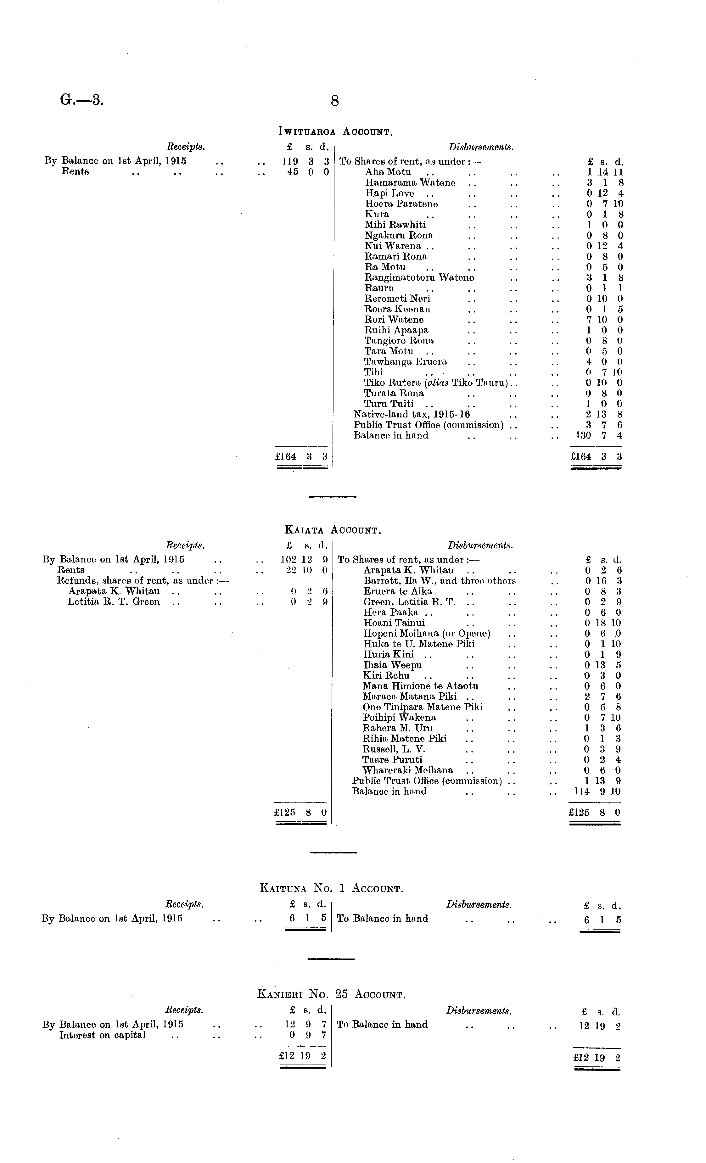 Kaiata Account. Receipts. £ s. d. Disbursements. By Balance on Ist April, 1915 .. .. 102 12 9 To Shares of rent, as under: — £ s. d. Rents .. .. .. .. 22 10 0 Arapata K. Whitau .. .. .. 0 2 6 Refunds, shares of rent, as under:— Barrett, Ha W., and three others .. 0 16 3 Arapata K. Whitau . . .. .. 0 2 6 Eruera te Aika .. .. .. 0 8 3 Letitia R. T. Green .. .. .. 0 2 9 Green, Letitia R. T. .. .. .. 0 2 9 Hera Paaka .. . . .. . . 0 6 0 Hoani Tainui . . .. .. 0 18 10 Hoponi Meihana (or Opene) .. .. 0 6 0 Huka te U. Matone Piki .. .. 0 1 10 Huria Kini .. .. .. .. 0 19 Ihaia Weepu .. .. . . 0 13 5 Kirißehu .. .. .. .. 0 3 0 Mana Himione te Ataotu .. .. 0 6 0 Maraea Matana Piki .. .. . . 2 7 6 Ono Tinipara Matene Piki .. . . 0 5 8 Poihipi Wakcna .. .. .. 0 710 Rahera M. Uru .. .. .. 13 6 Rihia Matone Piki .. .. .. 0 13 Russell, L. V. .. .. .. 0 3 9 Taare Puruti .. .. .. 0 2 4 Wharoraki Meihana .. .. .. 0 6 0 Publio Trust Office (commission) . . .. 1 13 9 Balanoe in hand .. .. .. 114 9 10 £125 8 0 £125 8 0