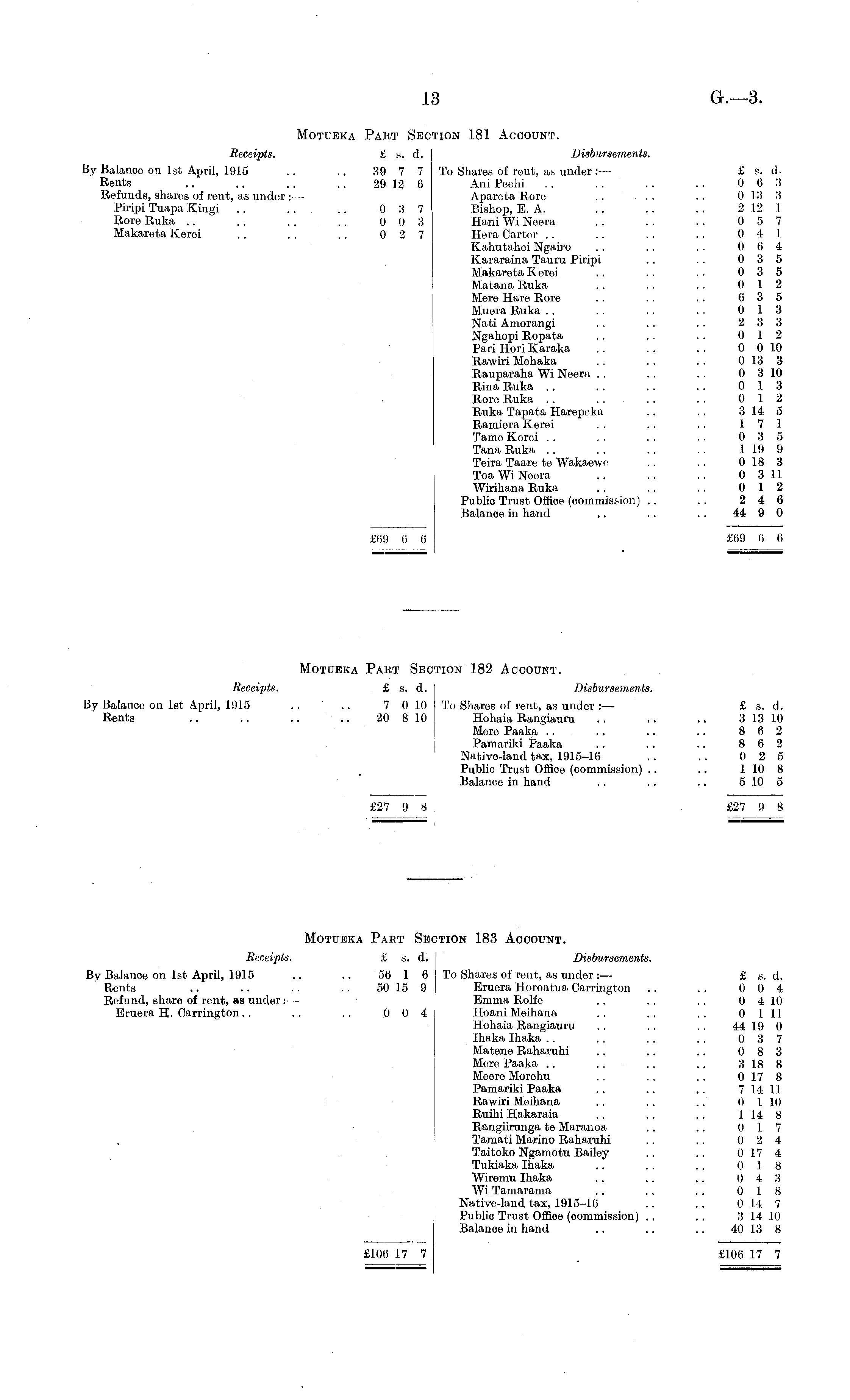 Motueka Part Section 182 Account. Receipts. £ a. A. Disbursements. By Balance on Ist April, 1915 .. .. 7 0 10 To Shares of relit, as under :— £ s. d. Rents .. .. .. .. 20 810 Hohaia Rangiauru .. .. .. 313 10 Moro Paaka .. .. .. .. 8 6 2 Pamariki Paaka .. .. .. 8 6 2 Native-land tax, 1915-16 . . .. 0 2 5 Public Trust Office (commission) .. .. I 10 8 Balance in hand .. .. .. 5 10 5 £27 9 8 . £27 9 8