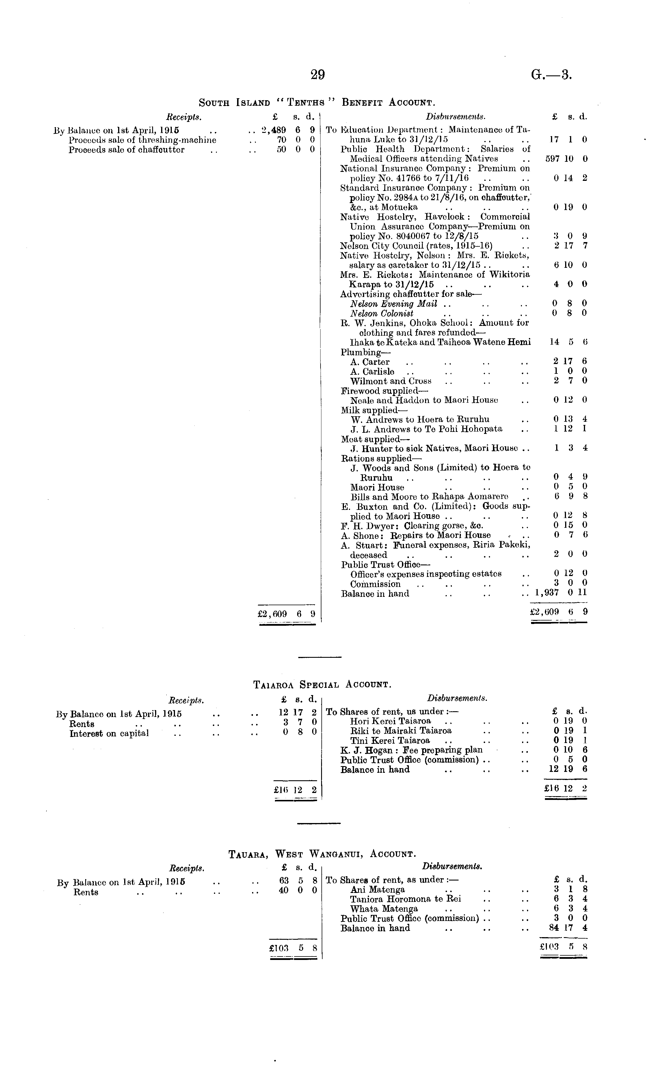 South Island " Tenths " Benefit Account. Receipts. £ s. d. I Disbursements. £ s. d. By Balance on Ist April, 1915 .. .. 2,489 6 9 To Education Department: Maintenance of TaProoeeds sale of threshing-machine .. 70 0 0 huna Luke to 31/12/15 .. .. 17 1 0 Prooeeds sale of chaffcuttor .. . . 50 0 0 Publio Health Department: Salaries of Medical Officers attending Natives .. 597 10 0 National Insurance Company : Premium on policy No. 41766 to 7/11/16 .. .. 014 2 Standard Insurance Company : Premium on policy No. 2984 a to 21/8/16, on ohaffbuttor, &c, at Motueka .. .. .. 0 19 0 Nativo Hostelry, Havelock : Commercial Union Assurance Company—Premium on policy No. 8040067 to 12/8/15 .. 3 0 9 Nelson City Council (ratos, 1915-16) .. 217 7 Native Hostelry, Nelson : Mrs. E. Riokots, salary as oarotakor to 31/12/15 .. .. 6 10 0 Mrs. E. Riokots: Maintenance of Wikitoria Karapa to 31/12/15 .. .. .. 4 0 0 Advertising ohaffouttcr for sale-— Nelson Evening Mail .. ■. ■ ■ 0 8 0 Nelson Colonist, . . . . . ■ 0 8 0 R. W. Jenkins, Ohoka Sohool: Amount for clothing and fares refunded— Ihaka toKateka and Taihooa Watene Hemi 14 5 6 Plumbing— A. Carter .. . . .. .. 217 6 A. Carlisle .. . . .. .. 10 0 Wilmont and Cross .. .. .. 2 7 0 Firewood supplied— Neale and Haddon to Maori House .. 0 12 0 Milk supplied — W. Andrews to Hoera te Ruruhu .. 0 13 4 J. L. Andrews to To Pohi Hohopata .. 1 12 1 Meat supplied-—■ J. Hunter to siok Natives, Maori House .. 13 4 Rations supplied— J. Woods and Sons (Limited) to Hoera te Ruruhu .. .. .. .. 0 4 9 Maori House .. .. .. 0 5 0 Bills and Moore to Rahapa Aomarere .. 6 9 8 E. Buxton and Co. (Limited): Goods supplied to Maori House .. .. . . 0 12 8 F. H. Dwyor: Clearing gorse, &o. .. 0 15 0 A. Shone: Repairs to Maori House -■ .. 0 7 6 A. Stuart: Punoral oxpenses, Riria Pakeki, deceased .. .. .. .. 2 0 0 Publio Trust OfficeOfficer's expenses inspecting estates .. 0 12 0 Commission .. .. .. .. 3 0 0 Balanoe in hand .. .. .. 1,937 0 11 £2,609 6 9 £2,609 6 9