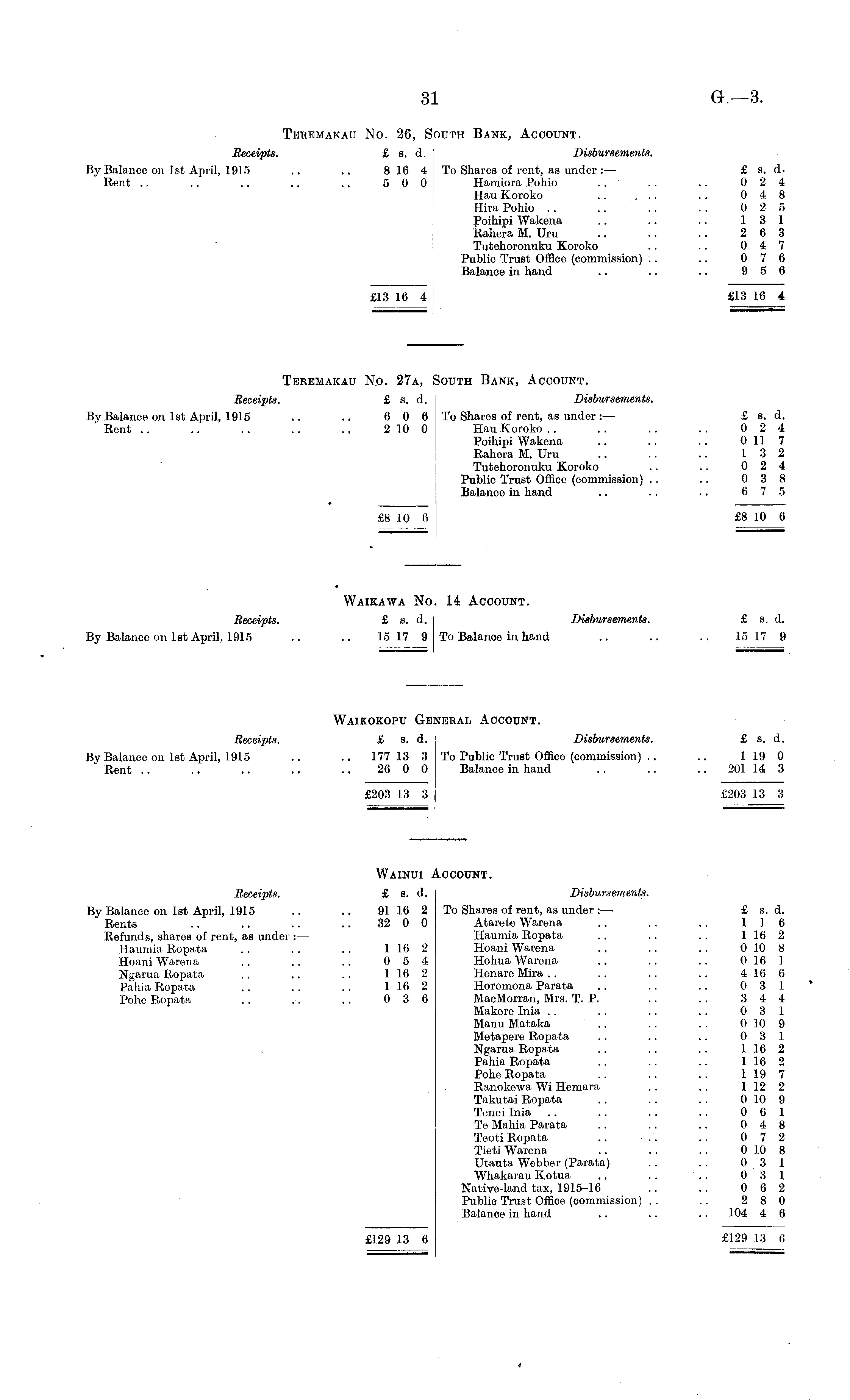 Teremakau No. 27a, South Bank, Account. Receipts. £ a. A. Disbursements. By Balance on Ist April, 1915 .. .. 6 0 6 To Shares of rent, as under: — £ s. d. Rent .. .. .. .. .. 210 0 Hau Koroko . . . . . . .. 0 2 4 Poihipi Wakena .. . . .. 011 7 Rahera M. Uru .. .. .. 13 2 Tutehoronuku Koroko .. . . 0 2 4 Public Trust Office (commission) .. .. 0 3 8 Balance in hand .. .. .. 6 7 5 £8 10 6 £8 10 6