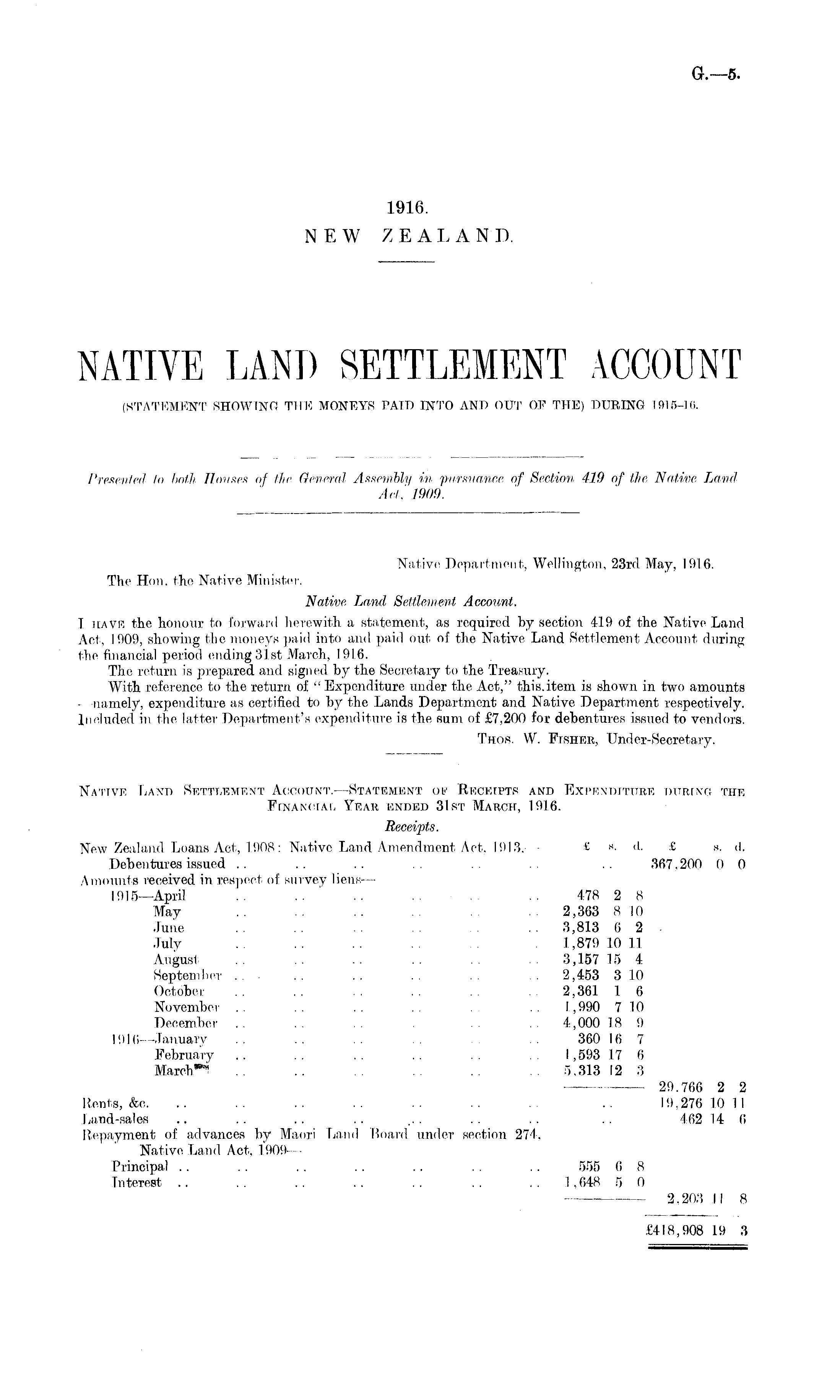 Native Department, Wellington, 23rd May, 1916. The Hon. the Native Minister. Native Land Settlement Account. I have the honour to forward herewith a statement, as required by section 419 of the Native Land Act, 1909, showing the moneys paid into and paid out of the Native Land Settlement Account during the. financial period ending 31st March, 1916. The return is prepared and signed by the Secretary to the Treasury. With reference to the return of "Expenditure under the Act," this.item is shown in two amounts - namely, expenditure as certified to by the Lands Department and Native Department respectively. Included in the latter Department's expenditure is the sum of £7,200 for debentures issued to vendors. Thos. W. Fisher, Under-Secretary. Native Land Settlement Account. —Statement of Receipts and Expenditure during the Financial Year ended 31rt March, 1916. Receipts. New Zealand Loans Act, 1908: Native Land Amendment Art, 1913. £ *. d. £ s. d. Debentures issued .. .. .. .. 367,200 0 0 Amounts received in respect of survey liens— 19115—April .. .. .. .. .. 478 2 8 May .. .. .. .. 2,363 8 10 June .. 3,813 6 2 . July .. .. 1,879 10 11 August .. .. 3,157 15 4 September ... .. . . 2,453 3 10 October .. .. .. .. 2,361 1 6 November .. .. .. .. 1,990 7 10 December .. .. .. .. .. 4,000 18 9 1916—January .. .. .. .. .. 360 16 7 February .. .. .. .. .. .. 1,593 17 6 .. .. .. 5,313 12 3 —— 29.766 2 2 Rents, &c. .. .. .. .. .. .. .. 111.276 10 11 Land-sales .. .. .. .. ... .. .. .. 462 14 6 Repayment of advances by Maori Land Board under section 274, Native Land Act, 1909— Principal .. .. .. .. .. .. .. 555 6 8 Interest .. .. .. .. .. .. 1,648 5 0 2.203 II 8 £418,908 19 8