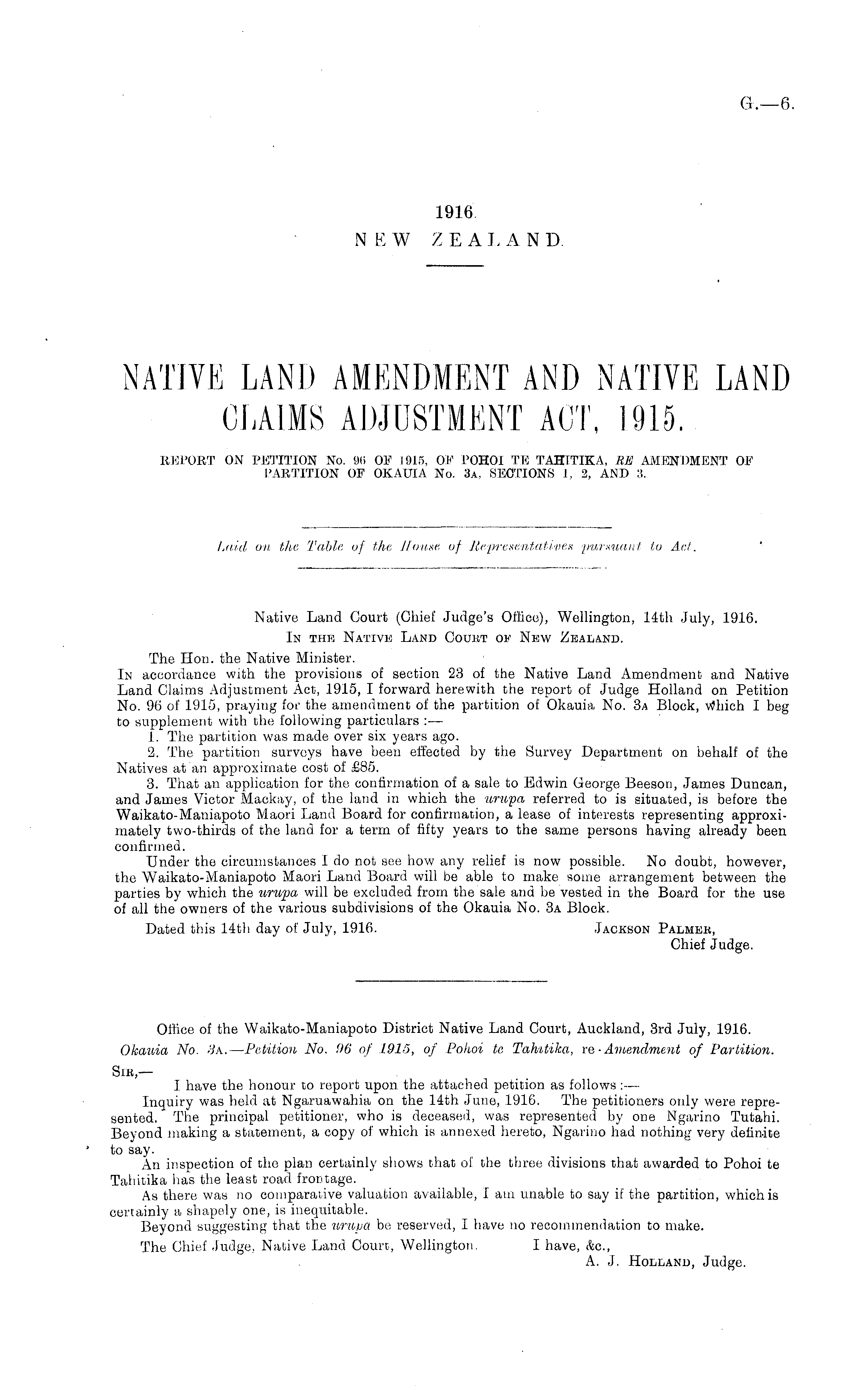 NATIVE LAND AMENDMENT AND NATIVE LAND CLAIMS ADJUSTMENT ACT, 1915. REPORT ON PETITION No. 96 OF 1915, OF POHOI TE TAHITIKA, RE AMENDMENT OF PARTITION OF OKAUIA No. 3a, SECTIONS 1, 2, AND 3.