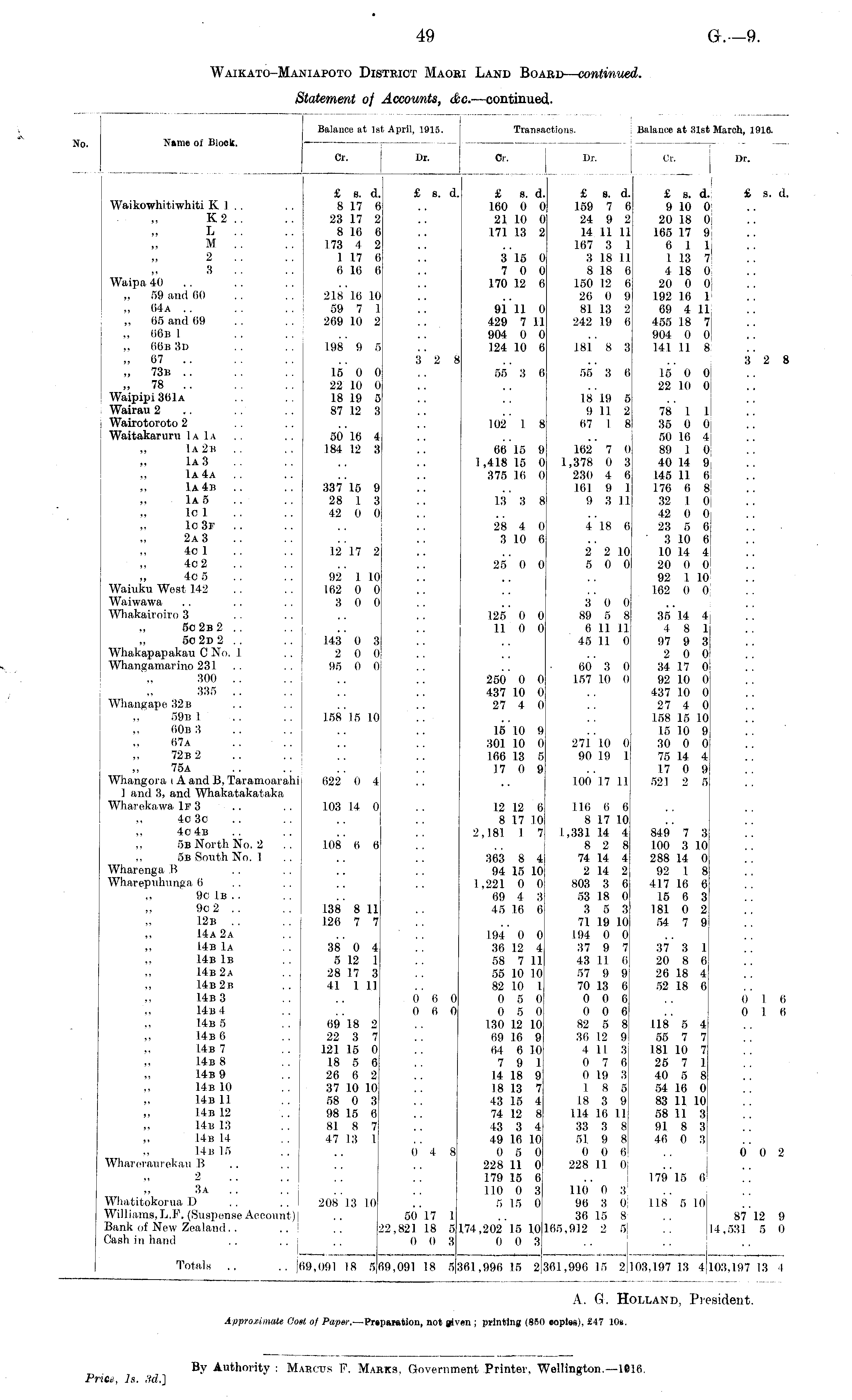 Waikato-Maniapoto District Maori Land Board— continued. Statement of Accounts, &c.— continued.