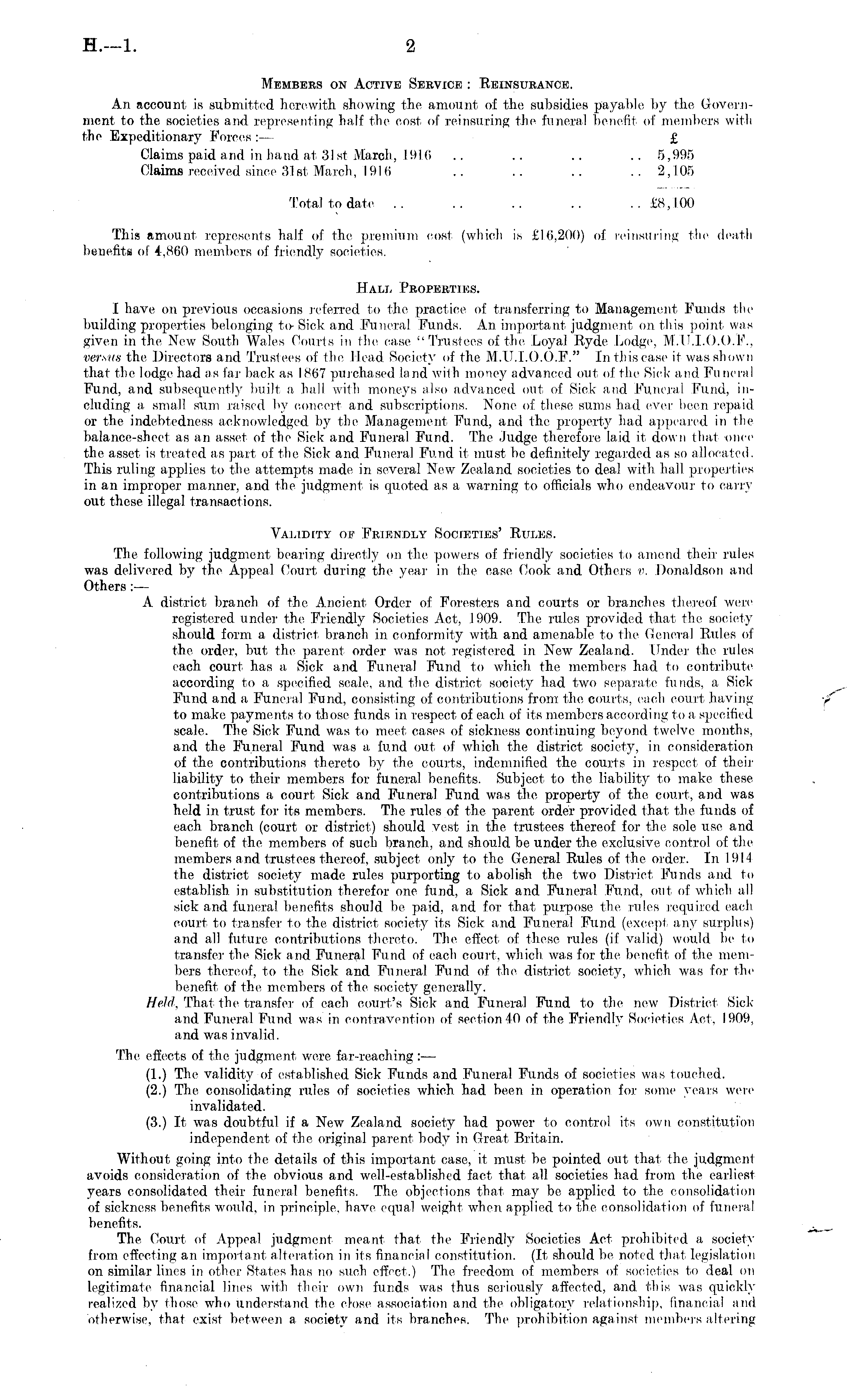 Members on Active Service : Reinsurance. An account is submitted herewith showing the amount of the subsidies payable by the Government to the societies and representing half the cost of reinsuring the funeral benefit of members with the Expeditionary Forces : — £ Claims paid and in hand at 31 st March, 1916 .. .. .. 5,995 Claims received since 31 st March, 1916 .. .. .. .. 2,105 Total to date .. .. .. .. .. £8,100 This amount represents half of the premium cost (which is £16,200) of reinsuring the death benefits of 4,860 members of friendly societies. Hall Properties. I have on previous occasions referred to the practice of transferring to Management Funds the building properties belonging to- Sick and Funeral Funds. An important judgment on this point- was given in the New South Wales Courts in tin- case "Trustees of the Loyal Ryde Lodge, M.U.1.0.0.F., versus the Directors and Trustees of the Head Society of the M.U.1.0.0.F." In this case it was shown that the lodge had as far back as 1867 purchased land with money advanced out of the Sick and Funeral Fund, and subsequently built a hull with moneys also advanced out of Sick and Funeral Fund, including a small sum raised by concert and subscriptions. None of these sums had ever been repaid or the indebtedness acknowledged by the Management Fund, and the property had appeared in the balance-sheet as an asset of the Sick and Funeral Fund. The Judge therefore laid it down that once the asset is treated as part of the Sick and Funeral Fund, it must be definitely regarded as so allocated. This ruling applies to the attempts made in several New Zealand societies to deal with hall properties in an improper manner, and the judgment is quoted as a warning to officials who endeavour to carry out these illegal transactions. Validity op Friendly Societies' Rules. The following judgment bearing directly on the powers of friendly societies to amend their rules was delivered by the Appeal Court during the year in the case Cook and Others v. Donaldson and Others :— A district branch of the Ancient Order of Foresters and courts or branches thereof wenregistered under the Friendly Societies Act, 1909. The rules provided that the society should form a district branch in conformity with and amenable to the General Rules of the order, but the parent order was not registered in New Zealand. Under the rules each court has a Sick and Funeral Fund to which, the members had to contribute according to a specified scale, and the district society had two separate funds, a SickFund and a Funeral Fund, consisting of contributions from the courts, each court having to make payments to those funds in respect of each of its members according to a specified scale. The Sick Fund was to meet cases of sickness continuing beyond twelve months, and the Funeral Fund was a fund out of which the district society, in consideration of the contributions thereto by the courts, indemnified the courts in respect of their liability to their members for funeral benefits. Subject to the liability to make these contributions a court Sick and Funeral Fund was the property of the court, and was held in trust for its members. The rules of the parent order provided that the funds of each branch (court or district) should vest in, the trustees thereof for the sole use and benefit of the members of such branch, and should be under the exclusive control of the members and trustees thereof, subject only to the General Rules of the order. In 1914 the district society made rules purporting to abolish the two District Funds and to establish, in substitution therefor one fund, a Sick and Funeral Fund, out of which all sick and funeral benefits should be paid, and for that purpose the rules required each court to transfer to the district society its Sick and Funeral Fund (except any surplus) and all future contributions thereto. The effect of these rules (if valid) would be to transfer the Sick and Funeral Fund of each court, which, was for the benefit of the members thereof, to the Sick and Funeral Fund of the district society, which was for the benefit of the members of the society generally. Held, That the transfer of each court's Sick and Funeral Fund to the new District Sick and Funeral Fund was in contravention of section 40 of the Friendly Societies Act. 1909, and was invalid. The effects of tho judgment were far-reaching : — (1.) The validity of established Sick Funds and Funeral Funds of societies was touched. (2.) The consolidating rules of societies which had been in operation for some years were invalidated. (3.) It was doubtful if a New Zealand society had power to control its own constitution independent of the original parent body in Great Britain. Without going into the details of this important case, it must be pointed out thai: the judgment avoids consideration of the obvious and well-established fact that all societies had from the earliest years consolidated their funeral benefits. The objections that may be applied, to the consolidation of sickness benefits would, in principle, have equal weight when applied to the consolidation of funeral benefits. The Court of Appeal judgment meant that the Friendly Societies Act prohibited a society from effecting an important alteration in its financial constitution. (It should be noted that legislation on similar lines in other States has no such effect.) The freedom of members of societies to deal on legitimate financial lines with their own funds was thus seriously affected, and this was quickly realized by those who understand the close association and the obligatory relationship, financial and otherwise, that exist between a society and its branches. The prohibition against members altering