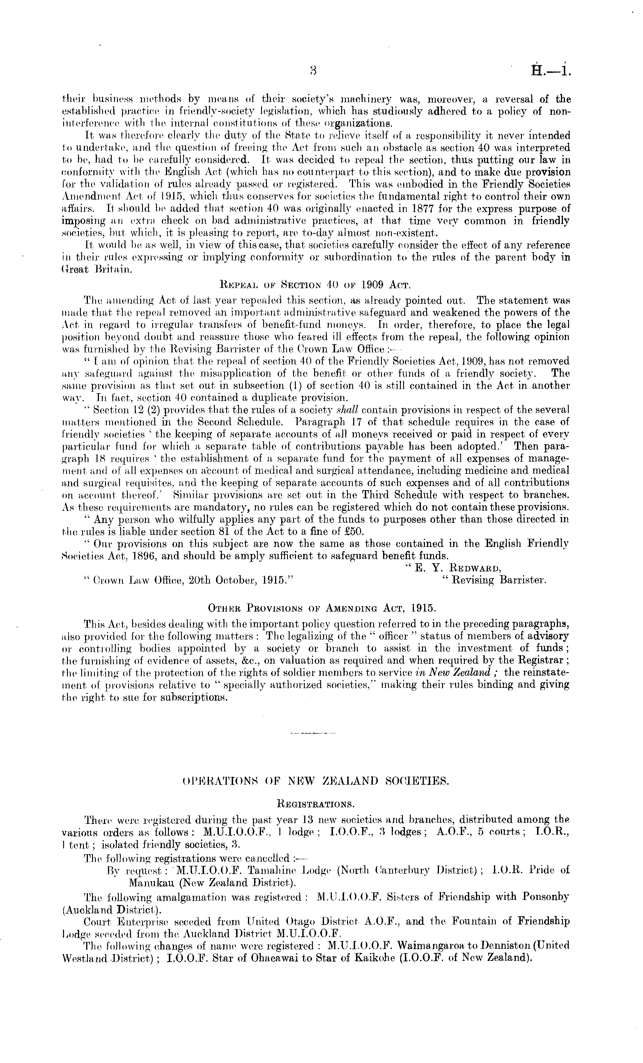 their business methods by means of their society's machinery was, moreover, a reversal of the established practice in friendly-society legislation, which has studiously adhered to a policy of noninterference with the internal constitutions of these organizations. It was therefore clearly the duty of the State to relieve itself of a responsibility it never intended to undertake, and the. question of freeing the Act from such an obstacle as section 40 was interpreted to be, had to be carefully considered. It was decided to repeal the section, thus putting our law in conformity with the English Act (which has no counterpart to this section), and to make due provision lor the validation of rules already passed or registered. This was embodied in the Friendly Societies Amendment Act of 19.15, which thus conserves for societies the fundamental right to control their own affairs. It should be added that section 40 was originally enacted in 1877 for the express purpose of imposing an extra check on bad administrative practices, at that time very common in friendly societies, but which, it is pleasing to report, are to-day almost non-existent. It would be as well, in view of this case, that societies carefully consider the effect of any reference in their rules expressing or implying conformity or subordination to the rules of the parent body in Great Britain. Repeal of Section 40 of 1909 Act. The amending Act of last year repealed this section, as already pointed out. The statement was made that the repeal removed an important administrative safeguard and weakened the powers of the Act in regard to irregular transfers of benefit-fund moneys. In order, therefore, to place the legal position beyond doubt and reassure those who feared ill effects from the repeal, the following opinion was furnished by the Revising Barrister of the Crown Law Office :— " I am of opinion that the repeal of section 40 of the Friendly Societies Act, 1909, has not removed any safeguard, against the misapplication of the benefit or other funds of a friendly society. The same provision as that set out in subsection (1) of section 40 is still contained in the Act in another way. In fact, section 40 contained a duplicate provision. " Section 12 (2) provides that the rules of a society shall contain provisions in respect of the several matters mentioned in the Second, Schedule. Paragraph 17 of that schedule! requires in the case of friendly societies ' the keeping of separate accounts of all moneys received or paid in respect of every particular fund for which a separate table of contributions payable has been adopted.' Then paragraph 18 requires ' the establishment of a separate fund for the payment of all expenses of management and of all expenses on afceount of. medical and surgical attendance, including medicine and medical and surgical requisites, and the keeping of separate accounts of such expenses and of all contributions on account thereof.' Similar provisions are set out in the Third Schedule with respect to branches. As these requirements are mandatory, no rules can be registered which do not contain these provisions. " Any person who wilfully applies any part of the funds to purposes other than those directed in the rules is liable under section 81 of the Act to a fine of £50. " Our provisions on this subject are now the same as those contained in the English Friendly Societies Act, 1896, and should be amply sufficient to safeguard benefit funds. " E. Y. Rebward, " Crown Law Office, 20th October, 1915." " Revising Barrister. Oth i<ir Provisions of Amending Act, 1915. This Act, besides dealing with the important policy question referred to in the preceding paragraphs, also provided for the following matters : The legalizing of the " officer " status of members of advisory oi- controlling bodies appointed by a society or branch to assist in the investment of funds; (he furnishing of evidence of assets, &c, on valuation as required and when required by the Registrar ; the limiting of the protection of the rights of soldier members to service in New Zealand ; the reinstatement of provisions relative to " specially authorized societies," making their rules binding and giving the right to sue for subscriptions.